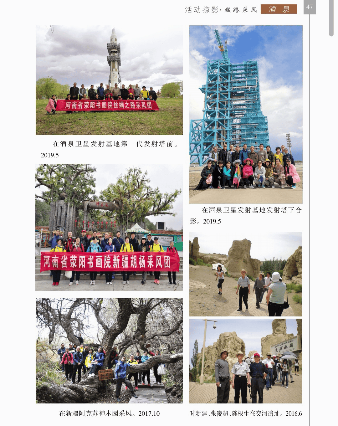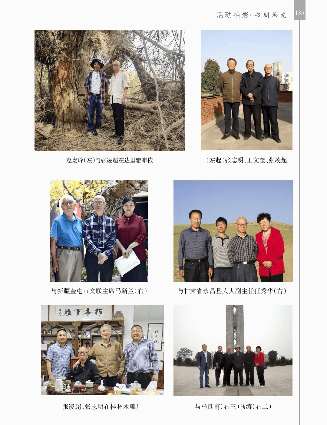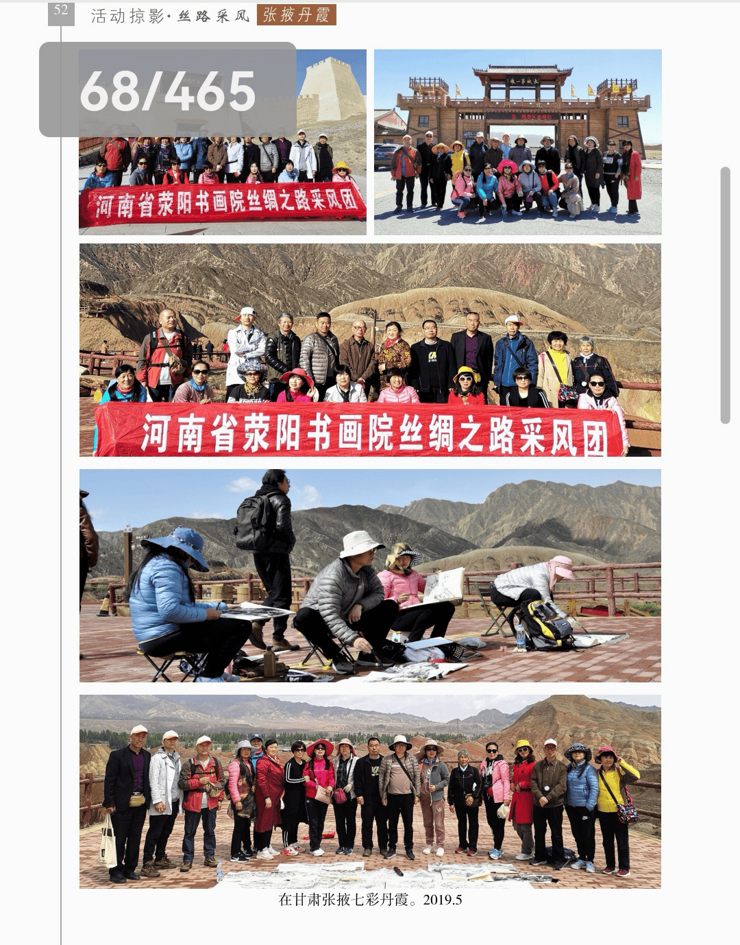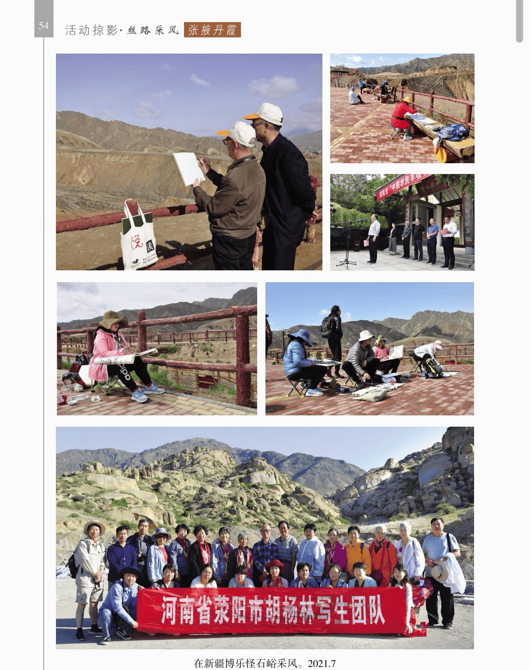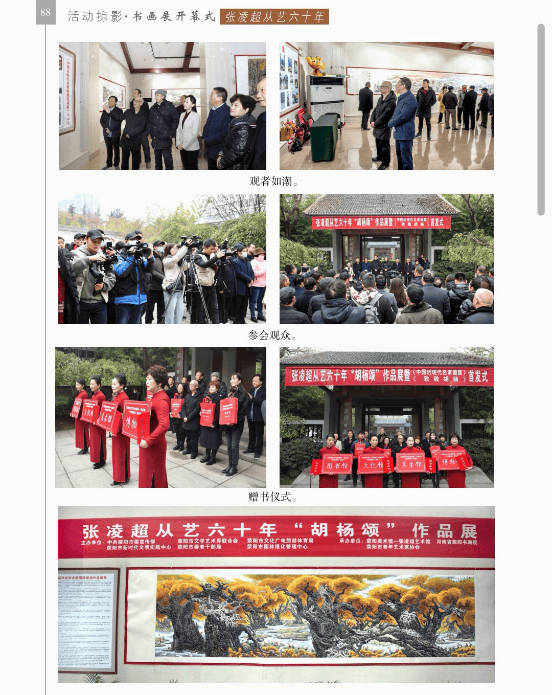 活动掠影 “活动掠影”篇章分为写生类、采风类、笔会类、展览类、研讨类等,详实记录了荥阳书画院各个时期生动的活动情况,收录各类照片近700幅,有的还特别珍贵。 写生类有:在荥阳境内写生、在太行山写生、在额济纳胡杨林、甘家湖胡杨林、轮台胡杨林、木垒胡杨林、沙雅胡杨林、淖毛湖胡杨林、罗布人村寨胡杨林写生,在昆仑山、酒泉、神木园、黄河石林、张掖丹霞地貌、敦煌等地采风, 媒体采访类有:新疆哈密、奎屯、荥阳、郑州、河南省、中央电视台等媒体采访张凌超的新闻和专题数十部。 荥阳楷模有:张凌超被授予感动荥阳人物的场景。 荥阳美术馆-张凌超艺术馆建立:一座专门为张凌超设立的县级美术馆,全国仅此一处。 书画展开幕式,选取了在荥阳、哈密、俄罗斯、桂林、奎屯、开封、胡杨河市、于田等地的书画展,大部分是胡杨题材。 交流笔会和培训研讨:选取了在桂林、北京、西安、唐山、清华园、于田等地活动的情况。 出版画集:介绍了张凌超历年来出版发行的有关国画创作和作品的书籍《张凌超山水精品选》《名家怎样画胡杨》《荣宝斋画谱(592)》《双大红袍》等40余部。 书画朋友:选取了荥阳书画院与各地的好朋友禹化兴、李艾娴、赵宏峰、马涛、张志明、魏红花、李军、耿新豫、马新兰、李新光等的活动照。