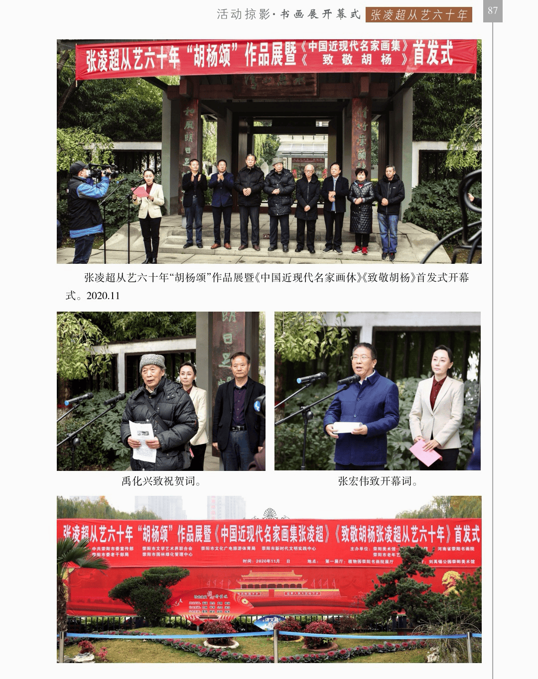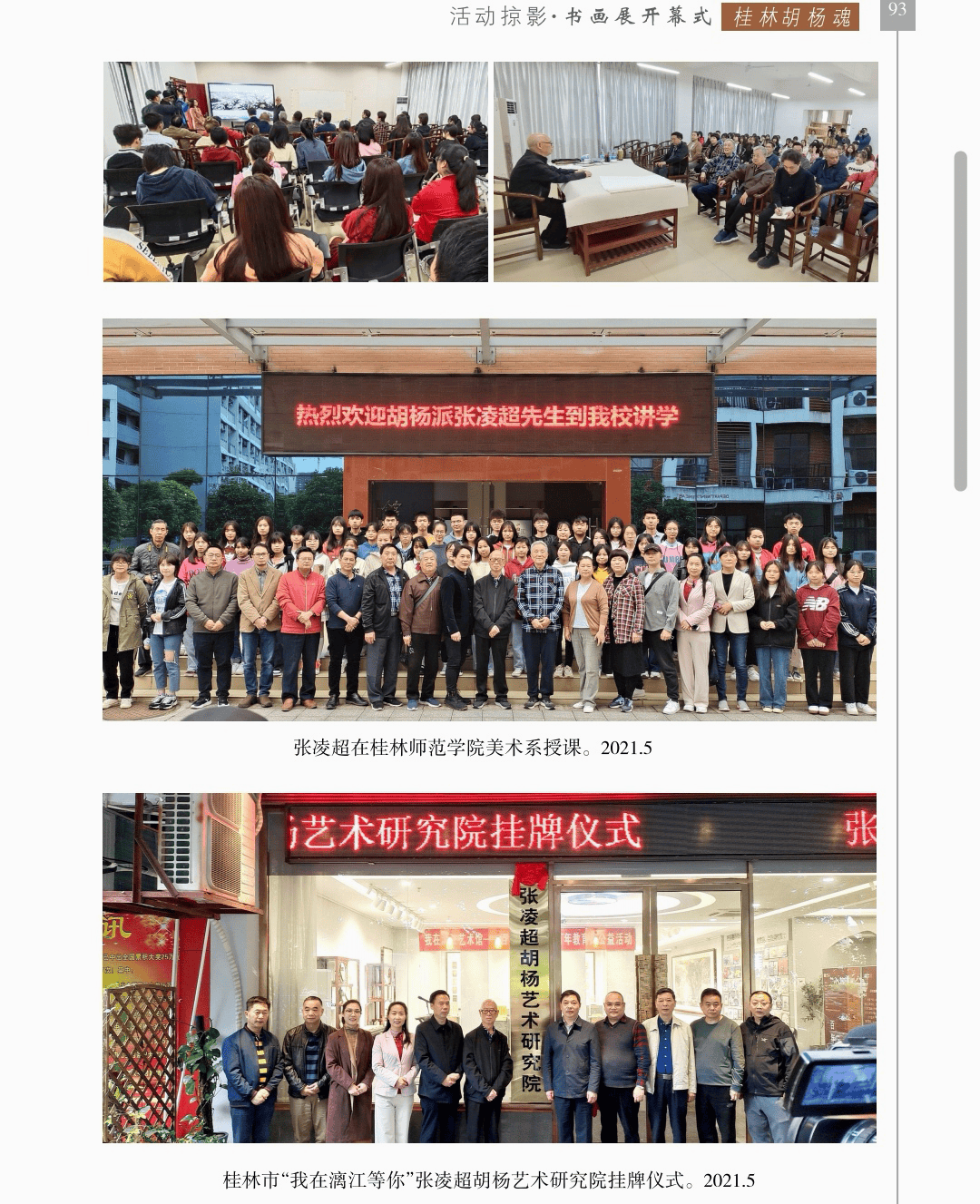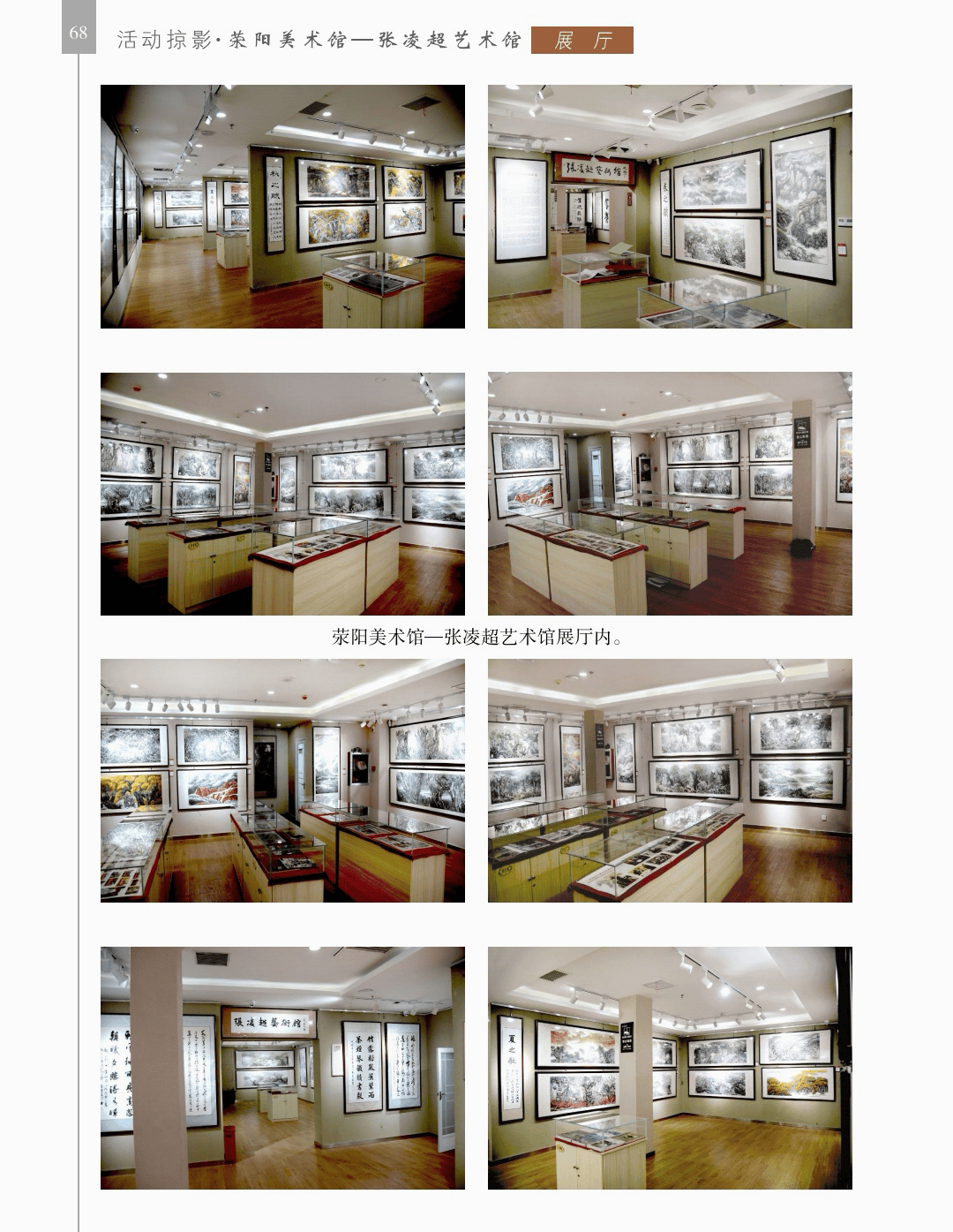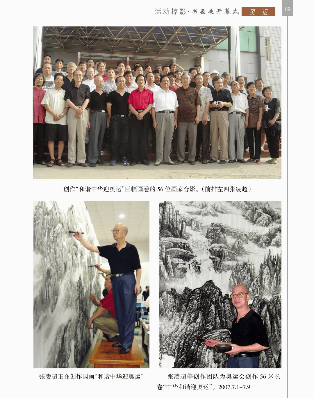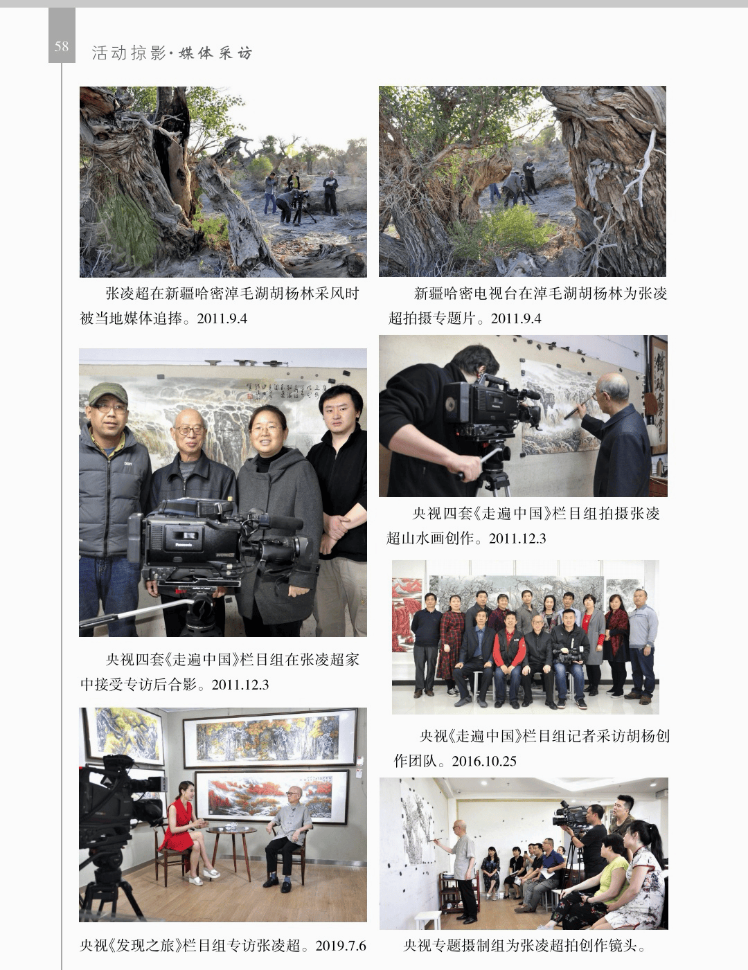 活动掠影 “活动掠影”篇章分为写生类、采风类、笔会类、展览类、研讨类等,详实记录了荥阳书画院各个时期生动的活动情况,收录各类照片近700幅,有的还特别珍贵。 写生类有:在荥阳境内写生、在太行山写生、在额济纳胡杨林、甘家湖胡杨林、轮台胡杨林、木垒胡杨林、沙雅胡杨林、淖毛湖胡杨林、罗布人村寨胡杨林写生,在昆仑山、酒泉、神木园、黄河石林、张掖丹霞地貌、敦煌等地采风, 媒体采访类有:新疆哈密、奎屯、荥阳、郑州、河南省、中央电视台等媒体采访张凌超的新闻和专题数十部。 荥阳楷模有:张凌超被授予感动荥阳人物的场景。 荥阳美术馆-张凌超艺术馆建立:一座专门为张凌超设立的县级美术馆,全国仅此一处。 书画展开幕式,选取了在荥阳、哈密、俄罗斯、桂林、奎屯、开封、胡杨河市、于田等地的书画展,大部分是胡杨题材。 交流笔会和培训研讨:选取了在桂林、北京、西安、唐山、清华园、于田等地活动的情况。 出版画集:介绍了张凌超历年来出版发行的有关国画创作和作品的书籍《张凌超山水精品选》《名家怎样画胡杨》《荣宝斋画谱(592)》《双大红袍》等40余部。 书画朋友:选取了荥阳书画院与各地的好朋友禹化兴、李艾娴、赵宏峰、马涛、张志明、魏红花、李军、耿新豫、马新兰、李新光等的活动照。