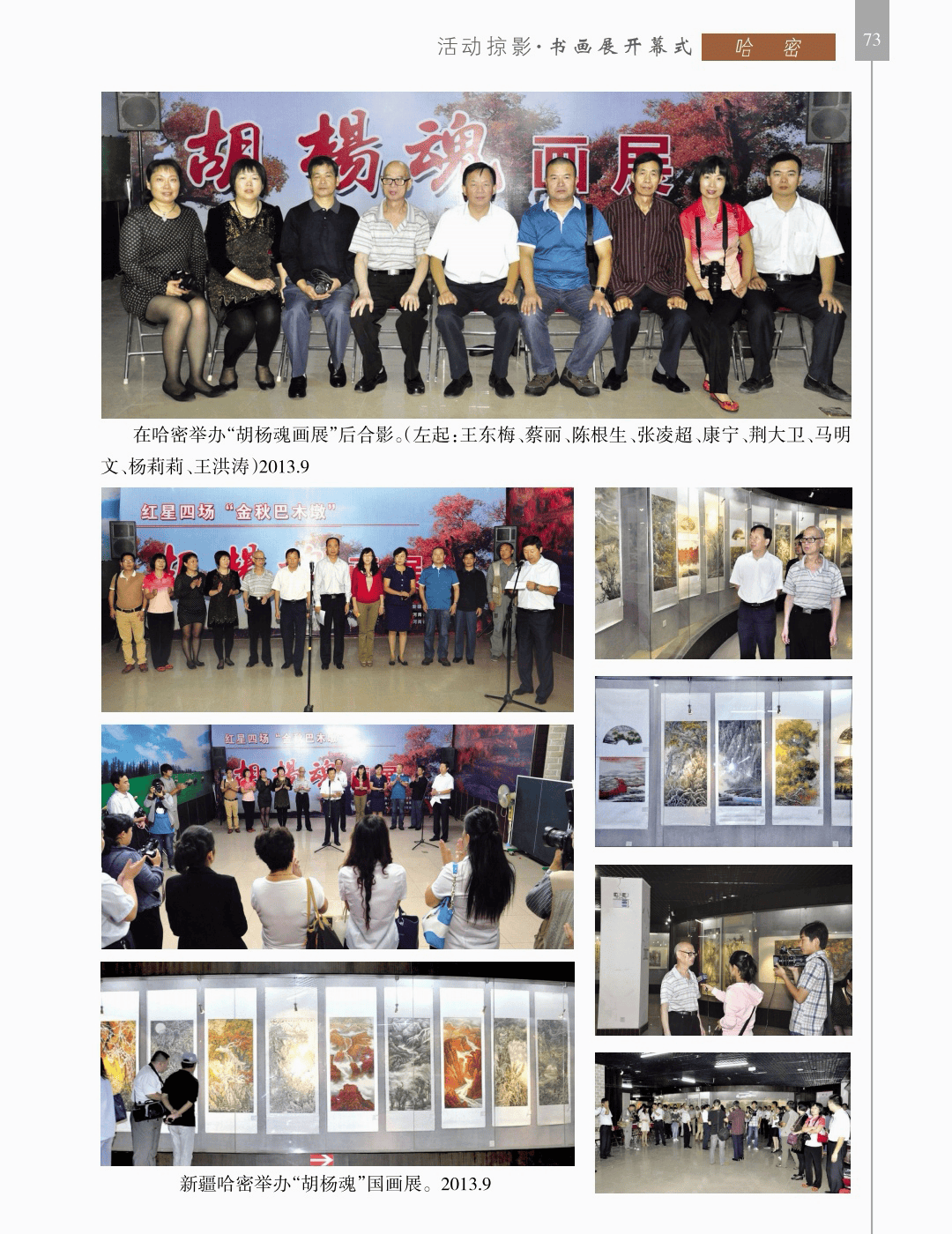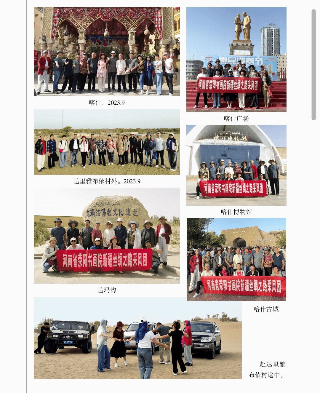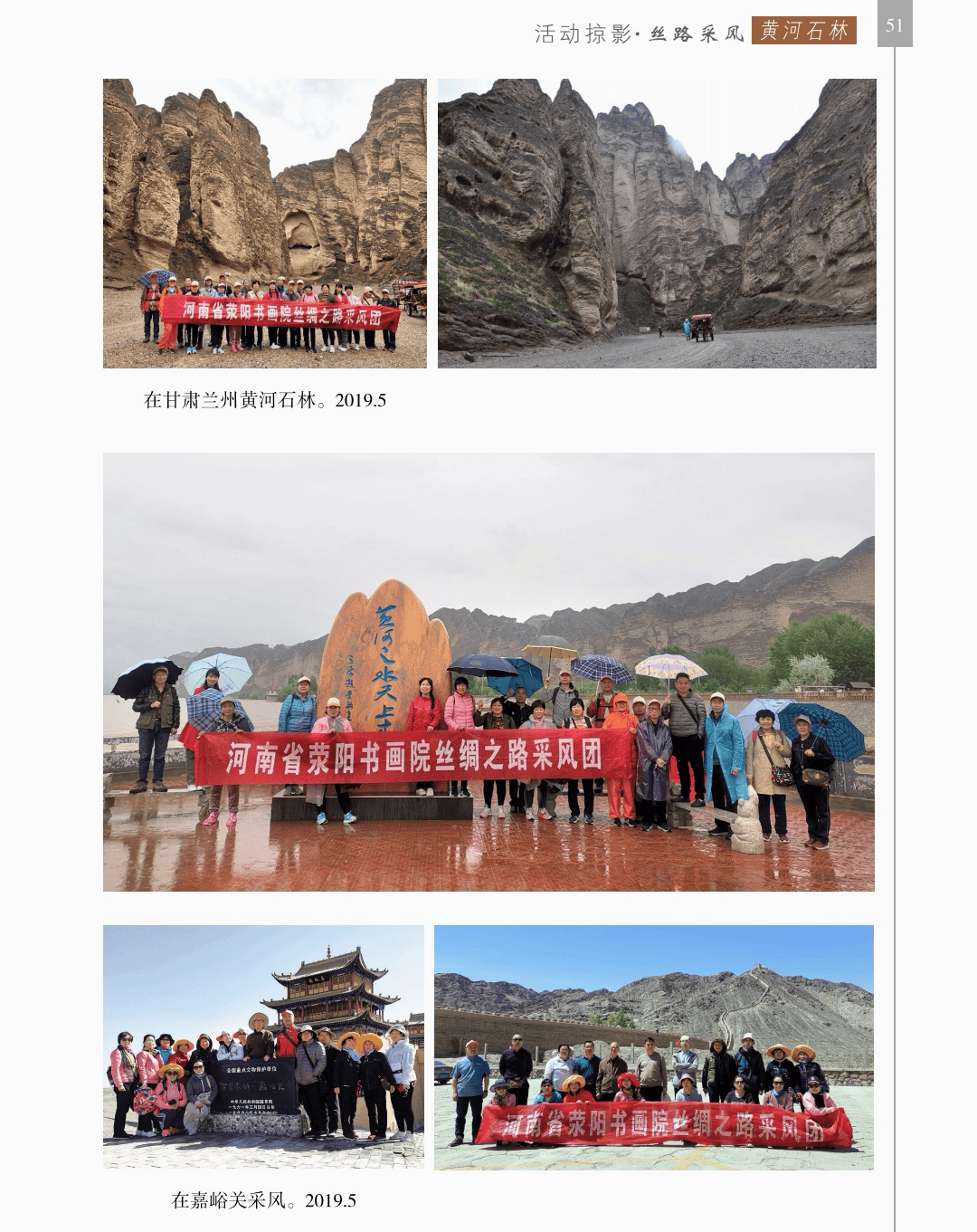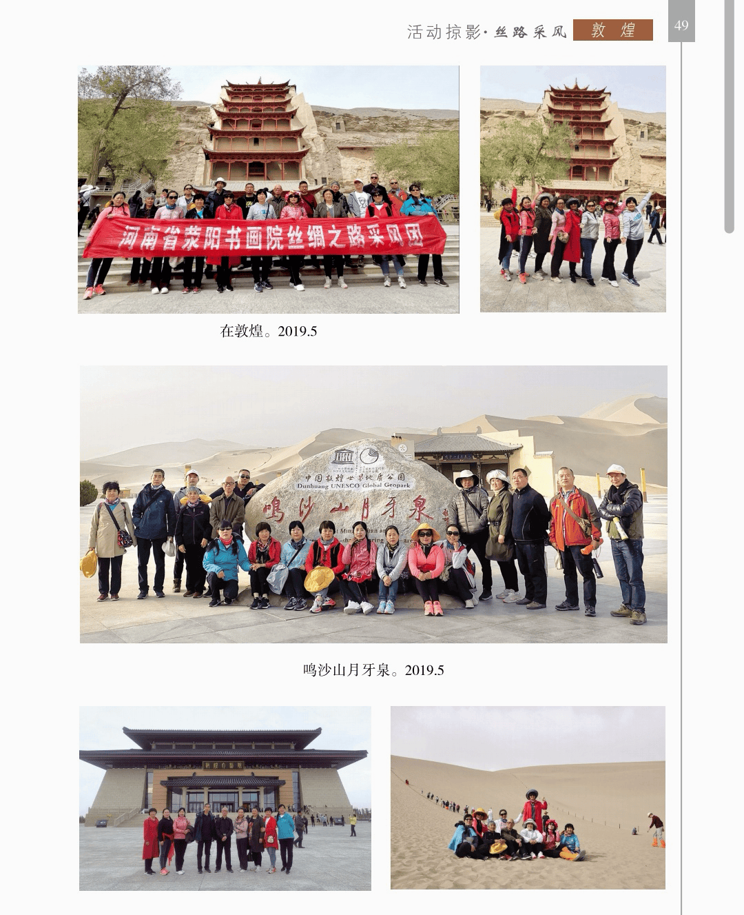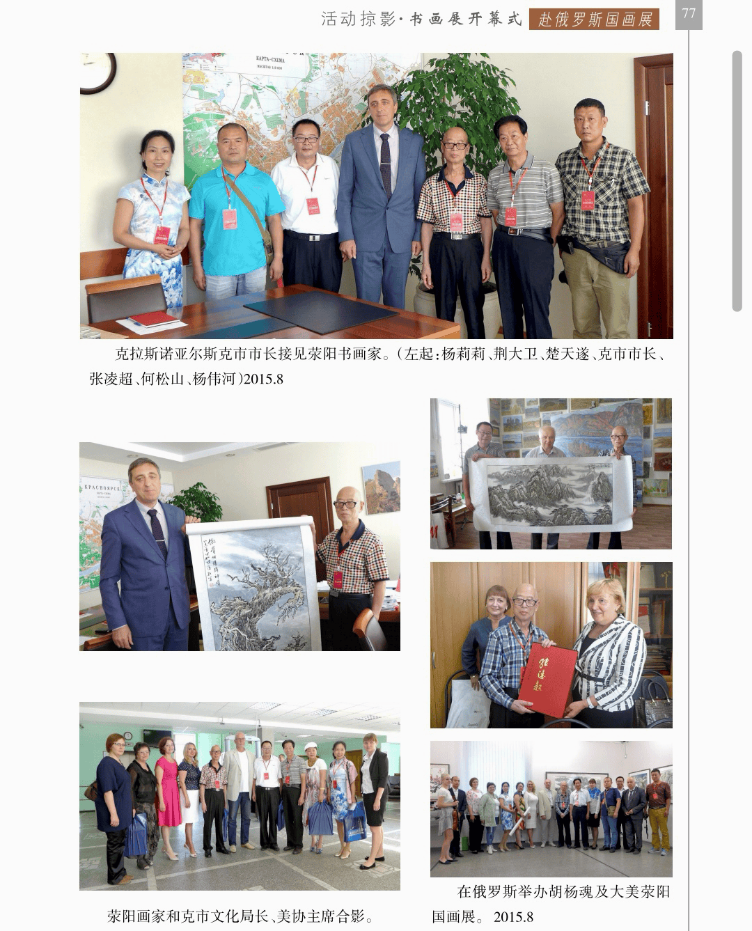 活动掠影 “活动掠影”篇章分为写生类、采风类、笔会类、展览类、研讨类等,详实记录了荥阳书画院各个时期生动的活动情况,收录各类照片近700幅,有的还特别珍贵。 写生类有:在荥阳境内写生、在太行山写生、在额济纳胡杨林、甘家湖胡杨林、轮台胡杨林、木垒胡杨林、沙雅胡杨林、淖毛湖胡杨林、罗布人村寨胡杨林写生,在昆仑山、酒泉、神木园、黄河石林、张掖丹霞地貌、敦煌等地采风, 媒体采访类有:新疆哈密、奎屯、荥阳、郑州、河南省、中央电视台等媒体采访张凌超的新闻和专题数十部。 荥阳楷模有:张凌超被授予感动荥阳人物的场景。 荥阳美术馆-张凌超艺术馆建立:一座专门为张凌超设立的县级美术馆,全国仅此一处。 书画展开幕式,选取了在荥阳、哈密、俄罗斯、桂林、奎屯、开封、胡杨河市、于田等地的书画展,大部分是胡杨题材。 交流笔会和培训研讨:选取了在桂林、北京、西安、唐山、清华园、于田等地活动的情况。 出版画集:介绍了张凌超历年来出版发行的有关国画创作和作品的书籍《张凌超山水精品选》《名家怎样画胡杨》《荣宝斋画谱(592)》《双大红袍》等40余部。 书画朋友:选取了荥阳书画院与各地的好朋友禹化兴、李艾娴、赵宏峰、马涛、张志明、魏红花、李军、耿新豫、马新兰、李新光等的活动照。