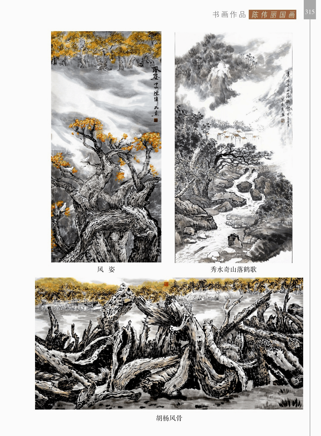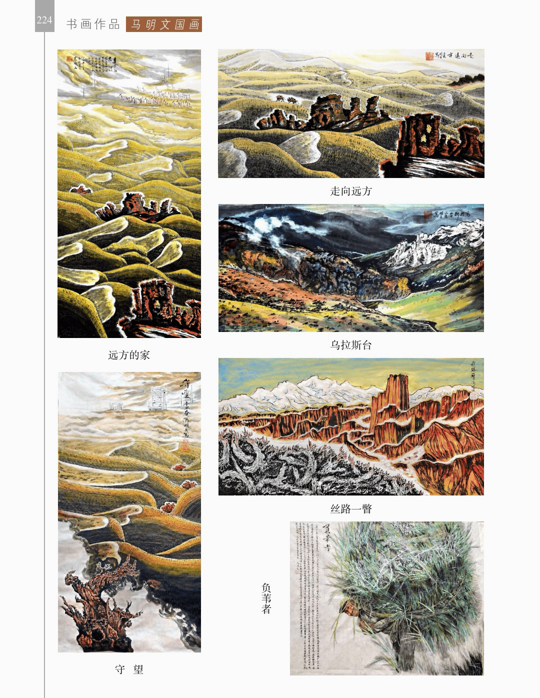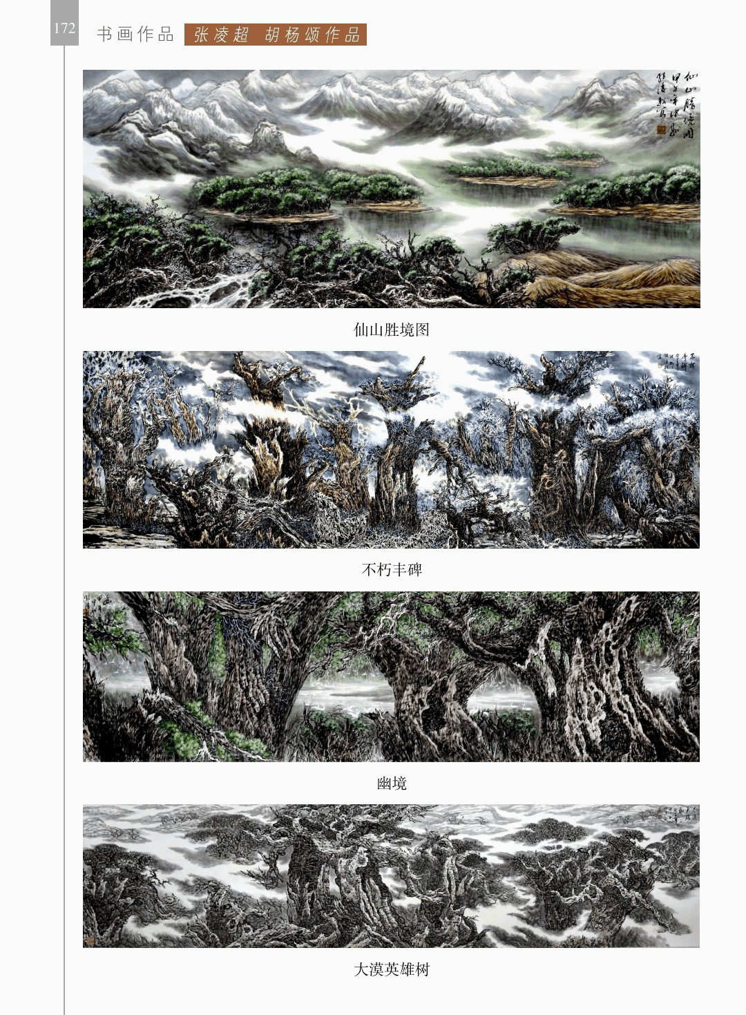风雅文集 “风雅文集”篇章收录了社会各界对荥阳书画院、对胡杨画作品赞誉的诗歌、散文、辞赋等20余篇。 其中,陈玮的诗歌“胡杨”、邢华昶的古风“张超胡杨赋”、何金良的古风“丹青妙处是精神”、李路道的好汉歌“为张凌超先生胡杨画作而吟”、沈子瑞的组诗“丝路采风”、马明文的组诗“阳关诗稿”、马涛、陈根生的“胡杨赋”、邢伟峰的现代诗“图腾——致张凌超先生”、朱根旗的“卜算子.胡杨”以及宋幻红的“荥阳书画院记”等都给人留下了难忘的印象。
