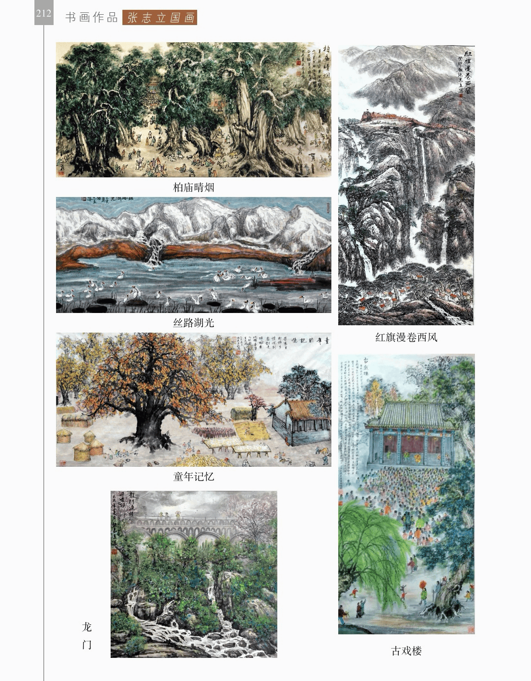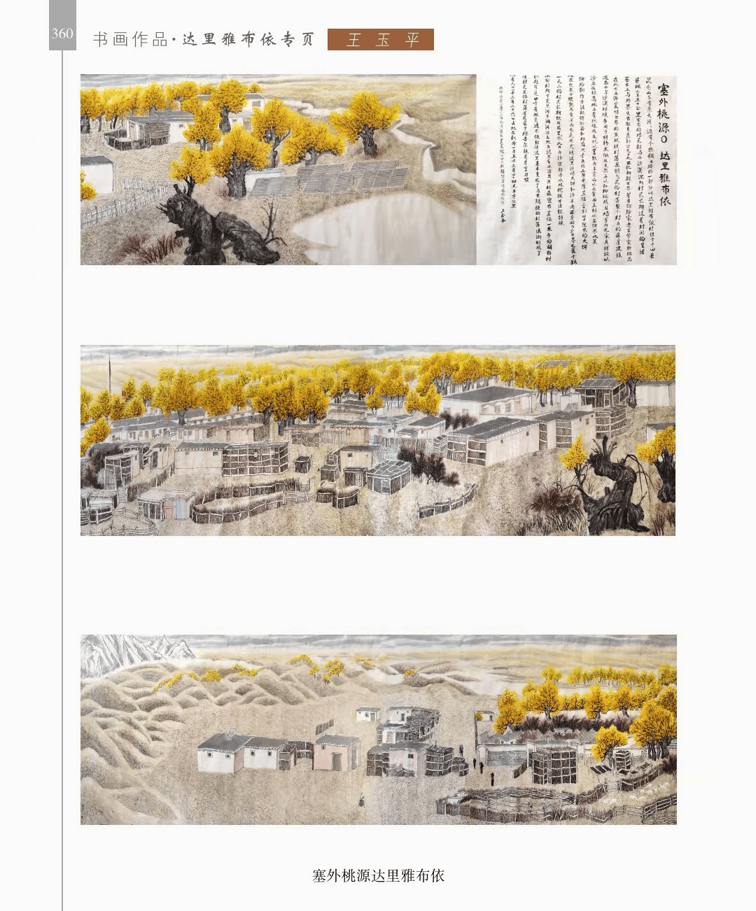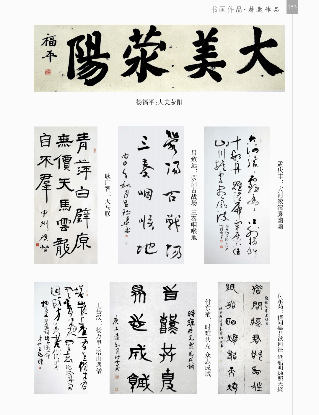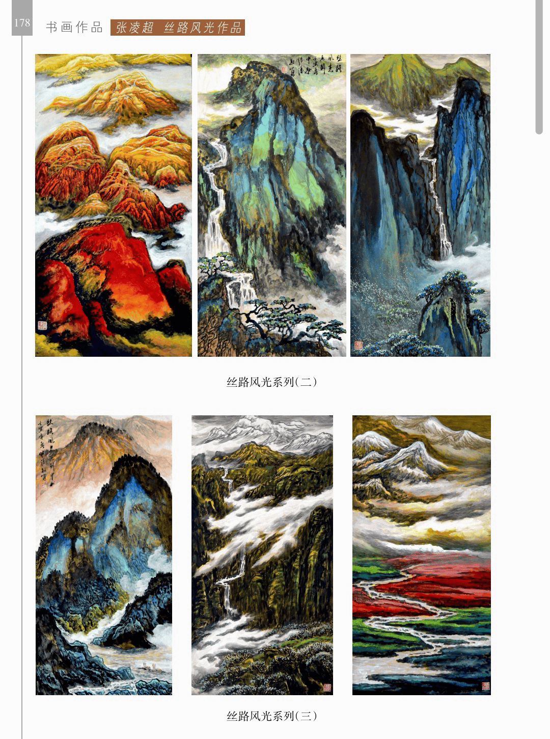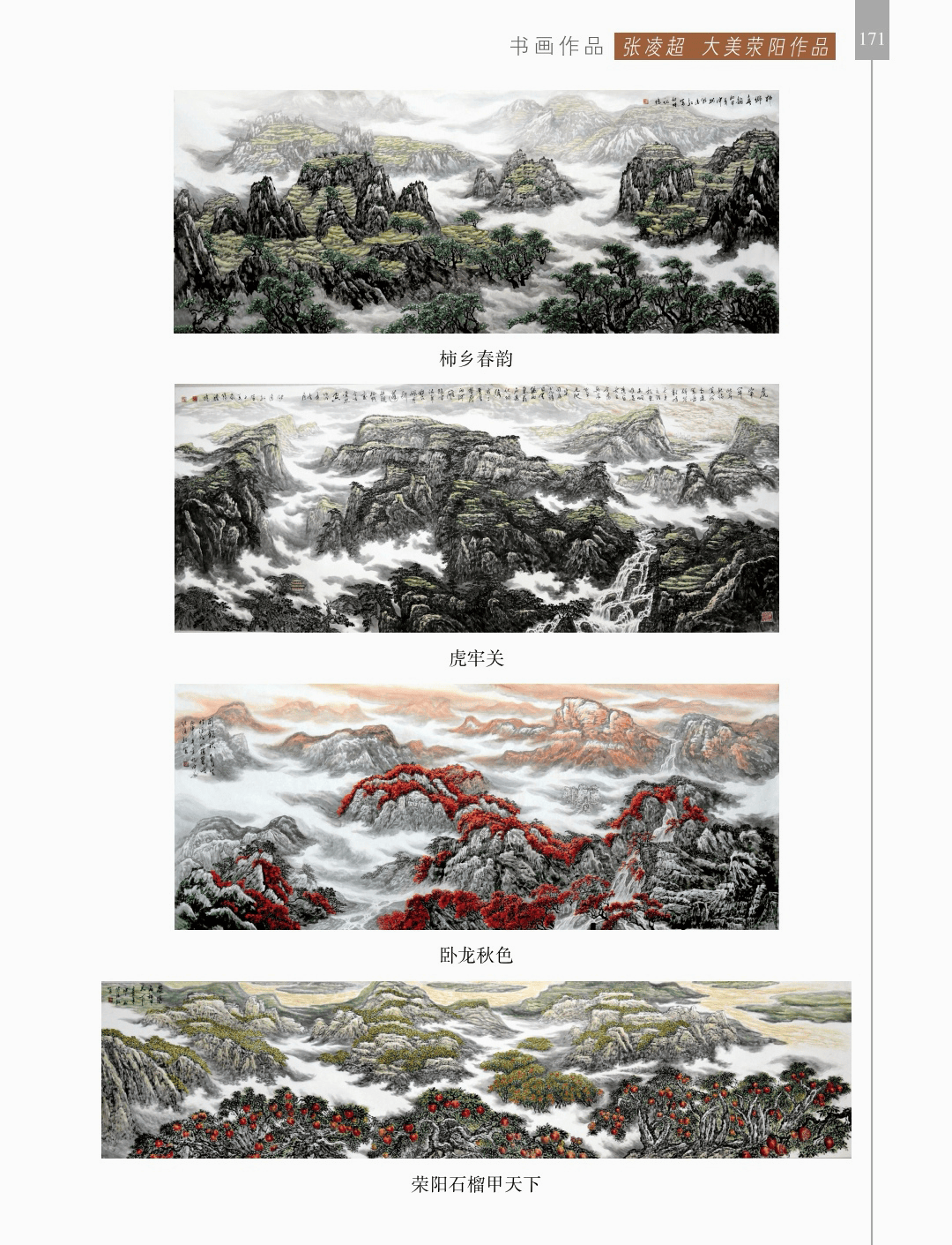 书画作品 “书画作品”篇章收录了领导、书画名家和荥阳书画院各次展览的书画作品1200幅(件),其中,描绘荥阳大美山河的长卷14幅,描绘沙海原始部落村达里雅布依的长卷11幅。 书法家张海、画家陈天然、书法家李刚田、画家禹化兴、书法家海丙离、画家马顺先、连俊洲、李艾娴、书法家刘秋梅、画家吴宝贵、书法家董江源、韦庆华等人的作品。 荥阳书画院先驱王文奎、闫松波、申震黎、张子仁、李子青、冯宗廉、王景新、时新建等人的作品。 在书画作品中,有马连水的隶书,有荥阳书画院院长张凌超的大美荥阳作品、胡杨颂作品、丝路风光作品,有书法家聂国强的作品,有画家王德安的山水作品,有李智臣的花鸟作品,有张志明的人物作品,有何松山的荷花作品,有张志立的胡杨作品,有陈根生的山水作品,有马明文的胡杨作品,有王志高的国画作品,有王玉平的丝路风光作品,有焦振亮的仿古山水,有李福明的书法,有史德亮的篆书,有蔡丽的牡丹,有王冬梅的胡杨与山水,有荆大卫的山水,有杨伟河的水粉、油画和素描,有杨莉莉的梅花与山水,有崔向前的书法,有沈子瑞的人物与胡杨,有陈赛飞的国画与篆刻,有王玮的书法,有李莉的胡杨与山水,有冯延亭的书法,有王少武的书法,有陈伟丽的胡杨,有宋伟涛和李晓敏的书法等。 描绘荥阳大美山河的长卷有《胡杨礼赞》《索河明珠》《风云广武山》《汜水通河》《美丽乡村》《禹锡园》《植物园》《象棋公园》《李商隐公园》《环翠峪四季》和《古汜水十景》。 描绘塔克拉玛干沙漠腹地原始部落村达里雅布依长卷的有张凌超、蔡丽、李智臣、李莉、王玉平、威威、吴宝贵、张志立、马明文、杨莉莉和陈根生。