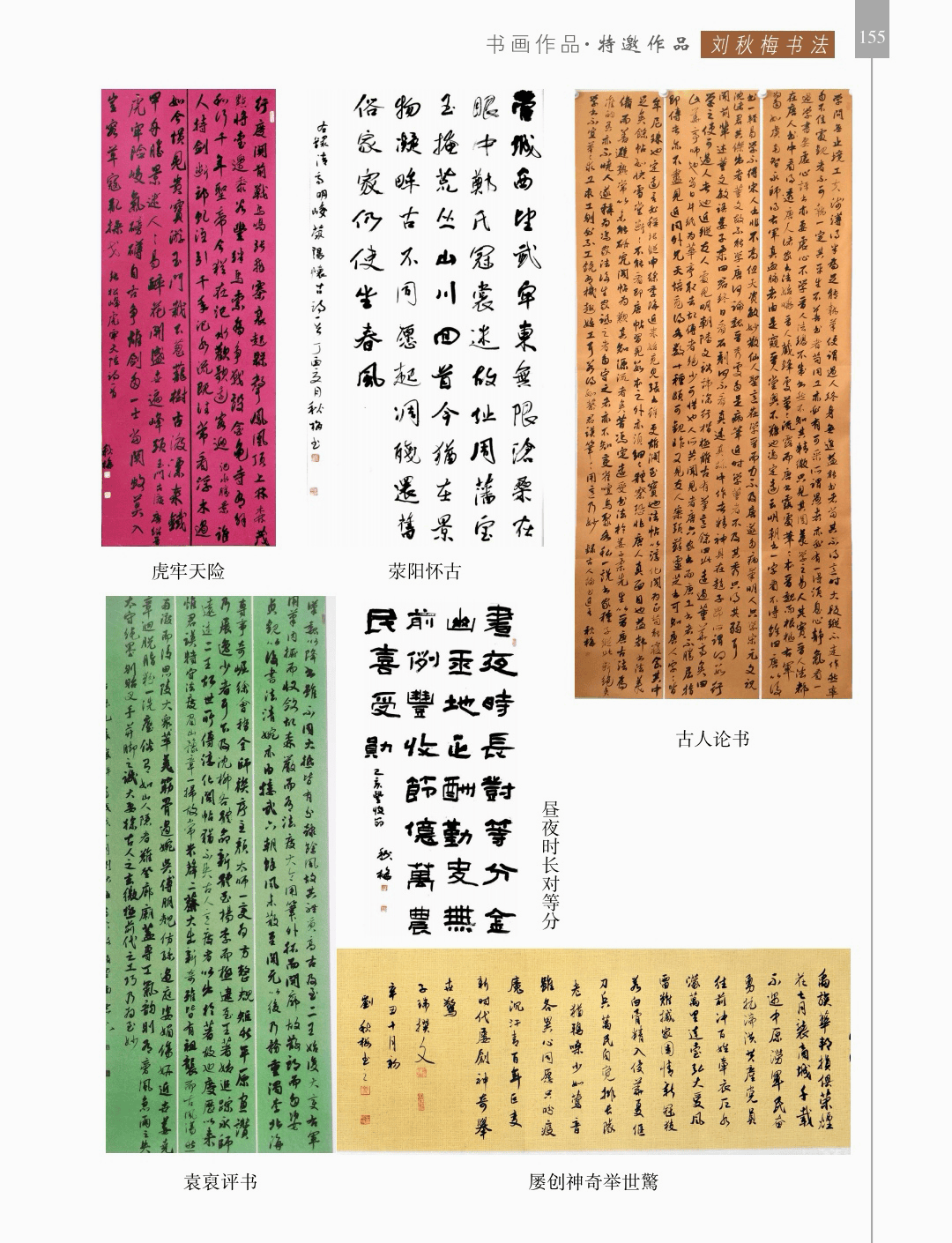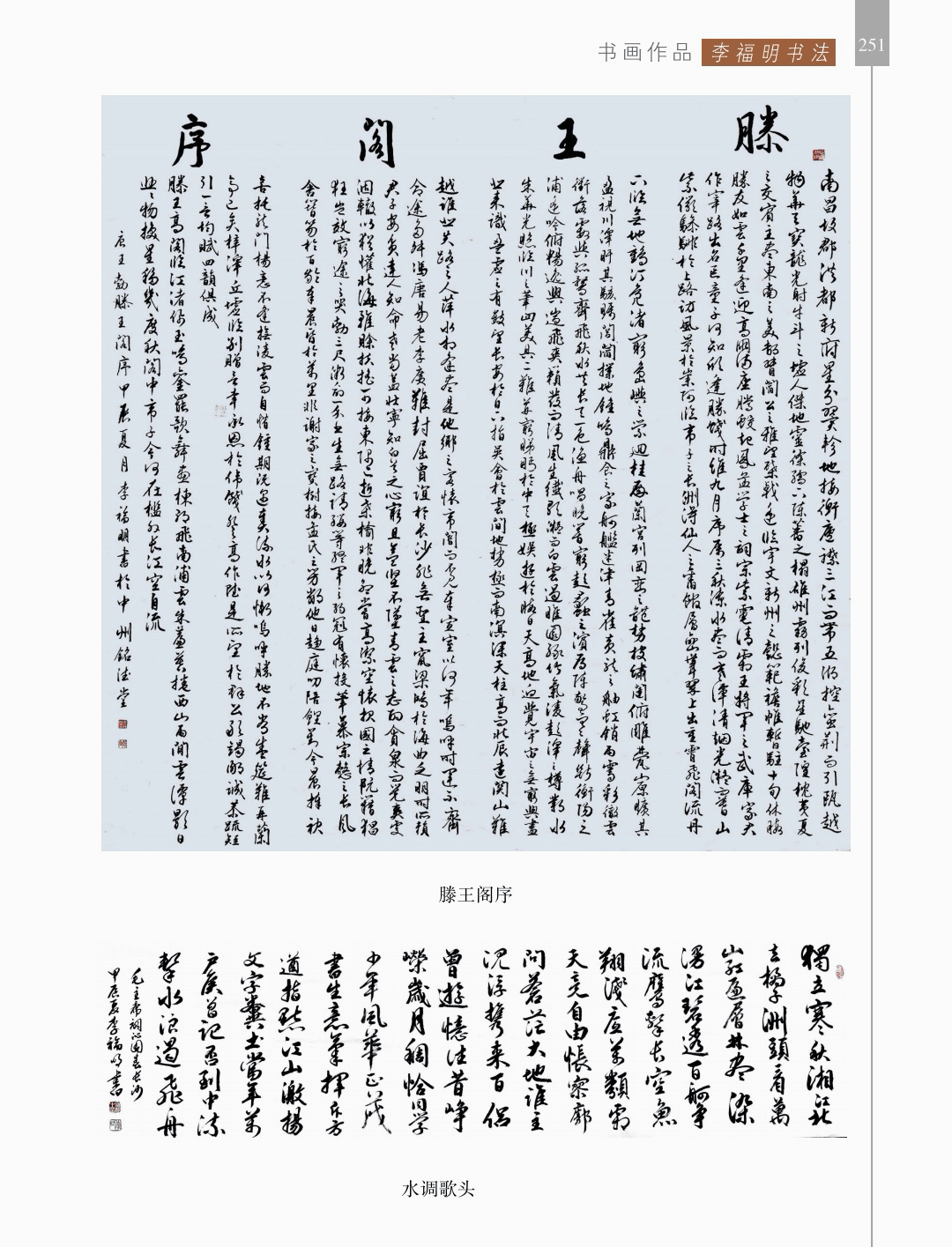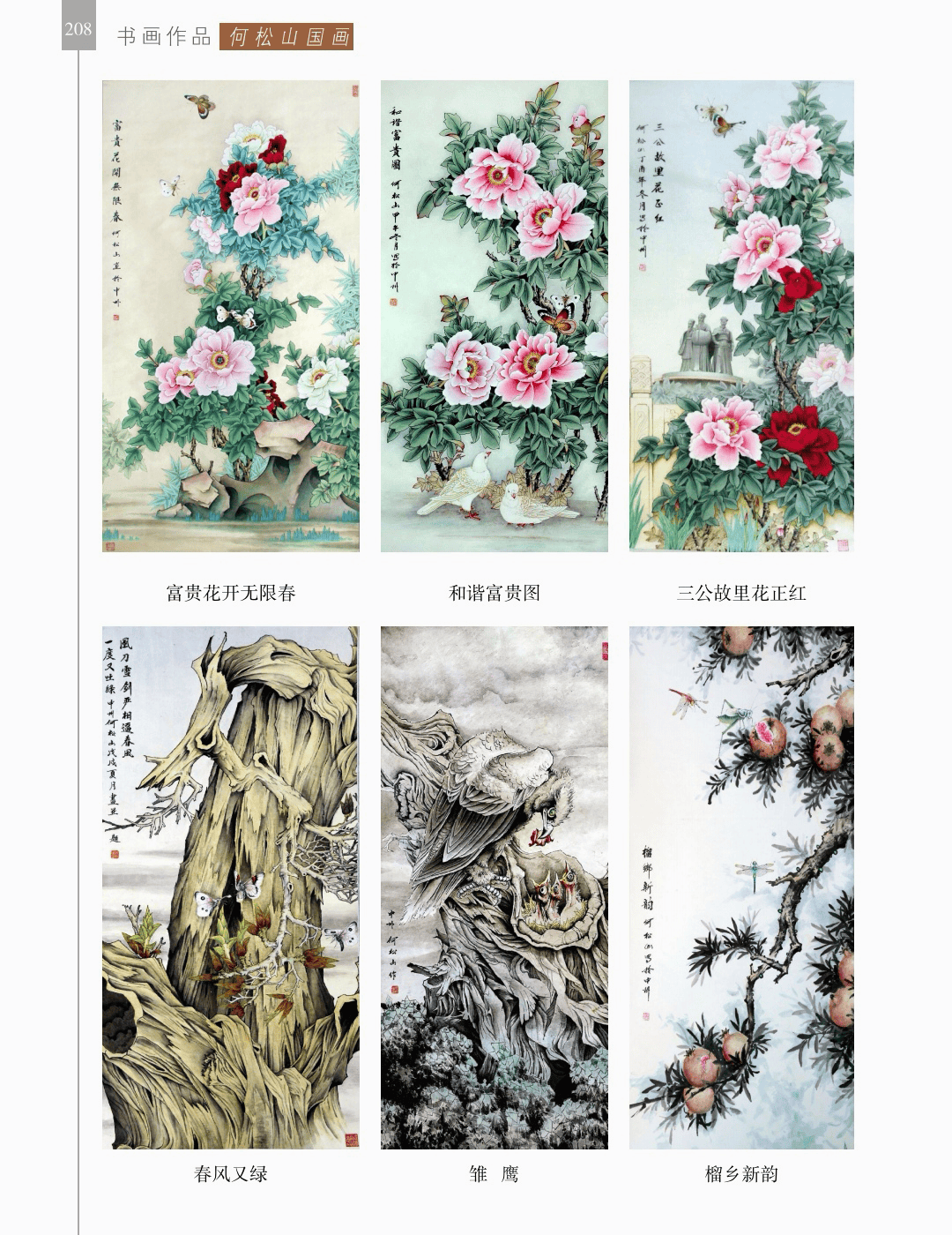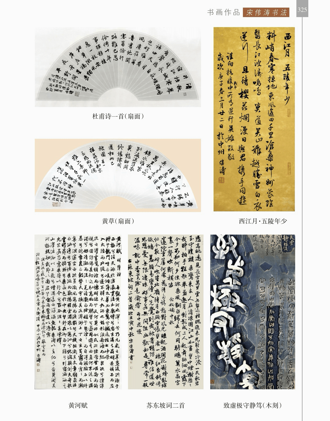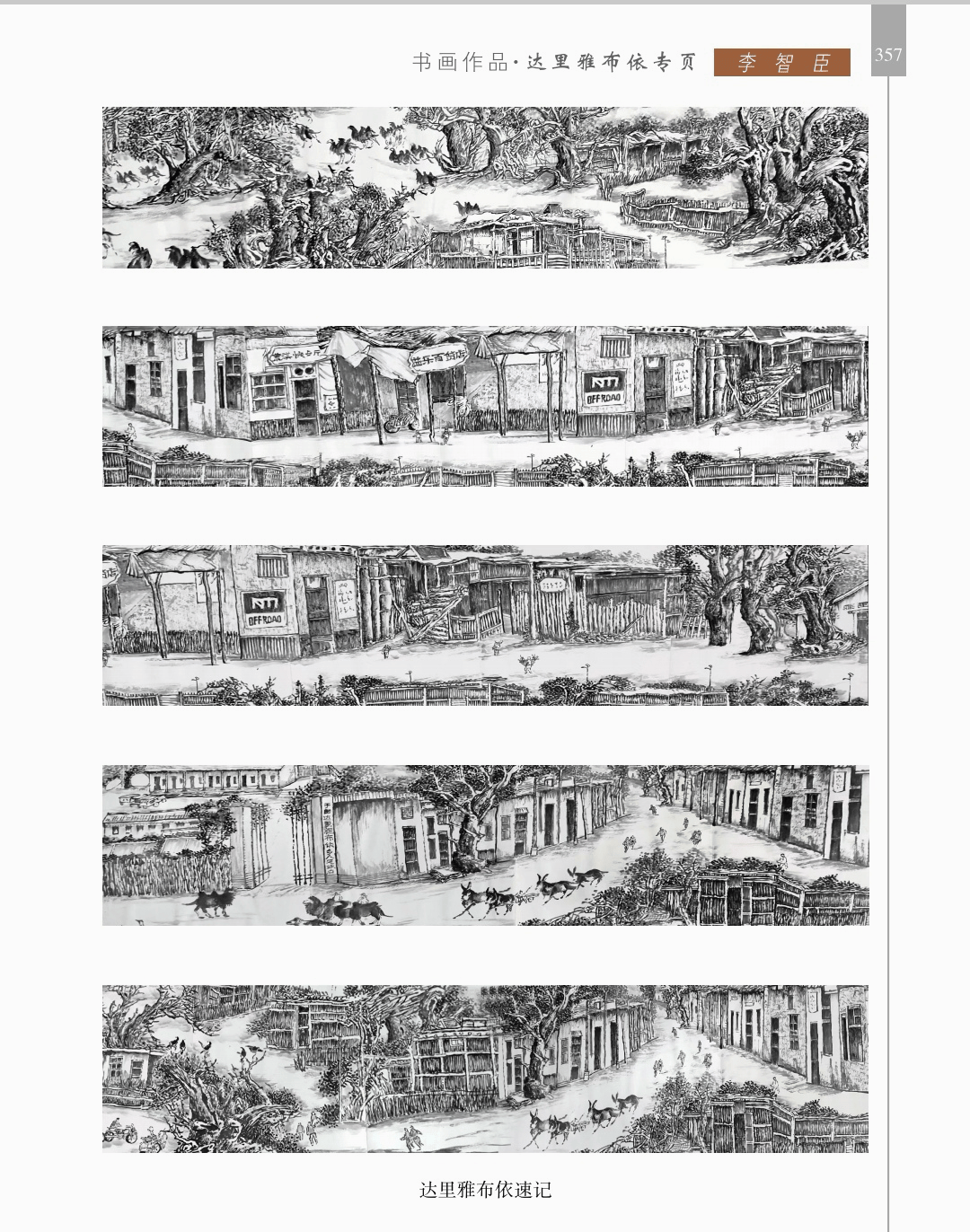 书画作品 “书画作品”篇章收录了领导、书画名家和荥阳书画院各次展览的书画作品1200幅(件),其中,描绘荥阳大美山河的长卷14幅,描绘沙海原始部落村达里雅布依的长卷11幅。 书法家张海、画家陈天然、书法家李刚田、画家禹化兴、书法家海丙离、画家马顺先、连俊洲、李艾娴、书法家刘秋梅、画家吴宝贵、书法家董江源、韦庆华等人的作品。 荥阳书画院先驱王文奎、闫松波、申震黎、张子仁、李子青、冯宗廉、王景新、时新建等人的作品。 在书画作品中,有马连水的隶书,有荥阳书画院院长张凌超的大美荥阳作品、胡杨颂作品、丝路风光作品,有书法家聂国强的作品,有画家王德安的山水作品,有李智臣的花鸟作品,有张志明的人物作品,有何松山的荷花作品,有张志立的胡杨作品,有陈根生的山水作品,有马明文的胡杨作品,有王志高的国画作品,有王玉平的丝路风光作品,有焦振亮的仿古山水,有李福明的书法,有史德亮的篆书,有蔡丽的牡丹,有王冬梅的胡杨与山水,有荆大卫的山水,有杨伟河的水粉、油画和素描,有杨莉莉的梅花与山水,有崔向前的书法,有沈子瑞的人物与胡杨,有陈赛飞的国画与篆刻,有王玮的书法,有李莉的胡杨与山水,有冯延亭的书法,有王少武的书法,有陈伟丽的胡杨,有宋伟涛和李晓敏的书法等。 描绘荥阳大美山河的长卷有《胡杨礼赞》《索河明珠》《风云广武山》《汜水通河》《美丽乡村》《禹锡园》《植物园》《象棋公园》《李商隐公园》《环翠峪四季》和《古汜水十景》。 描绘塔克拉玛干沙漠腹地原始部落村达里雅布依长卷的有张凌超、蔡丽、李智臣、李莉、王玉平、威威、吴宝贵、张志立、马明文、杨莉莉和陈根生。