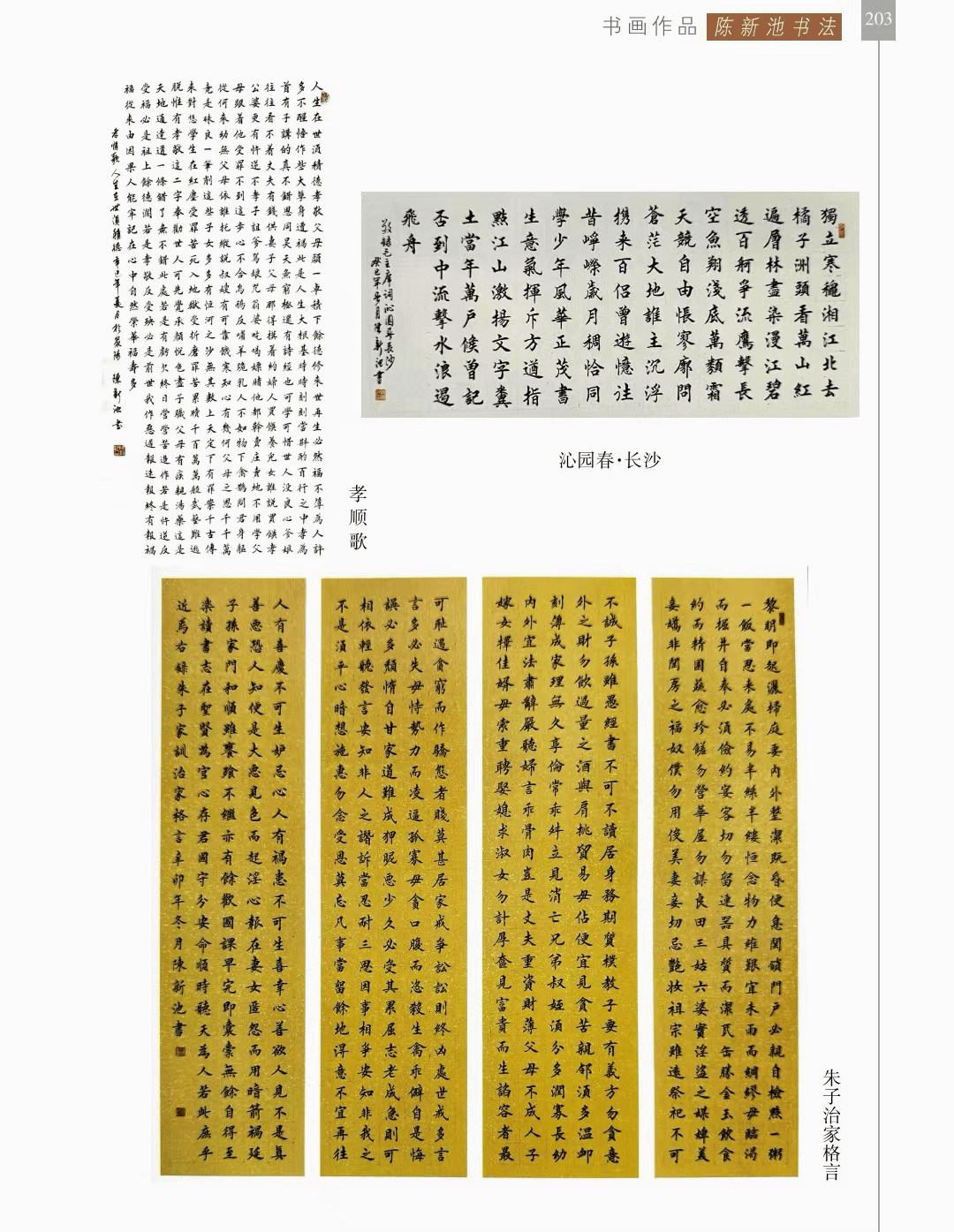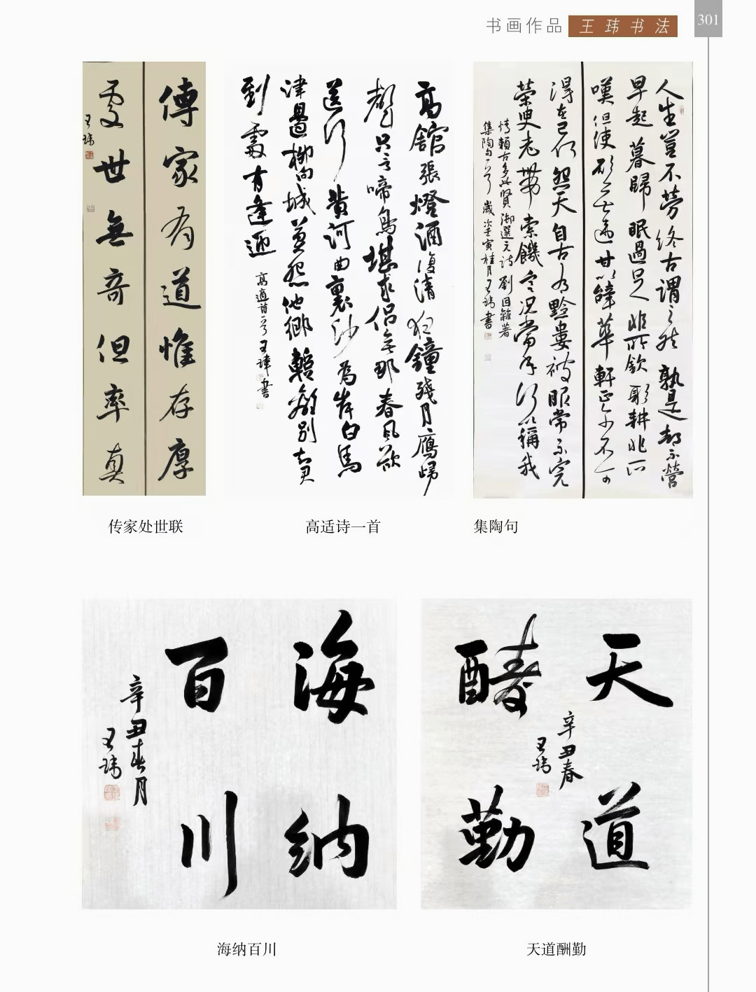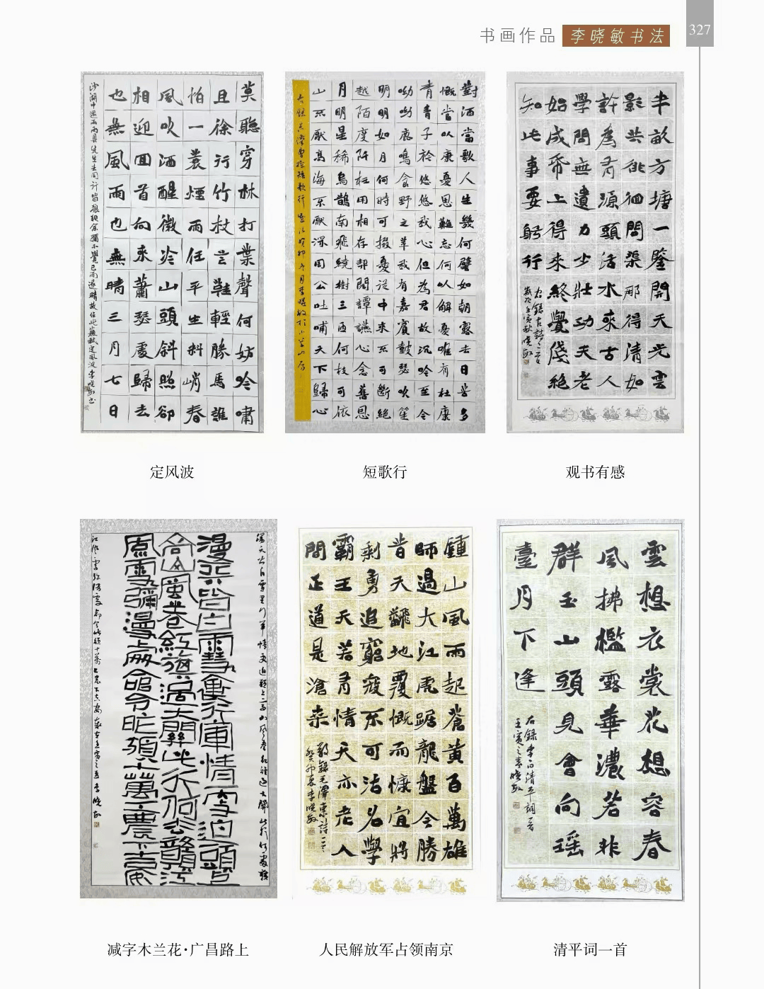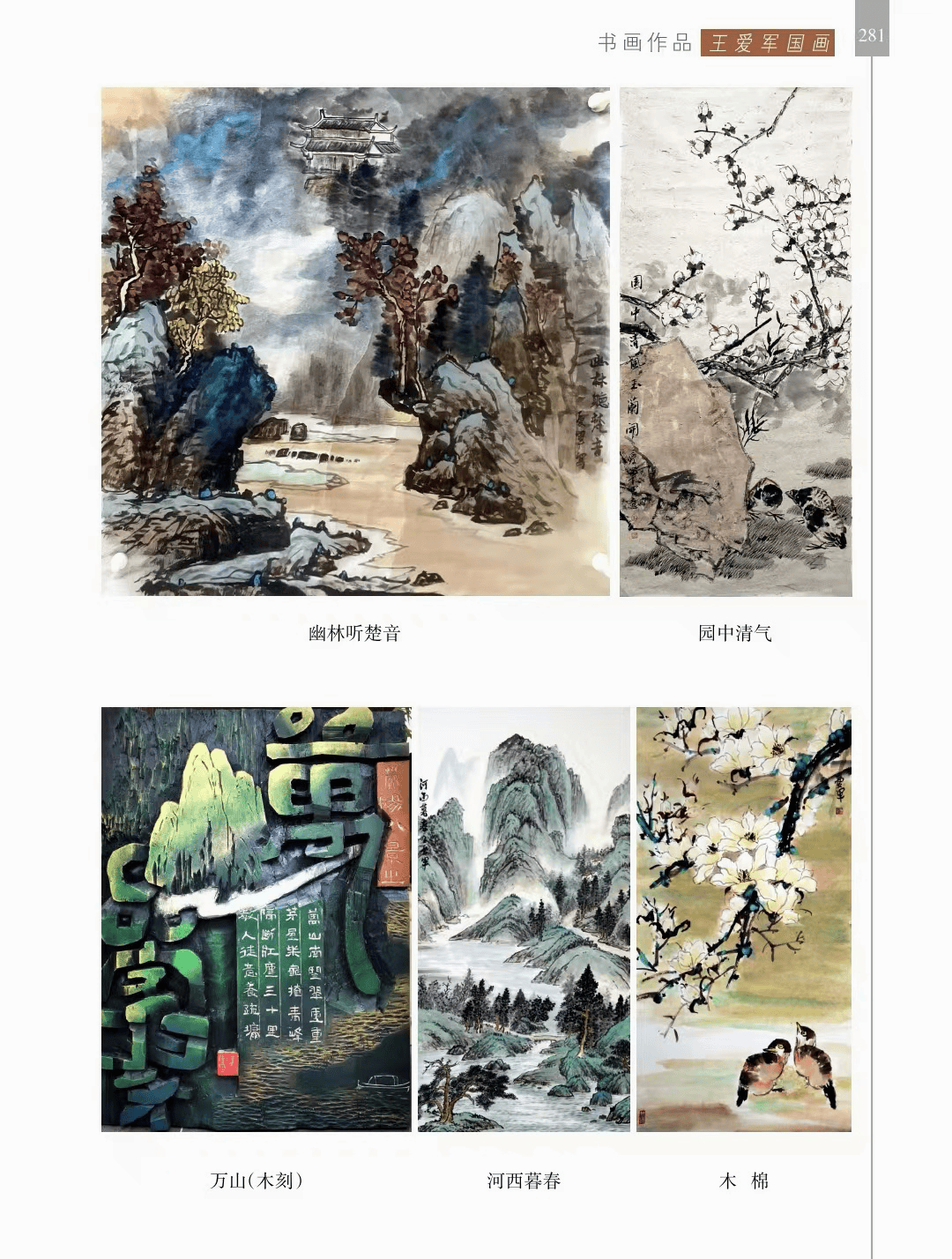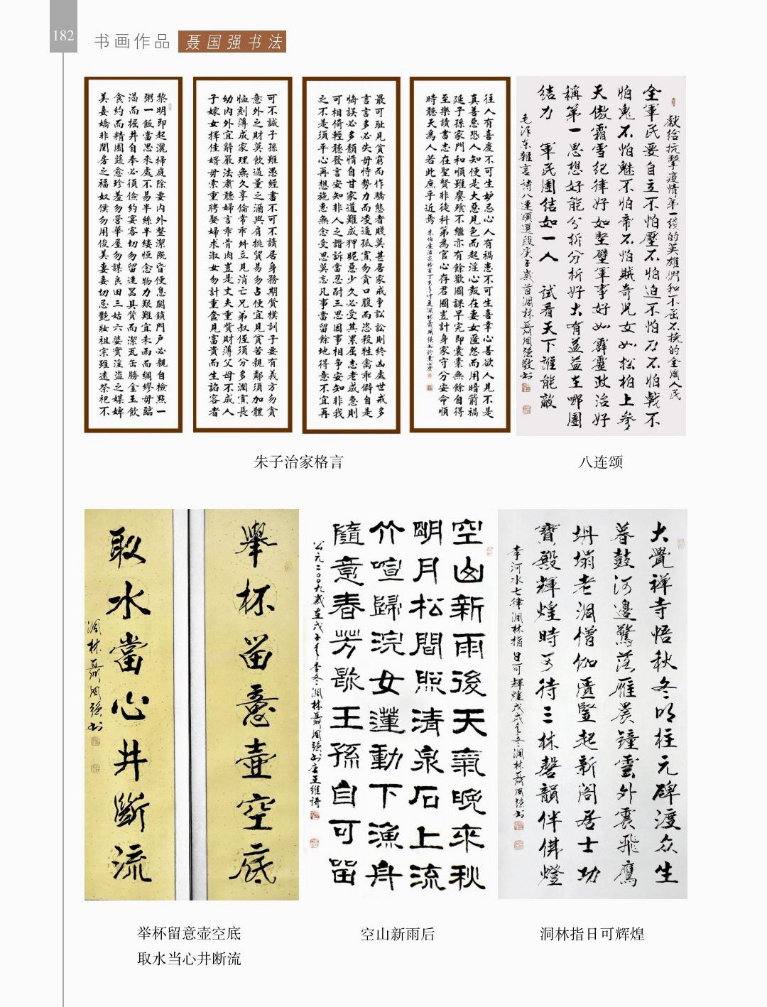 书画作品 “书画作品”篇章收录了领导、书画名家和荥阳书画院各次展览的书画作品1200幅(件),其中,描绘荥阳大美山河的长卷14幅,描绘沙海原始部落村达里雅布依的长卷11幅。 书法家张海、画家陈天然、书法家李刚田、画家禹化兴、书法家海丙离、画家马顺先、连俊洲、李艾娴、书法家刘秋梅、画家吴宝贵、书法家董江源、韦庆华等人的作品。 荥阳书画院先驱王文奎、闫松波、申震黎、张子仁、李子青、冯宗廉、王景新、时新建等人的作品。 在书画作品中,有马连水的隶书,有荥阳书画院院长张凌超的大美荥阳作品、胡杨颂作品、丝路风光作品,有书法家聂国强的作品,有画家王德安的山水作品,有李智臣的花鸟作品,有张志明的人物作品,有何松山的荷花作品,有张志立的胡杨作品,有陈根生的山水作品,有马明文的胡杨作品,有王志高的国画作品,有王玉平的丝路风光作品,有焦振亮的仿古山水,有李福明的书法,有史德亮的篆书,有蔡丽的牡丹,有王冬梅的胡杨与山水,有荆大卫的山水,有杨伟河的水粉、油画和素描,有杨莉莉的梅花与山水,有崔向前的书法,有沈子瑞的人物与胡杨,有陈赛飞的国画与篆刻,有王玮的书法,有李莉的胡杨与山水,有冯延亭的书法,有王少武的书法,有陈伟丽的胡杨,有宋伟涛和李晓敏的书法等。 描绘荥阳大美山河的长卷有《胡杨礼赞》《索河明珠》《风云广武山》《汜水通河》《美丽乡村》《禹锡园》《植物园》《象棋公园》《李商隐公园》《环翠峪四季》和《古汜水十景》。 描绘塔克拉玛干沙漠腹地原始部落村达里雅布依长卷的有张凌超、蔡丽、李智臣、李莉、王玉平、威威、吴宝贵、张志立、马明文、杨莉莉和陈根生。
