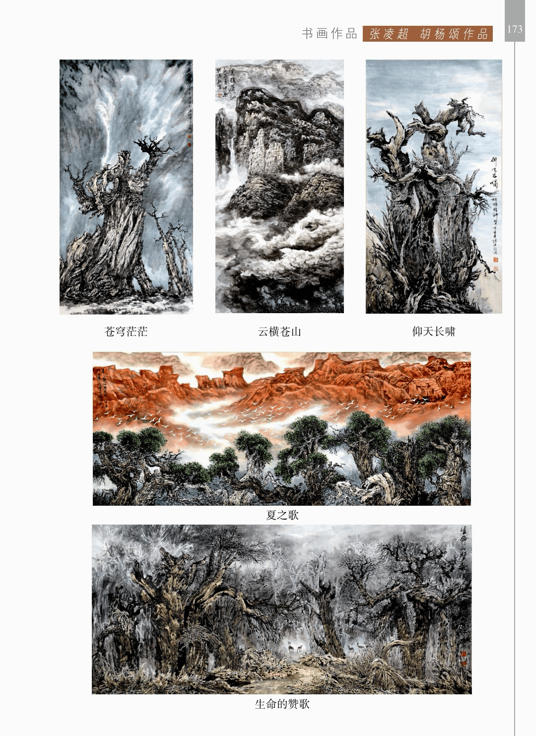 诸家评论 “诸家评论”篇章收录了24位国内美术评论家对荥阳书画院院长张凌超胡杨艺术的评论。诸如:中央美术学院教授、美术评论家邵大箴的“胡桐万树连天长”、辛民的“胸中逸气,笔下豪情——张凌超的中国画艺术”、中央美术学院博士生导师、美术评论家薛永年的“观张凌超山水画有感”、著名美术评论家李克俭的“荒漠深处的甘泉——著名画家张凌超“胡杨山水”艺术赏析”、新疆《奎屯日报》原主编马涛的“丹青劲吹胡杨风”、国家一级作家,荥阳文学院院长楚天遂的“藏奔放激情于无形——读张凌超先生胡杨作品感怀”、新疆兵团十三师宣传部常务副部长、新闻出版局局长魏红花的“生如胡杨——观张凌超胡杨画有感”、新疆一路一石国际发展联盟秘书长赵宏峰的“丝路雄风胡杨颂”以及河南省作家协会会员赵西岳的“搜尽奇峰绘山河——议张凌超山水画创作”、荥阳书画院名誉院长马明文的“我眼中的胡杨画领军人物张凌超”、荥阳书画院院士陈根生的 “胡杨画派的昨天今天和明天”等。