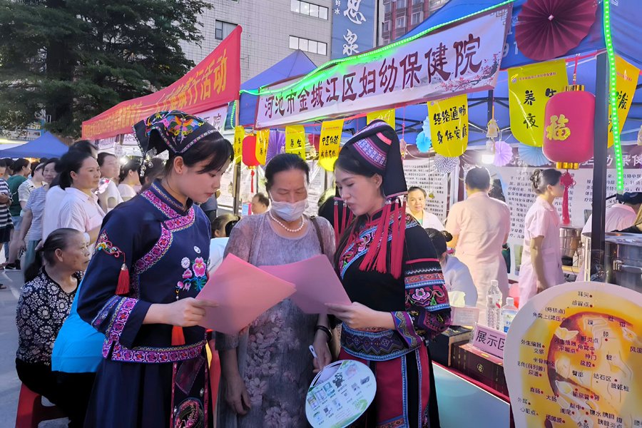 ![]() ▲金城江区妇幼保健院工作人员在宣传中医对保健的作用 活动场地共设置4 个展区。名中医及专家义诊区邀请了省级和本地名医坐诊,为市民提供免费脉诊、体质辨识等服务;中医药(民族医药)特色体验区展演脐疗、铜罐、雷火灸等特色疗法,吸引众多市民亲身体验;药膳品鉴区准备了保健茶饮、药食同源美食、膏方等药膳食品,让市民在品尝美食的同时感受中医药文化;中医药(民族医药)综合展示区通过地道药材标本和种植技术科普,展示了金城江“一方水土养一方药”的特色。