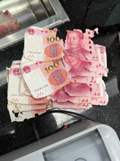 8月16日星期六,建行韶关翁源支行如常营业,服务着节假日有金融需求的市民。上午时分,一位神情焦虑的阿姨匆匆走进网点,小心翼翼地从包里取出两三个包裹严实的塑料袋。打开一看,里面是一叠破损极其严重的纸币——纸张发黑、霉变,多处被白蚁蛀蚀得残缺不全,甚至有些粘连在一起,辨认难度极大。
