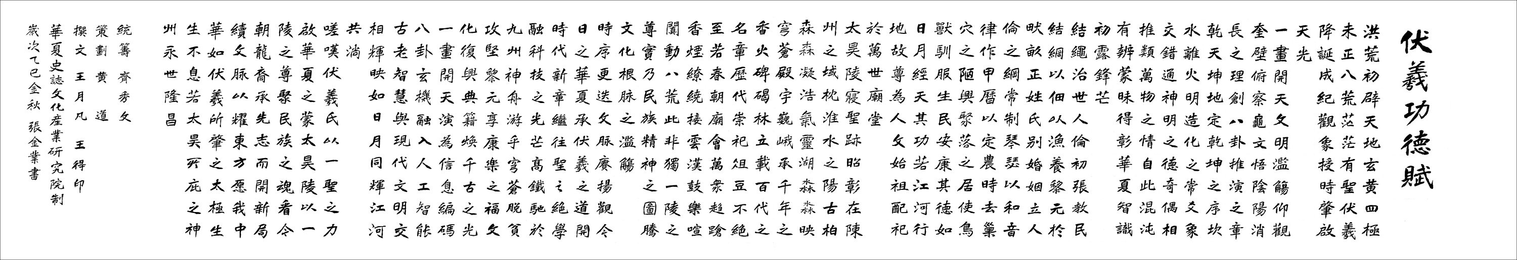 洪荒初辟,天地玄黄。四极未正,八荒茫茫。有圣伏羲,降诞成纪,观象授时,肇启天光。 一画开天,文明滥觞。仰观奎壁,俯察龟文,悟阴阳消长之理,创八卦推演之章。乾天坤地定乾坤之序,坎水离火明造化之常。爻象交错,通神明之德;奇偶相推,类万物之情。自此混沌有辨,蒙昧得彰,华夏智识,初露锋芒。 结绳治世,人伦初张。教民结网,以佃以渔,养黎元于畎亩;正姓氏,别婚姻,立人伦之纲常。制琴瑟以和音律,作甲历以定农时。去巢穴之陋,兴聚落之居,使鸟兽驯服,生民安康。其德如日月经天,其功若江河行地,故尊为人文始祖,配祀于万世庙堂。 太昊陵寝,圣迹昭彰。在陈州之域,枕淮水之阳,古柏森森凝浩气,灵湖淼淼映穹苍。殿宇巍峨,承千年之香火;碑碣林立,载百代之名章。历代崇祀,俎豆不绝,至若春朝庙会,万众趋跄,香烟缭绕接云汉,鼓乐喧阗动八荒。此非独一陵之尊,实乃民族精神之图腾,文化根脉之滥觞。 时序更迭,文脉赓扬。观今日之华夏,承伏羲之道,开时代新章。继往圣之绝学,融科技之光芒,高铁驰于九州,神舟游乎穹苍。脱贫攻坚,黎元享康乐之福;文化复兴,典籍焕千古之光。一画开天演为信息编码,八卦玄机融入人工智能,古老智慧与现代文明交相辉映,如日月同辉,江河共淌。 嗟叹!伏羲氏以一圣之力,启华夏之蒙;太昊陵以一陵之尊,聚民族之魂。看今朝龙裔,承先志而开新局,续文脉以耀东方。愿我中华,如伏羲所肇之太极,生生不息;若太昊所庇之神州,永世隆昌! (作者王月凡:曾用名王得印,豫东周口人氏,新时代传统文化学者、立志弘扬践行中华传统文化,连续在全国各地策划举办十一届传统文化创新发展论坛。为了弘扬伏羲文化,在羲皇故都河南周口伏羲太昊陵连续举办多次华夏万姓宗亲恭祭中华人文始祖伏羲大典.) 附件:为了让伏羲功德彪炳世界,让更多人了解创世祖伏羲的丰功伟绩,该赋有传统文化学者王月凡撰写,著名伏羲文化研究学者黄道先生策划,万姓宗亲恭祭始祖伏羲大典组委会主任齐秀文先生统筹,华夏史志文化产业研究院监制的书画艺术收藏珍品《伏羲功德赋》近日公开,该书画艺术品有中国书协会员、著名书法家张金业先生执笔首创并书写。