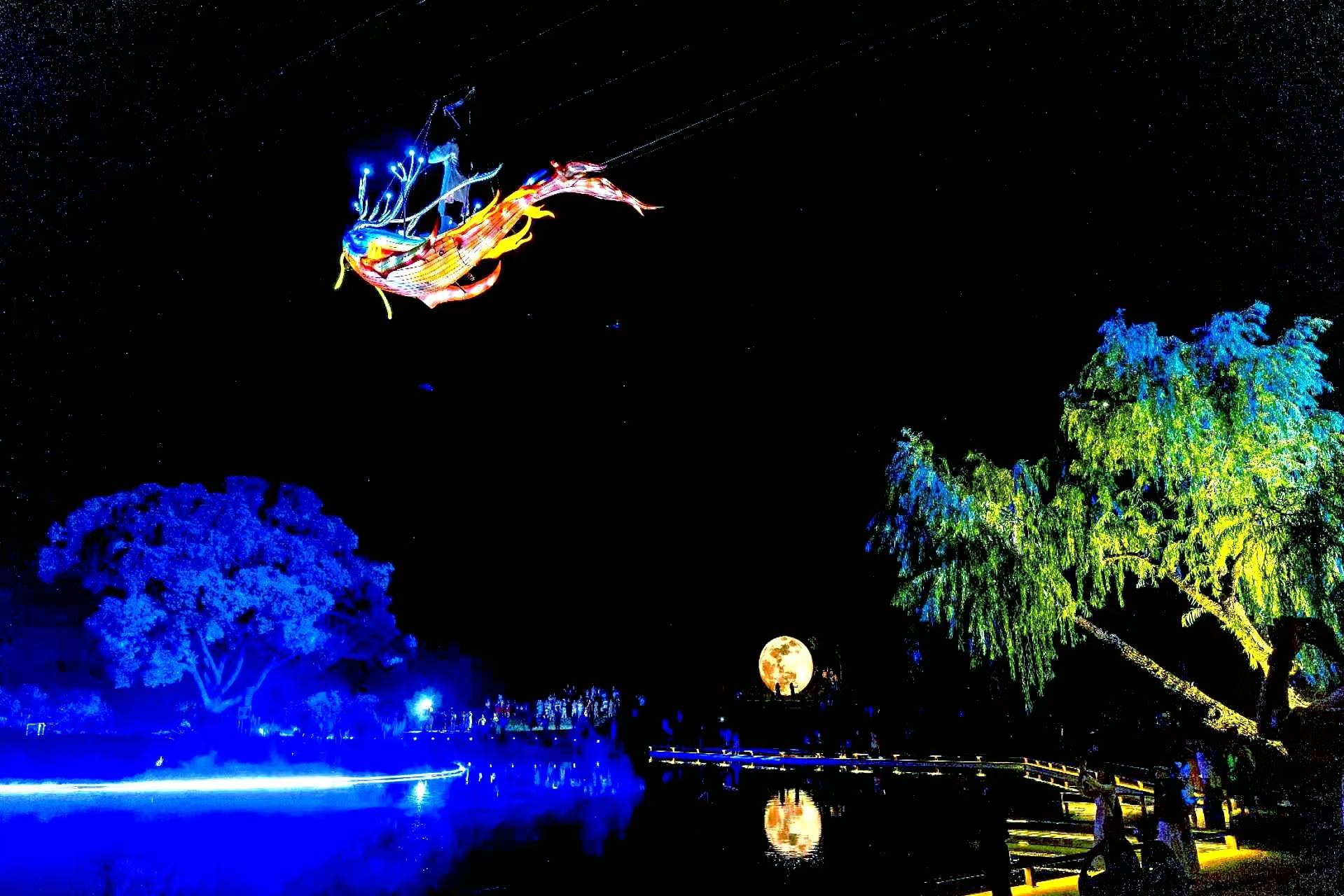 地面与水面则以“火”为笔,匠人挥臂间金火四溅,如银河落九天,与高空光影形成 “上有飞天逐鲲鹏,下有星火映碧波” 的震撼场景。整台实景秀将威亚科技、传统火艺、民族美学深度融合,为游客带来一场穿越时空的东方玄幻视听盛宴。