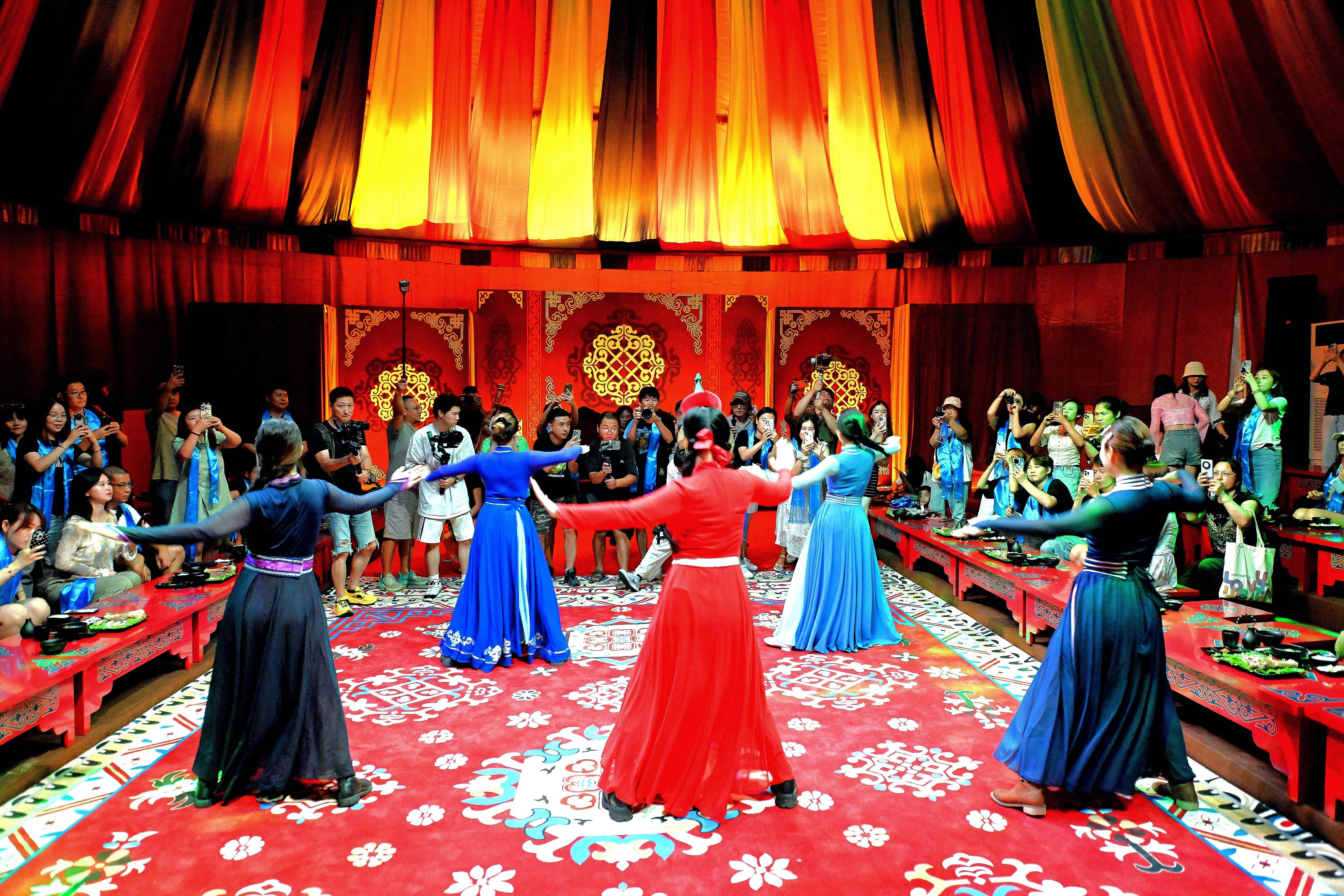 北区聚焦 “元・那达慕之夜” 的草原豪情,重磅引入沉浸式草原夜宴,复刻元代宫廷宴饮仪轨,以蒙古原生歌舞贯穿全程,搭配马头琴演奏、哈达迎宾等互动环节,从味觉、视觉、听觉三重维度,让游客沉浸式感受蒙元文化的豪迈与热忱。南北两区各具特色又互为补充,共同勾勒全域夜游图景。