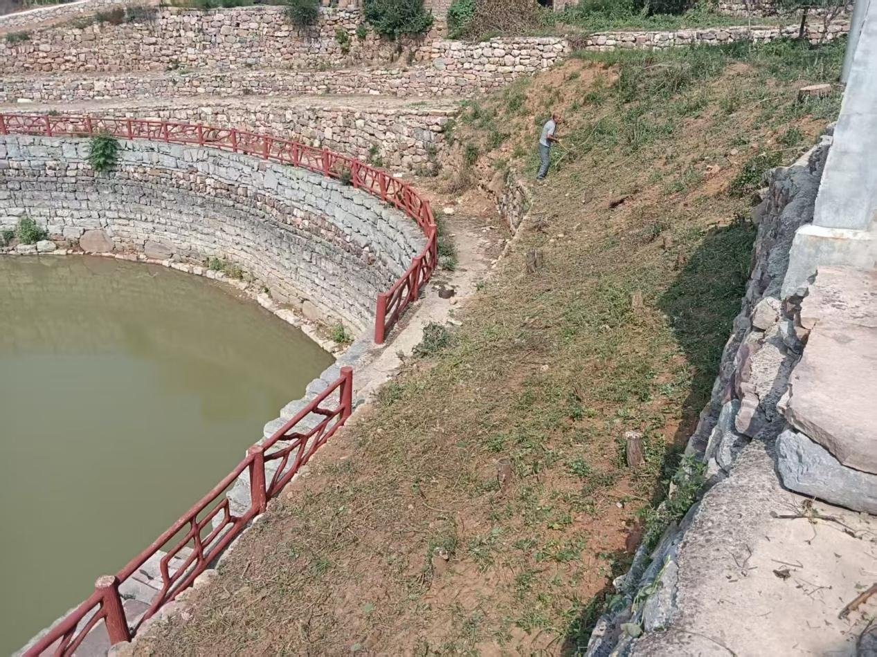几个月以来,施工队科学分工、密切配合,开展水池清淤、建筑石头墙100米、石挡墙40立方米、铺设石头护坡180平方米,总投资约15.5万元,每项工作都一丝不苟地有序推进。待基础护岸结束后,水池两岸还将铺设草坪,辅以苗木花卉点缀,在护岸的同时进一步美化环境。