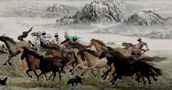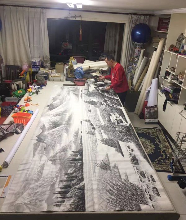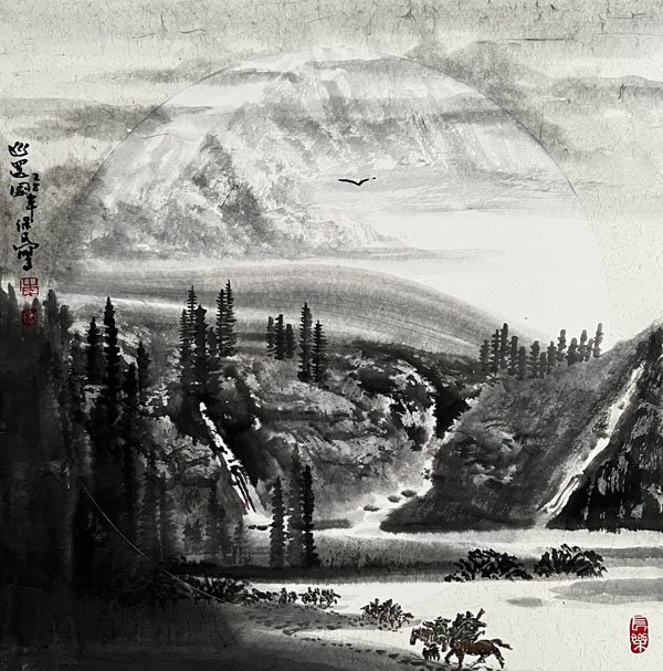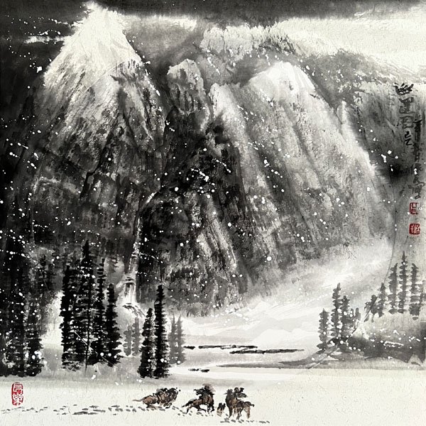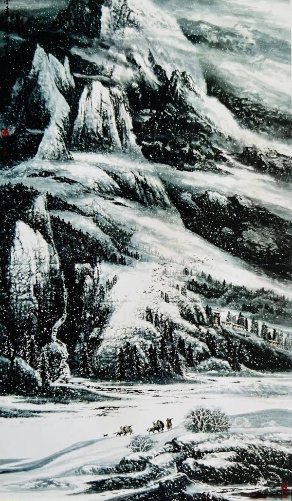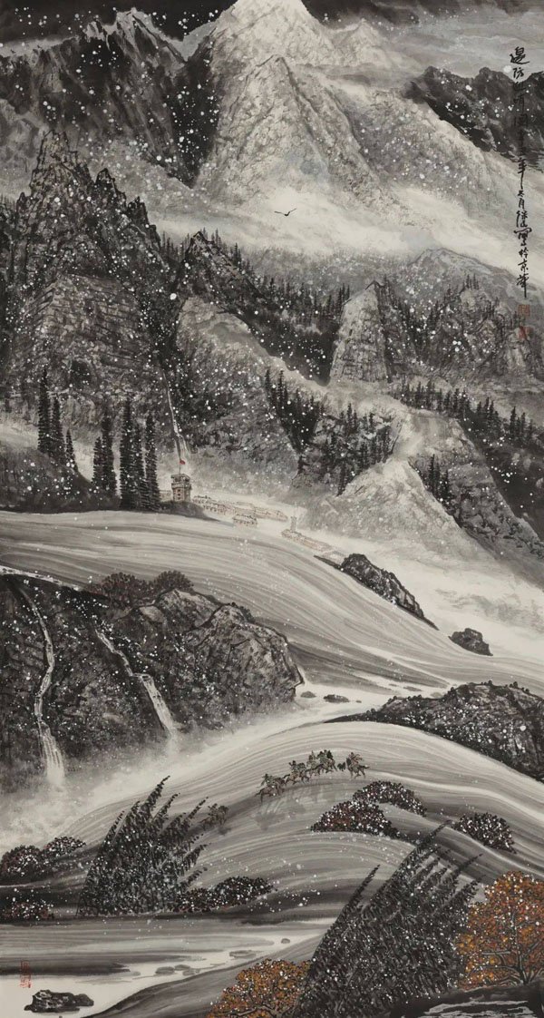 作为一位在西部出生、成长与生活的中国画家,李保民逐步在长达30余年的中国画研习中体认到笔墨对于中国画的价值。这得益于他早年曾从学于长安画派画家徐庶之的经历。一方面,他从徐庶之那里秉承了赵望云、石鲁“为民众写照”而在中国画上直取西部边地民众生活的原生形象与环境风物;另一方面,则受长安画派提倡的“一手伸向传统”创作方法的启发而深入研习传统的笔皴墨法和诗词法书,努力将赵望云、石鲁那些表现黄土高原与北地山石的笔墨转换到新疆天山山脉、昆仑山脉和阿尔泰山脉的描绘上。他抓住了这些山川雄伟奇肆的审美特征,在构图上多借鉴五代北宋山水画以全景展现的方式,但同时也具有西画焦点透视的某些取景特点。气韵是这些大尺幅全景山水的灵魂,云气烟雾乃至日月晦明都成为画家随手拈来进行画面气韵布局、穿插、回环、映衬的有效工具。在某种意义上也可以说,不论他怎样扩大画面、怎样摆布群山飞流、怎样设计整体的黑白构成,只要他把那些云气经营得巧、构思得活,他就能让画面满纸生烟、氤氲乾坤。而事实上,李保民能够把天山南北的巨大体量尽收眼底、写出它们的魂灵,也得益于他对于传统山水画这种知白守墨、气韵贯通的深刻感悟与灵活运用,是气韵的奇巧生动为他的这些大山大川注入了生命的张力。