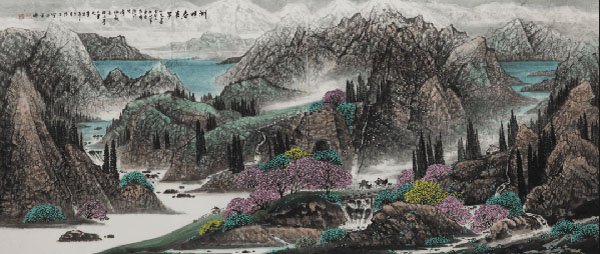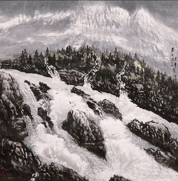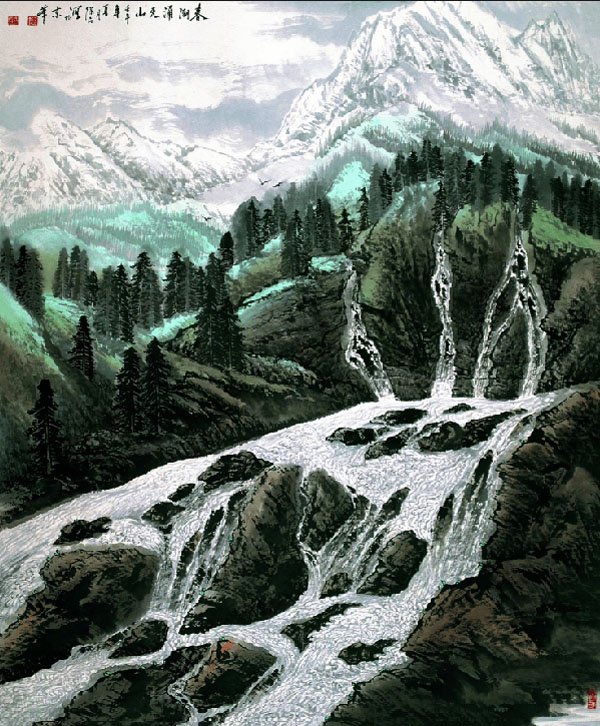 虽然,从偏向主管精神的“造境”向偏重自然描绘的“写境”所发生的审美观点变化,使中国画开始那个自然视觉形象的审美表达,但中国画并不等于简单地用笔墨去呈现严重的自然山川。笔墨与丘壑的关系是自然山川能否进入中国画审美属性的重要学术命题。也即,山水画在扩展其表现地域的过程中,并不是简单地将传统山水画较少表现的中国西部自然景观搬进画面,重要的事这些山川自然景观如何能够体现笔皴墨法、如何能够体现中国画内美的审美境界。毕竟,笔精墨妙才是衡量中国画艺术水准高低优劣最重要的价值标准。这正像董其昌说的“以径之奇怪论,则画绝不如山水;以笔之精妙论,则山水绝不如画”,意谓山水画绝不与自然山川的奇幻相攀比,而以笔精墨妙作为此种绘画的艺术灵魂,可见,西部山水进入中国画视域的难点也便在于——是西部山川的雄伟壮阔、神奇变幻唤起了画家强烈的表现欲,但这种雄伟奇幻恰恰对传统中国画的笔墨能否表现其自然形质提出了巨大的挑战。如何处理笔墨与丘壑的关系也再次成为西部山水画成功与否的肯綮。