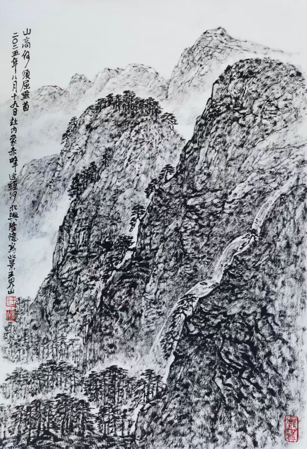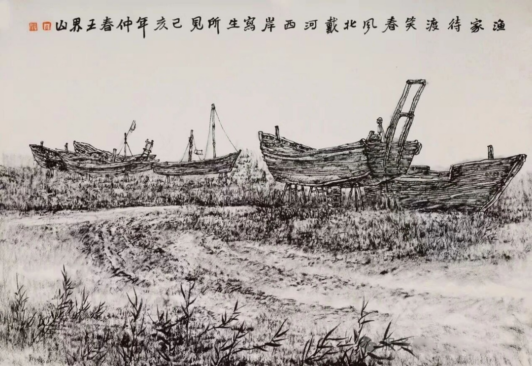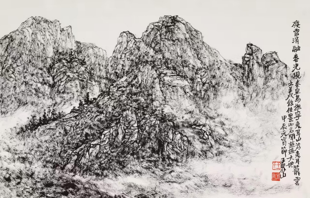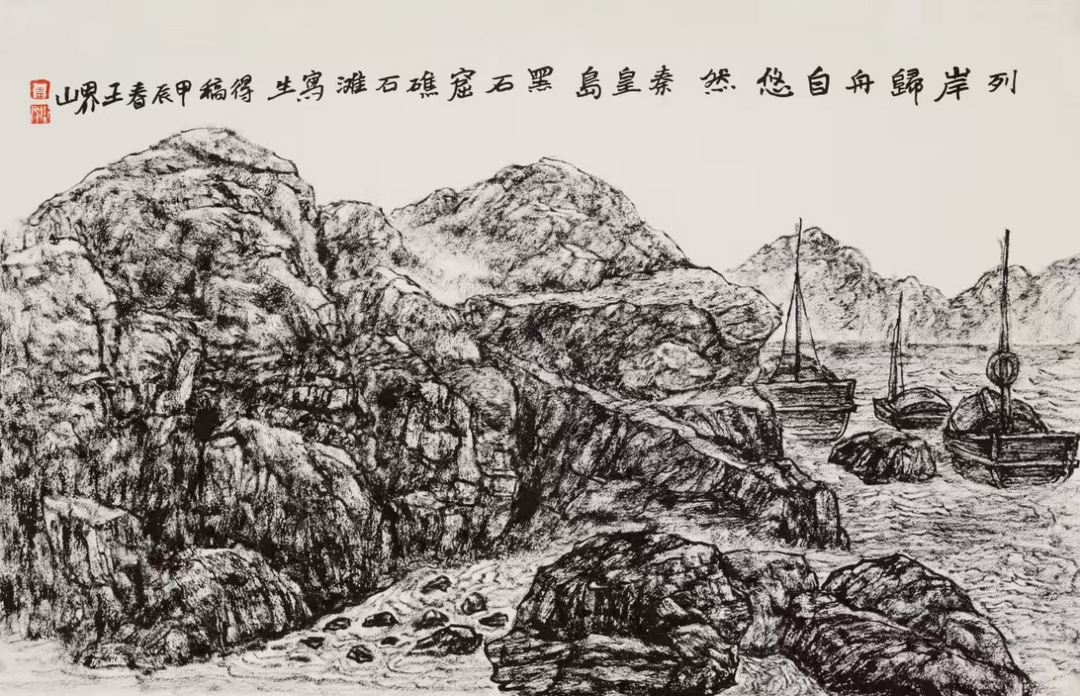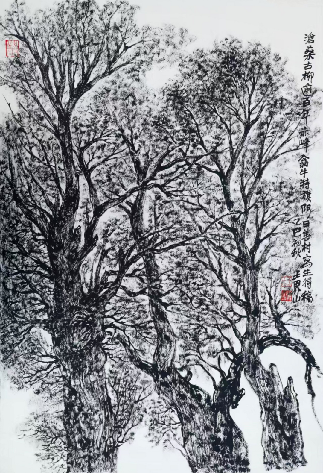 如果说传统是王界山艺术品牌的“文脉之源”,那么自然则是其品牌的“活力之泉”。他始终秉承“外师造化、中得心源”的创作理念,以天地为课堂,在真山真水中完成艺术的淬炼。不同于许多画家对名山胜水的偏爱,王界山将目光投向燕赵长城、黄土高原与家乡青州的阡陌田垄,在这些质朴无华的自然景观中发掘素朴的诗意。他的焦墨作品几乎皆从写生中来,那些带着泥土气息的山村小景、饱含沧桑的山石肌理,既是对自然物象的真实捕捉,更是对土地与农民的深情回望。这种“与山对话”的写生方式,让他得以“读懂”山石的结构与神韵,正如张志民所言,唯有读透山的分量与体积,才能下狠笔、用重墨,画出山的力量与精神。自然的滋养不仅赋予其作品鲜活的生命力,更使其焦墨艺术品牌获得了区别于传统文人画的现实温度。