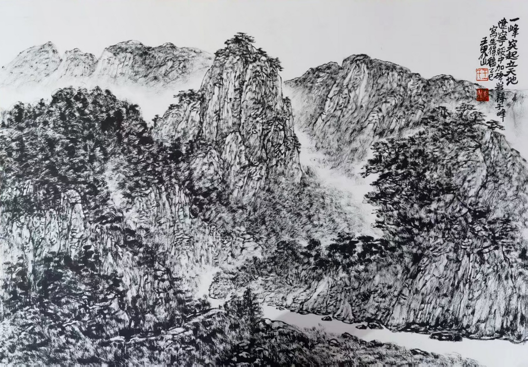 一、品牌根基:传统基因与自然滋养的双重积淀 艺术品牌的生命力始于对传统的深刻体认与对生活的真诚拥抱,王界山的焦墨艺术恰是在这两大基石上逐步成型。作为从齐鲁大地走出的画家,他自幼浸润于儒家文化的深厚底蕴,又在军旅生涯中锤炼出刚健沉毅的精神品格,这种文化基因与生命体验共同构成其品牌的精神底色。在传统笔墨传承上,他深谙“书画同源”之道,数十年如一日临习隶、楷、行、草诸体,尤其将行草书的起承转合与抑扬顿挫融入焦墨线条,使笔下线条兼具“力透纸背”的质感与音乐般的律动之美。对“元四家”、董其昌、石谿等历代大师的意临研习,更让他掌握了传统山水的笔墨精髓,为焦墨创作筑牢了古典根基。