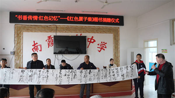 活动中,县美协主席于志祥捐赠了精心创作的美术作品;孙蓬还捐赠了由林子河题写的《满江红·厦子柴红色记忆》书法作品。林子河现场深情朗诵该词,将现场氛围推向高潮。 孙蓬深情回顾了《红色厦子柴》的创作历程。他表示,该书记录了厦子柴村这片热土上可歌可泣的革命历史,是全村共同的精神财富。他勉励同学们通过阅读了解家乡历史,传承先辈精神,让红色基因深深融入血脉。 周培青校长对各界捐赠表达诚挚谢意,并表示学校将充分用好这批珍贵资源,将其融入教育教学,引导学生铭记历史、奋发向上。