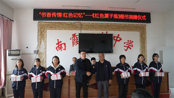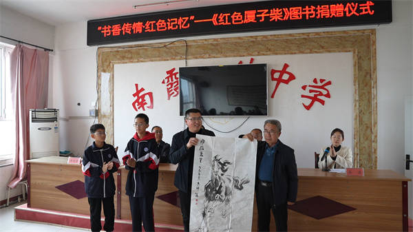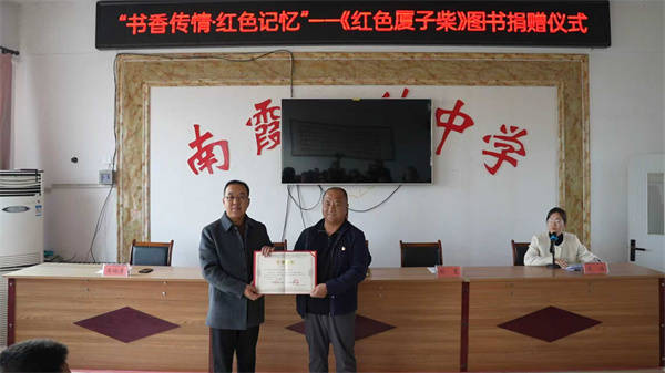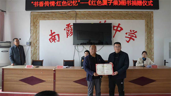 孙蓬代表厦子柴村党支部、村委会,向南霞口镇中心校和南霞口镇中学捐赠《红色厦子柴》图书共200册。刘之育副校长与周培青校长共同接受赠书,并向厦子柴村回赠了收藏证书,以表达由衷的感谢。