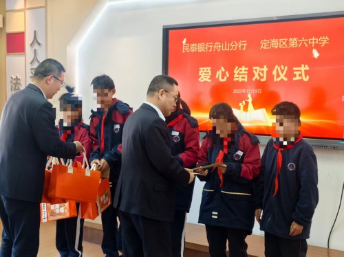 2025年12月9日下午,阳光正好,民泰银行舟山分行工会主席董啸波亲自带队,携办公室主任及分行团委成员一行五人,满怀深情地踏入了定海六中的校园,开展本年度的爱心结对帮扶活动。 座谈会上,定海六中团委领导对民泰银行舟山分行的到来表示了热烈的欢迎和衷心的感谢,并详细介绍了本次受助学生的基本情况,以及学校在“德育培养”方面的创新理念和师资团队建设,展现了学校致力于为学生提供全方位道德教育和综合素质提升平台的决心与行动。董啸波主席也借此机会,向在场的师生们介绍了民泰银行舟山分行的基本概况,以及分行在精神文明建设方面取得的显著成就。他强调,民泰银行舟山分行不仅是一家金融服务机构,更是一个积极履行社会责任、传播正能量的温暖集体。