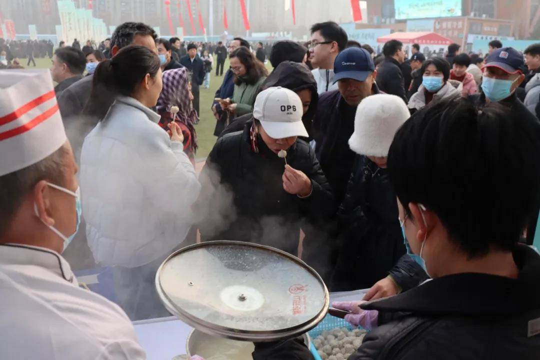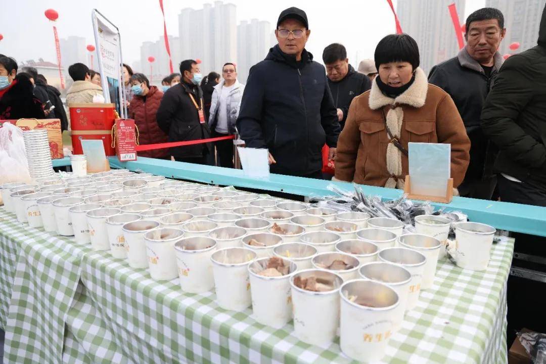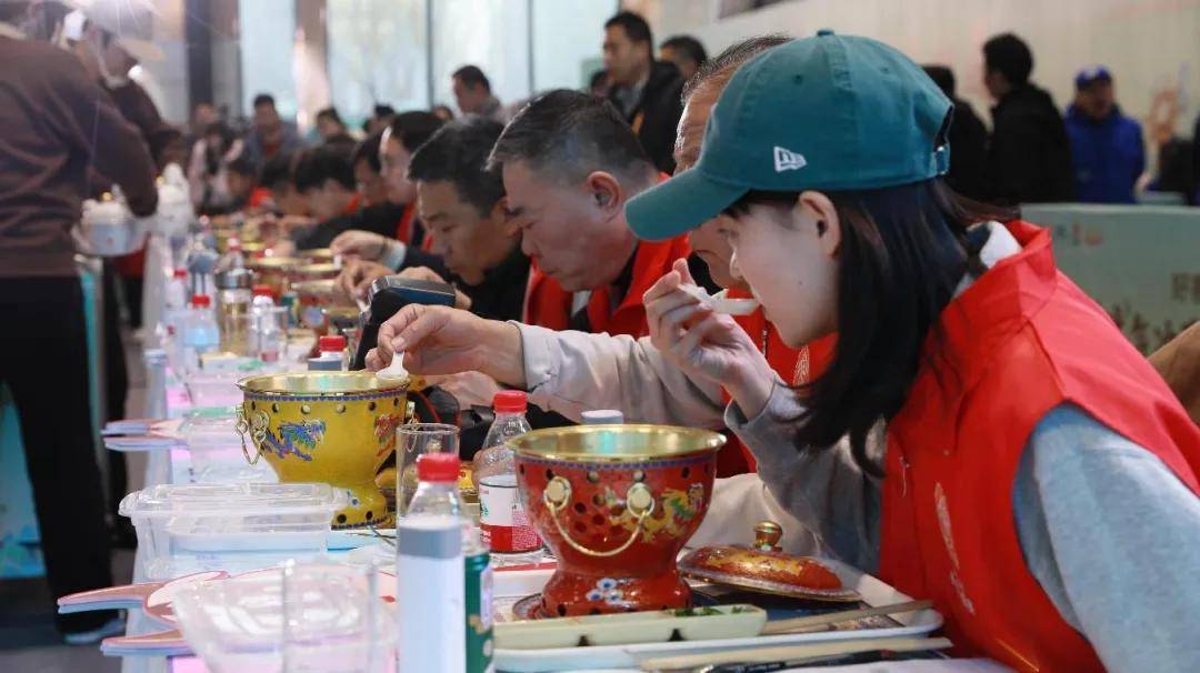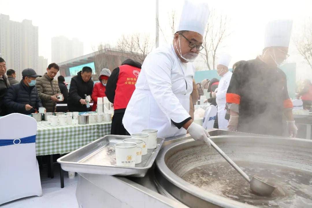 牛跃犇腾—邀约同品牛肉汤活动现场人声鼎沸,现场六口大锅同时烹煮,选用可溯源优质牛肉,由本地知名企业现场熬制地道牛肉汤。群众通过简单互动即可领取品尝,在冬日里共品热气腾腾、鲜香醇厚的阳信味道。