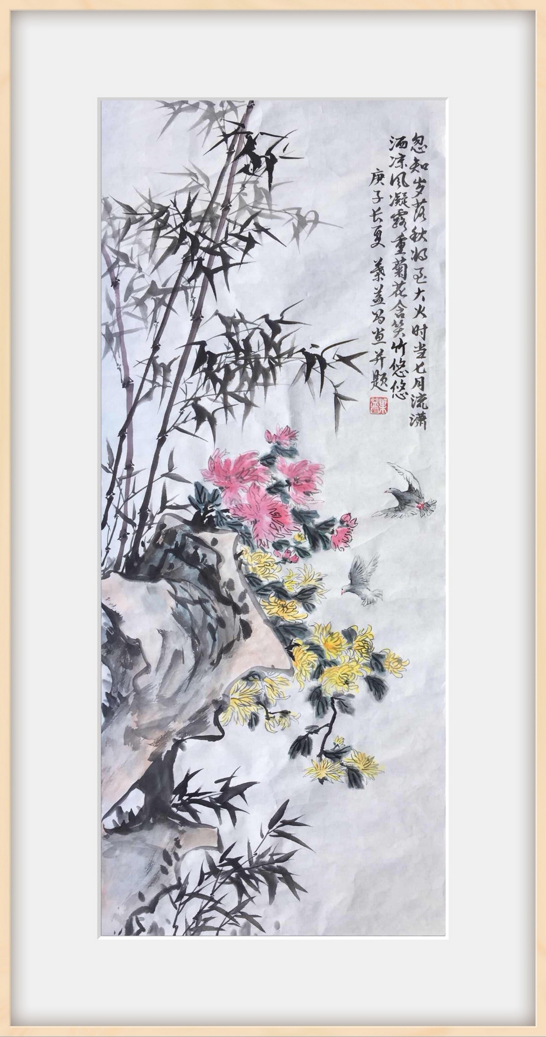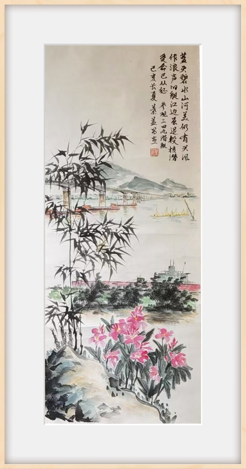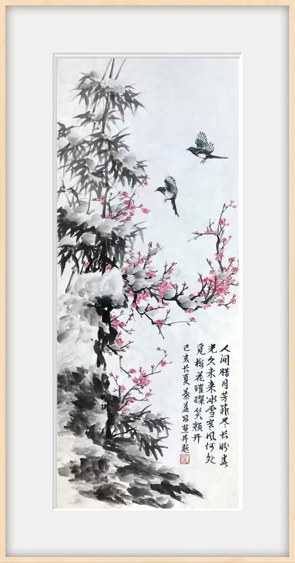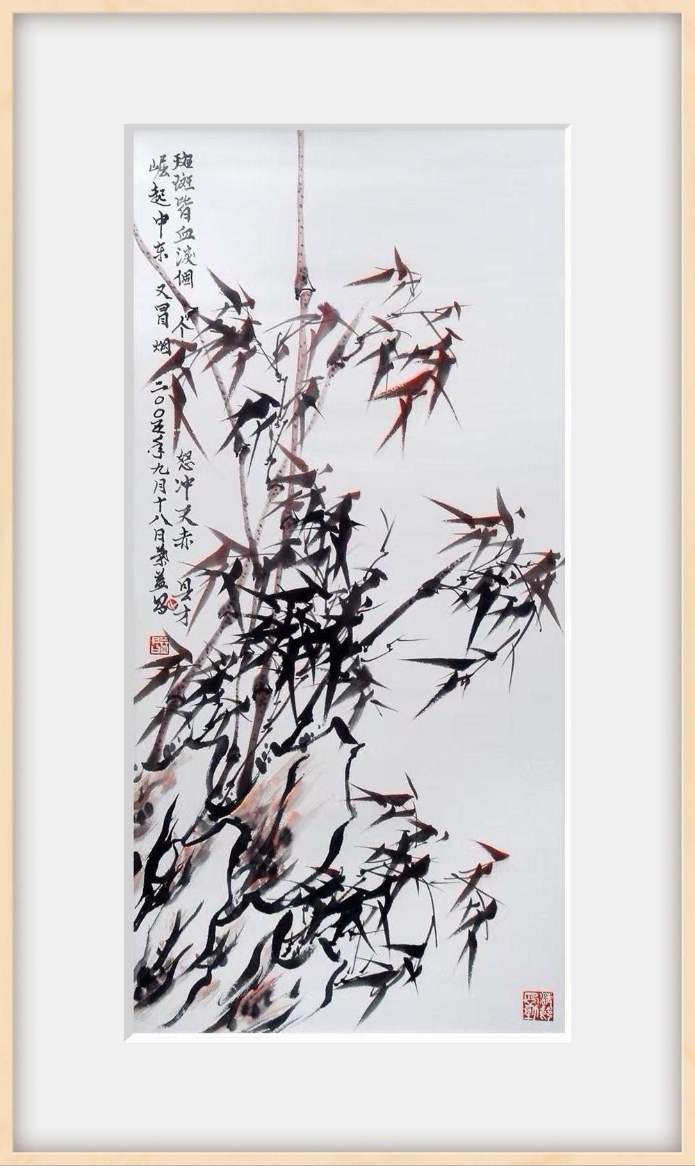 在艺术表达的维度上,叶益昌的作品兼具题材的广度与精神的深度,尤其以画竹的独到造诣为人称颂。他把竹的“虚心、耿直、节贞”三德视作立身行事的圭臬,更将这份追求熔铸为笔墨间的精神风骨——心绪烦郁时绘竹抒怀,胸臆澄明时写竹悟道,运笔之际凝神聚气、力透纸背,务求竹竿挺拔如松,竹叶舒展似舞,真正做到“画竹即画心,写竹即写志”。除了竹石佳作的清逸神韵,他的创作视野更是开阔辽远、包罗万象:《喜上眉梢》《平安富贵》等花鸟作品,笔墨灵动、意趣盎然,将吉祥美满的期许藏于禽鸟花木之间;《乐清市中心公园一角》《雁荡山》等山水画作,笔触细腻、意境清幽,把江南故土的灵秀气韵晕染于尺幅之上;《参观三四九潜艇》等主题创作,则将个人情愫与家国情怀紧密相连,为作品平添了沉甸甸的时代分量。他始终笃信“笔墨当随时代,更当超越时空”的艺术理念,既锚定传统文人画的精神内核,又不拘泥于陈规旧法,让作品在雅俗共赏之间寻得精妙的平衡点。