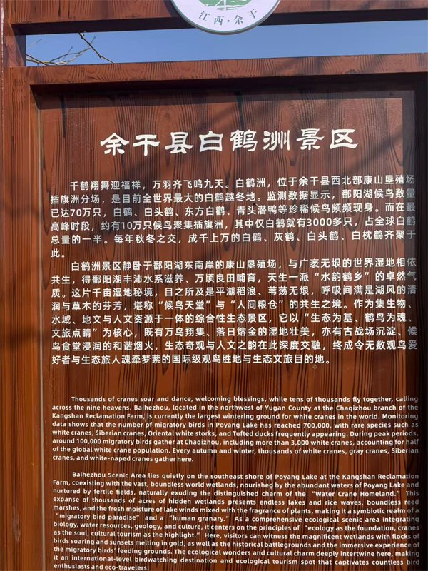 余干白鹤洲,屹鄱湖东南岸,为全球最大白鹤越冬地。每至秋冬,万羽翔集,鹤唳九霄,鄱湖湿地遂成候鸟天堂。康垦大堤车辙络绎,观鸟滩头人头攒动。睹此盛景,感生态之美,赋绝句以记。