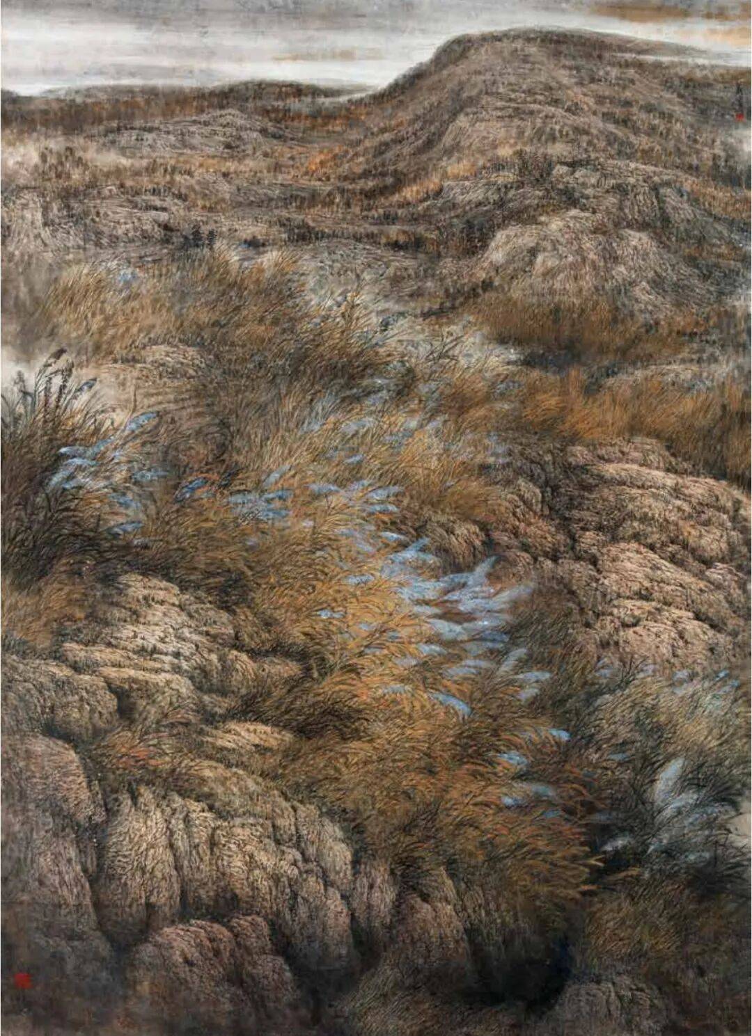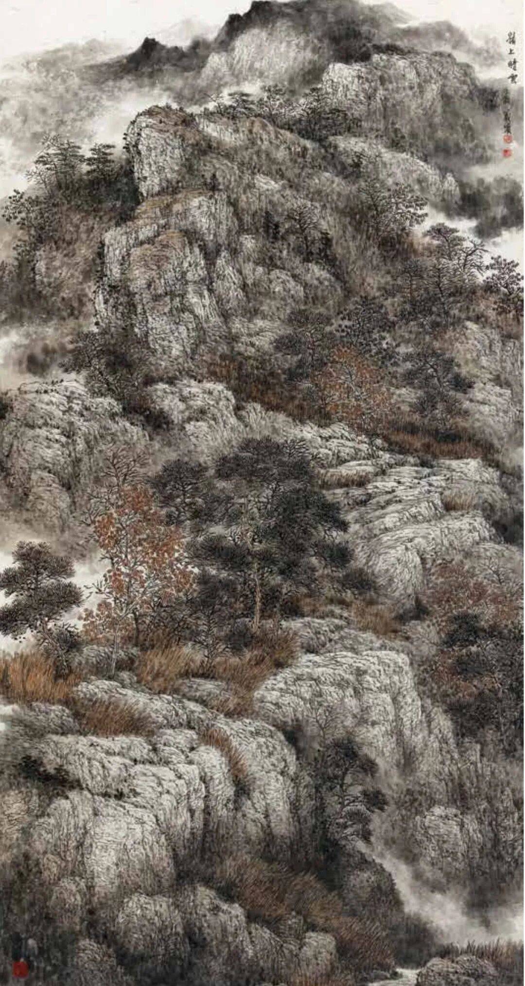 秋歌 张义宾笔下的山川,最撼动人心者,莫过于其厚重如铸、雄浑苍茫的气象。其构图常取高山仰止之势,层峦叠嶂,壁立千仞。墨色以浓重深沉为基调,笔锋如刀凿斧斫,于山石的肌理间刻画出一种近乎永恒的力量感与沧桑感。这绝非纤巧秀丽的江南景致,而是赣南大地深处蕴藏的坚韧魂魄在宣纸上的凝结。那山峦的筋骨,分明呼应着这片土地上世代生息者筚路蓝缕、顽强不屈的生命意志。山,在他的画中早已超越了自然地貌,升华为一种磅礴的精神象征,一种顶天立地、不可摧折的民族脊梁与故土精魂的意象化表达。