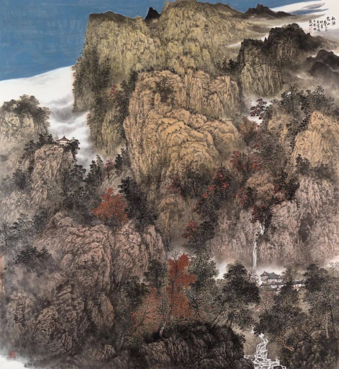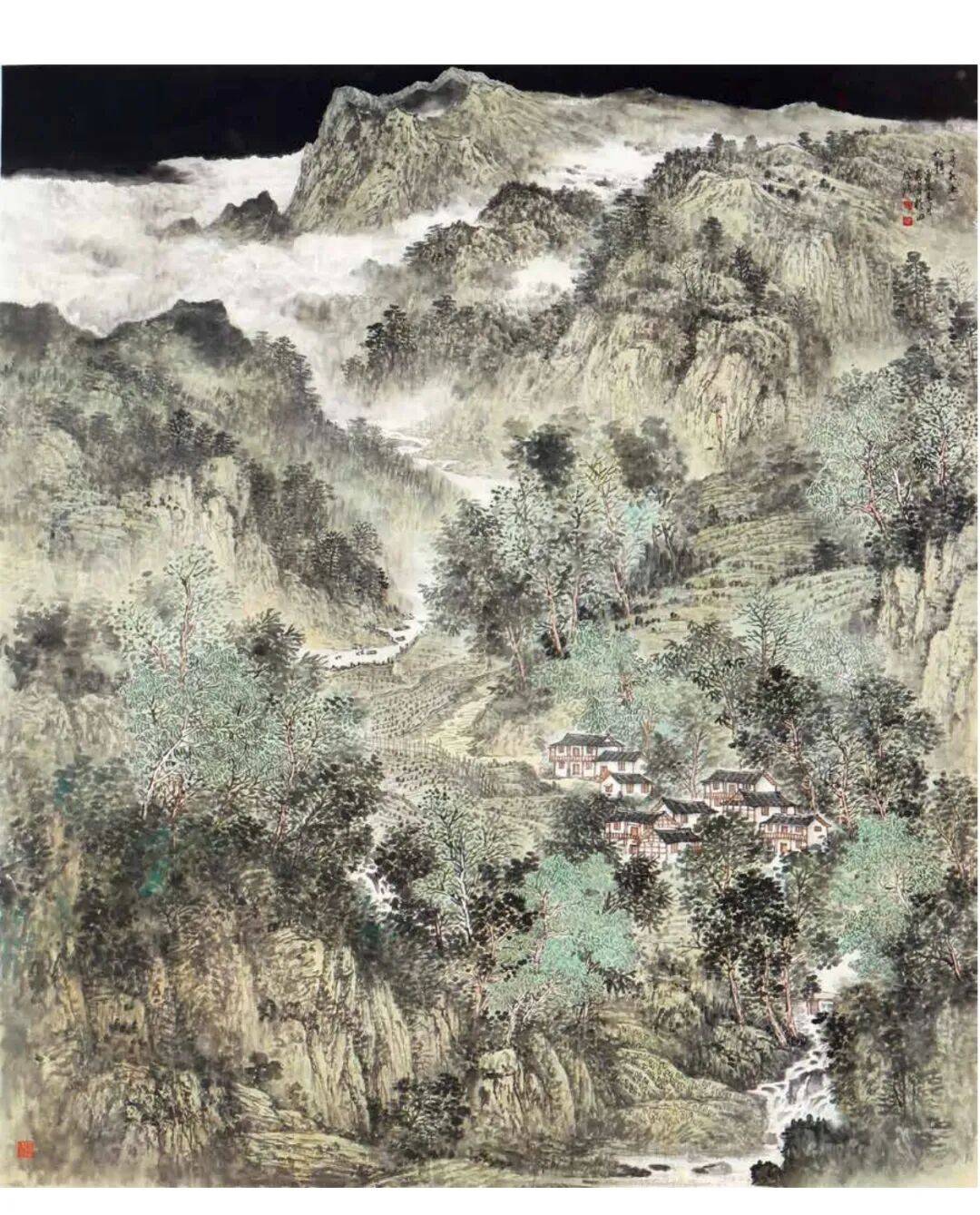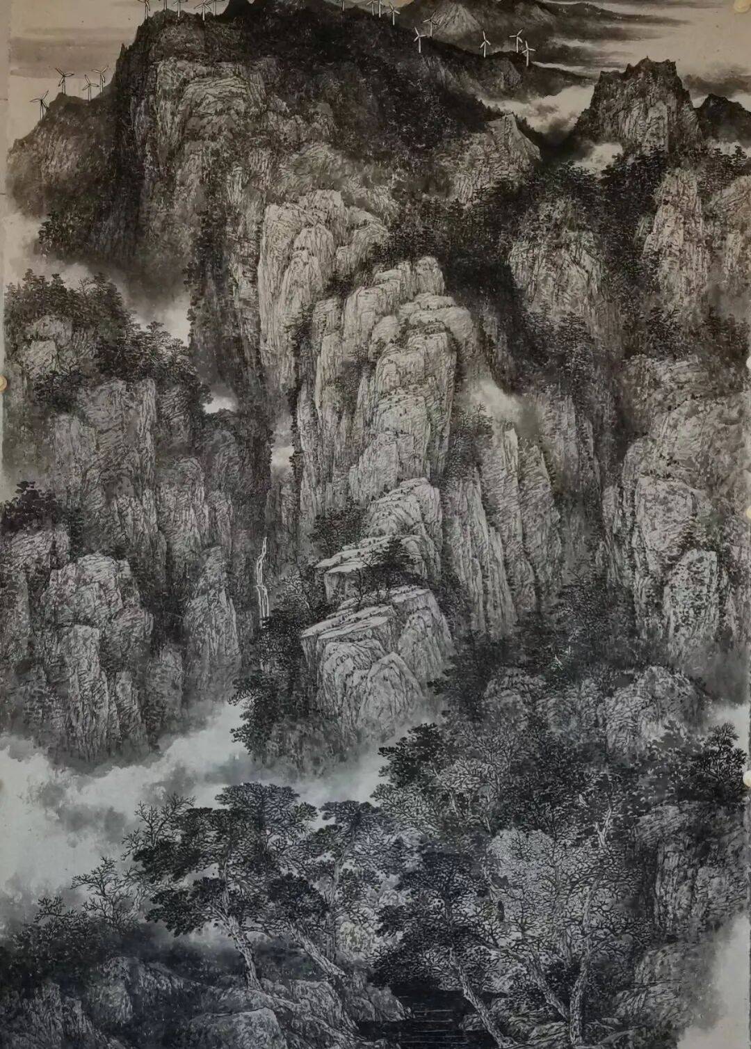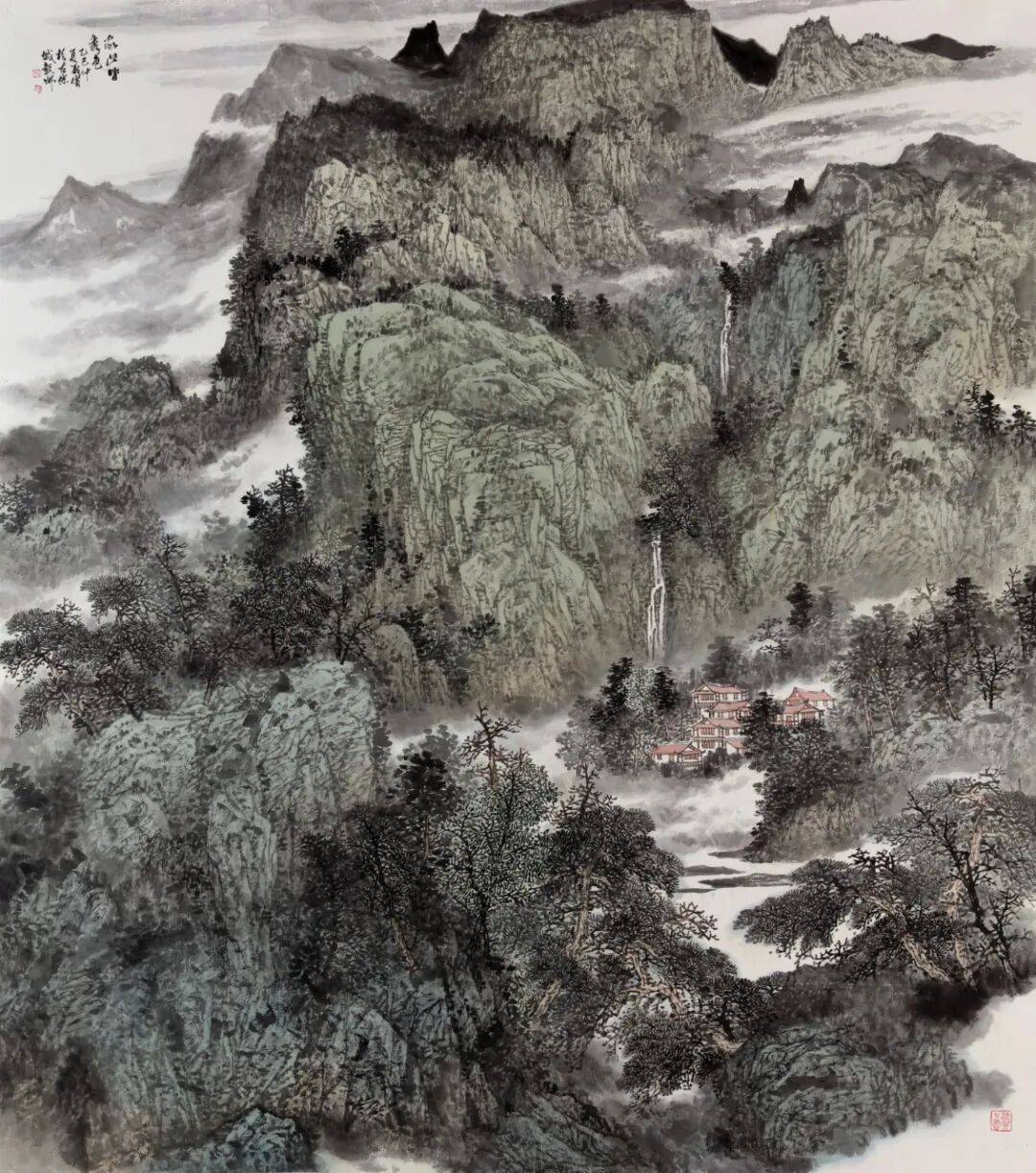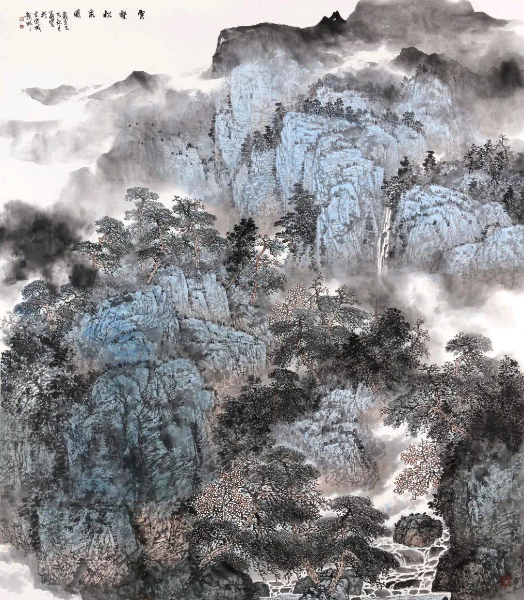 家山皆秀色 与雄浑山势相生相伴的,是画中流淌不息的“水”的哲思。张义宾深谙“山无水则不灵”的古训。他笔下的水,或为深涧幽泉,蜿蜒于巨壑之间;或为浩渺烟波,弥漫于峰峦之际;或为飞瀑流响,冲破岩壁的禁锢。水的 形态万千,其核心意趣却始终指向“虚”与“活”二字。那大片的留白或淡墨渲染出的云烟水汽,并非画面的空缺,而是宇宙元气流动的空间,是“无中生有”的道家智慧在视觉上的呈现。水与云烟的氤氲流转,冲淡了山石的刚硬,赋予画面以呼吸的韵律与生命的灵动。动静相宜,虚实相生,在这水墨交融的化境中,宇宙自然生生不息的运行法则与内在和谐得以诗意地彰显。