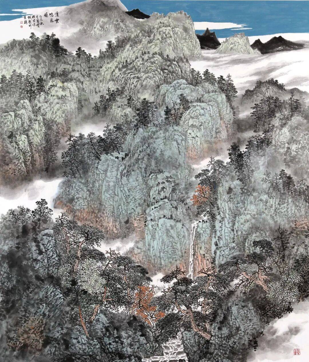 雲壑松泉圖 张义宾对画面空间的营构独具匠心,其“远意”的追寻尤为精妙。他常通过峰回路转、云隔雾断的巧妙处理,在有限的尺幅内拓展出无限深远的意境。近景山石林木刻画精到,质感强烈;中景峰峦渐次推远,墨色层次微妙过渡;远景则常隐没于缥缈的烟岚或虚空之中。这种由实入虚、渐行渐远的空间序列,引导观者的视线与思绪不断向画外延伸、向天际探寻。它营造的不仅是一种物理空间的纵深,更是一种引人入胜的“心理远距”,一种“此中有真意,欲辨已忘言”的悠长回味,一种对天地玄远、时空永恒的静默叩问。正是这份“远意”,使他的山水摆脱了地理景观的局限,升华为容纳宇宙精神的宏大剧场。
