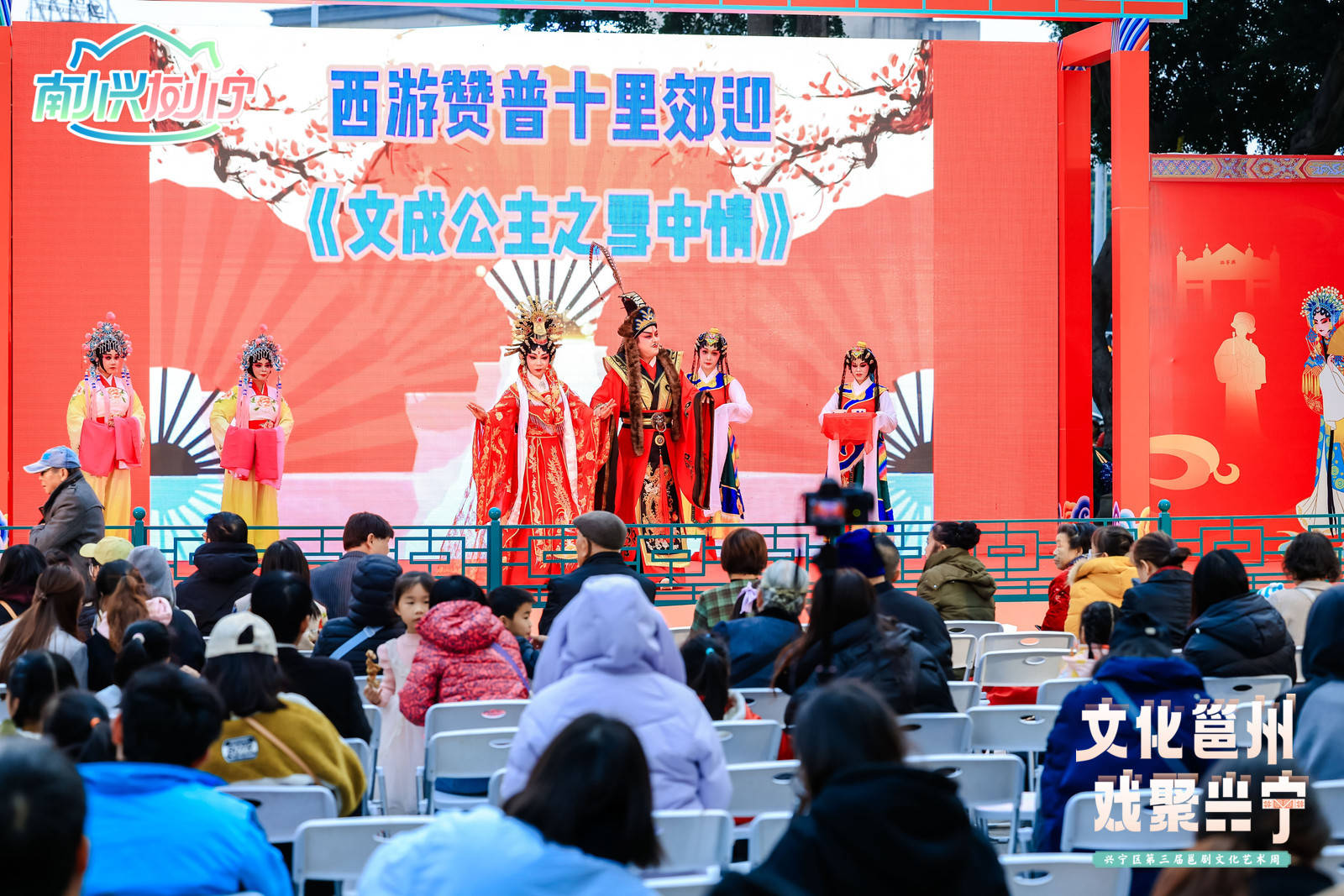 经典剧目展演:粤韵悠扬传递文化温度 当日16:30,展演正式开始。开场节目《春日郊游》以清唱形式亮相,演员用醇厚的粤剧唱腔描绘春日踏青的美好场景,婉转的旋律瞬间将观众带入岭南水乡的诗意氛围。随后,折子戏牡丹亭之《倚秋千》精彩上演——演员们以细腻的表演、灵动的身段,演绎了一部爱情剧,少女杜丽娘长期深居闺阁中,接受封建伦理道德的熏陶,但仍免不了思春之情,梦中与书生柳梦梅幽会的故事,程式化的动作与生活化的情感完美融合,赢得观众阵阵掌声。 展演中,粤剧经典选段轮番登场: 《游园惊梦》清唱以柔美的声线诠释了昆曲与粤剧的跨界融合,让观众感受传统戏曲的意境之美; 《剑合钗圆》唐代才子李煜和名妓霍小玉,因紫钗结缘,经历重重困难,最终共谐连理,演绎得淋漓尽致; 史诗性剧目《文成公主之雪中情》则聚焦文成公主和亲进藏的历史事件,通过大气磅礴的叙事与庄重的表演,以文成公主和亲进藏的历史事件为依据创作,讲述了文成公主坚守吐蕃四十年,促进了吐蕃经济、文化的发展,加强了汉藏人民的友好,引发观众强烈共鸣; 压轴节目《分飞燕》由兴宁区粤韵团倾情献演,熟悉的旋律响起时,不少老年观众跟着轻声哼唱,现场氛围温馨动人。