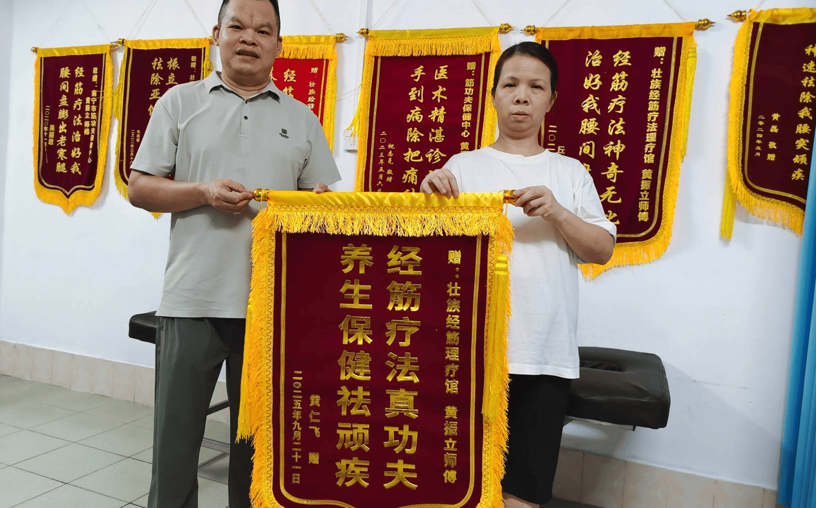 这种“手到病除”的神奇与“医者仁心”的温度,像一颗种子埋进黄振立心里。他从小在耳濡目染下,受叔公熏陶,得叔公言传身教,逐渐习得经筋疗法。1996年,在叔公的熏陶下,他前往凭祥市黄氏经筋馆工作,正式开启系统践行经筋疗法的历程。“最初学认‘筋结’,叔公敲着我手背笑:‘这是斜方肌的硬结,按下去像按核桃壳;那是肩胛提肌的软结,摸起来像泡发的木耳——你连软硬都分不清,怎么治病?’”为练准手感,他用竹片在自己手臂上反复推按,从肘窝到腕部,每天上百次,直到皮肤发红、皮下淤血也不停。“最难的是找颈椎病的‘靶点筋结’,位置深、触感弱,我曾在模特肩上摸了三天,才摸清第5、6节颈椎旁的筋结点。”他说,“叔公说‘手法是医者的第二张嘴’,这张嘴要‘说’清楚病灶的位置,‘讲’明白气血的通路,半点含糊不得。”