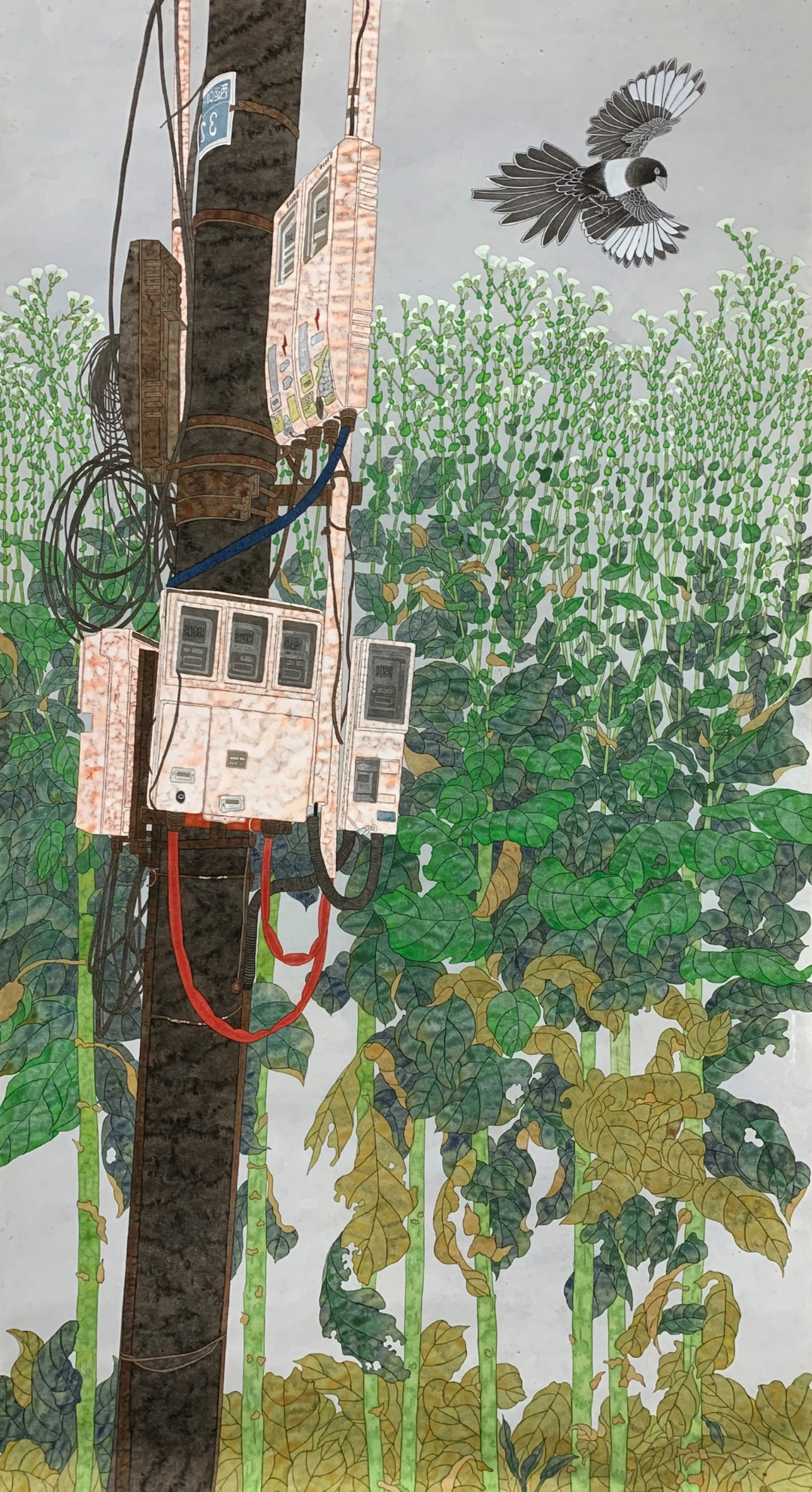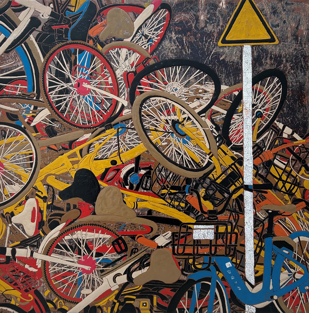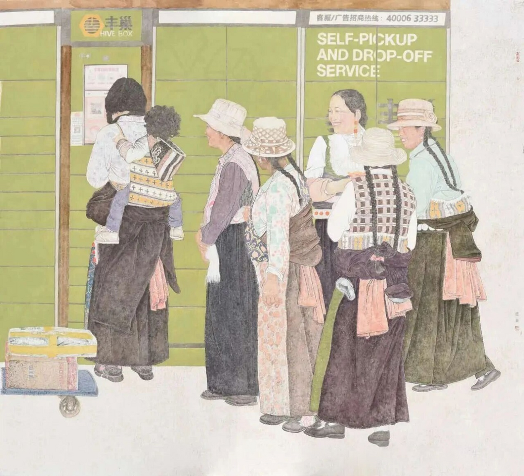 主题:下沉视角与烟火气的升华 丁德发的艺术视角始终是向下扎根、贴近大地的。“幸福生活”是他热衷并持续书写的核心命题。但他所定义的“幸福”,并非遥不可及的理想幻境,而是渗透在日常褶皱里的微光与温暖。于是,《幸福生活——取快递的女人们》中,现代社会最寻常的消费生活场景成为主角;田间地头休憩时的一碗茶水、邻里街坊闲暇时的亲切攀谈、枝头悄然绽放的寻常花草……这些极易被宏大叙事忽略的细节,都成了他笔下深情凝视的素材。