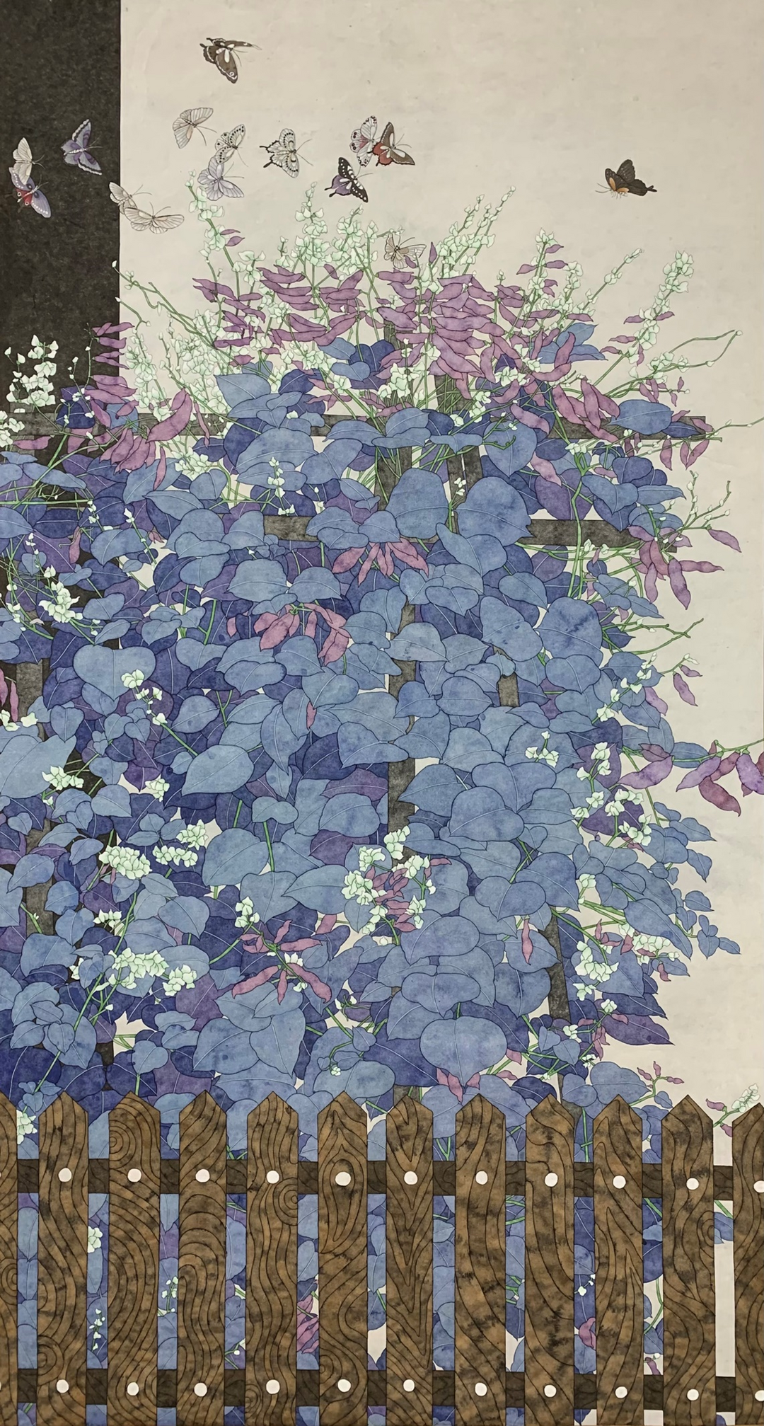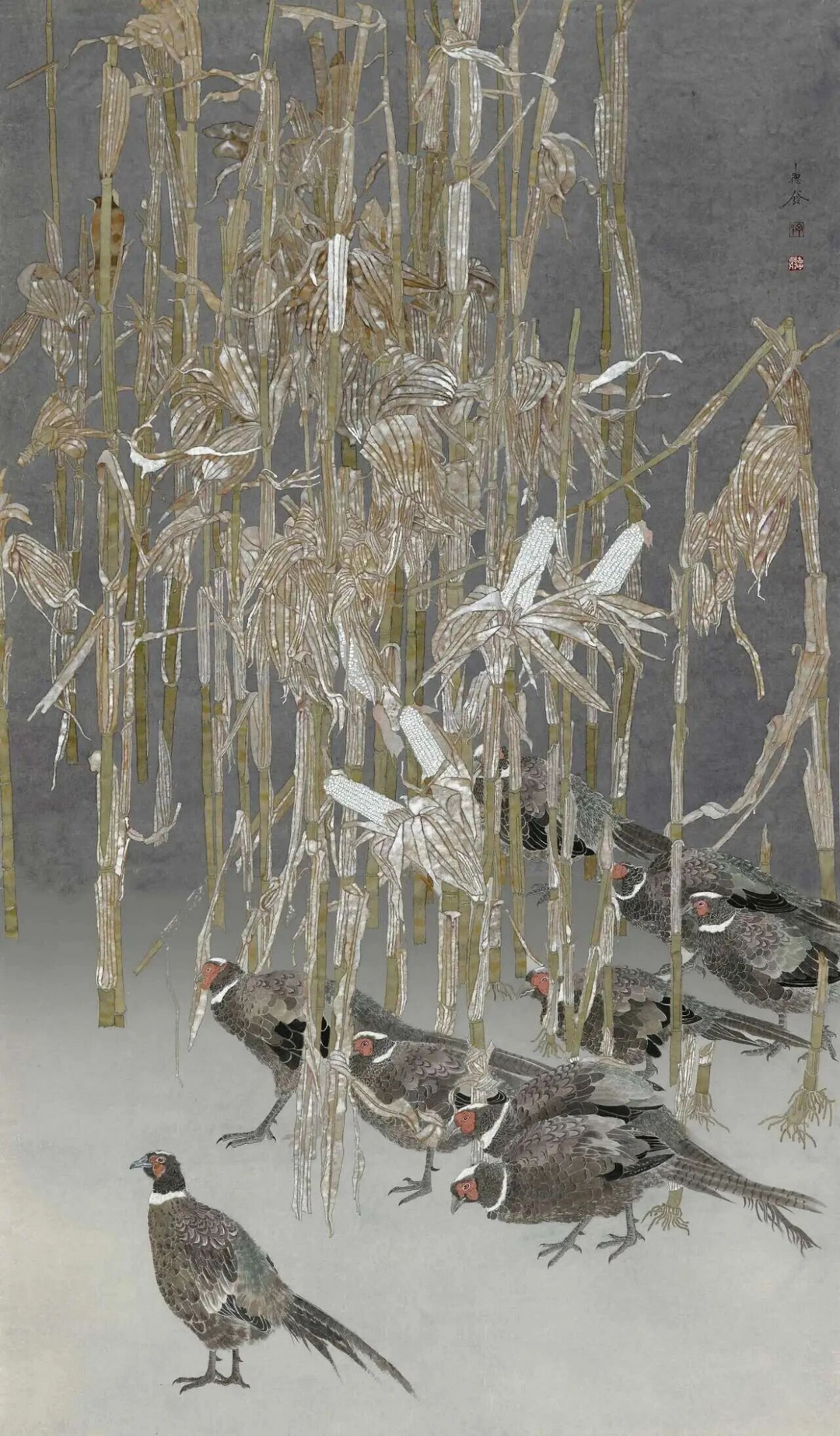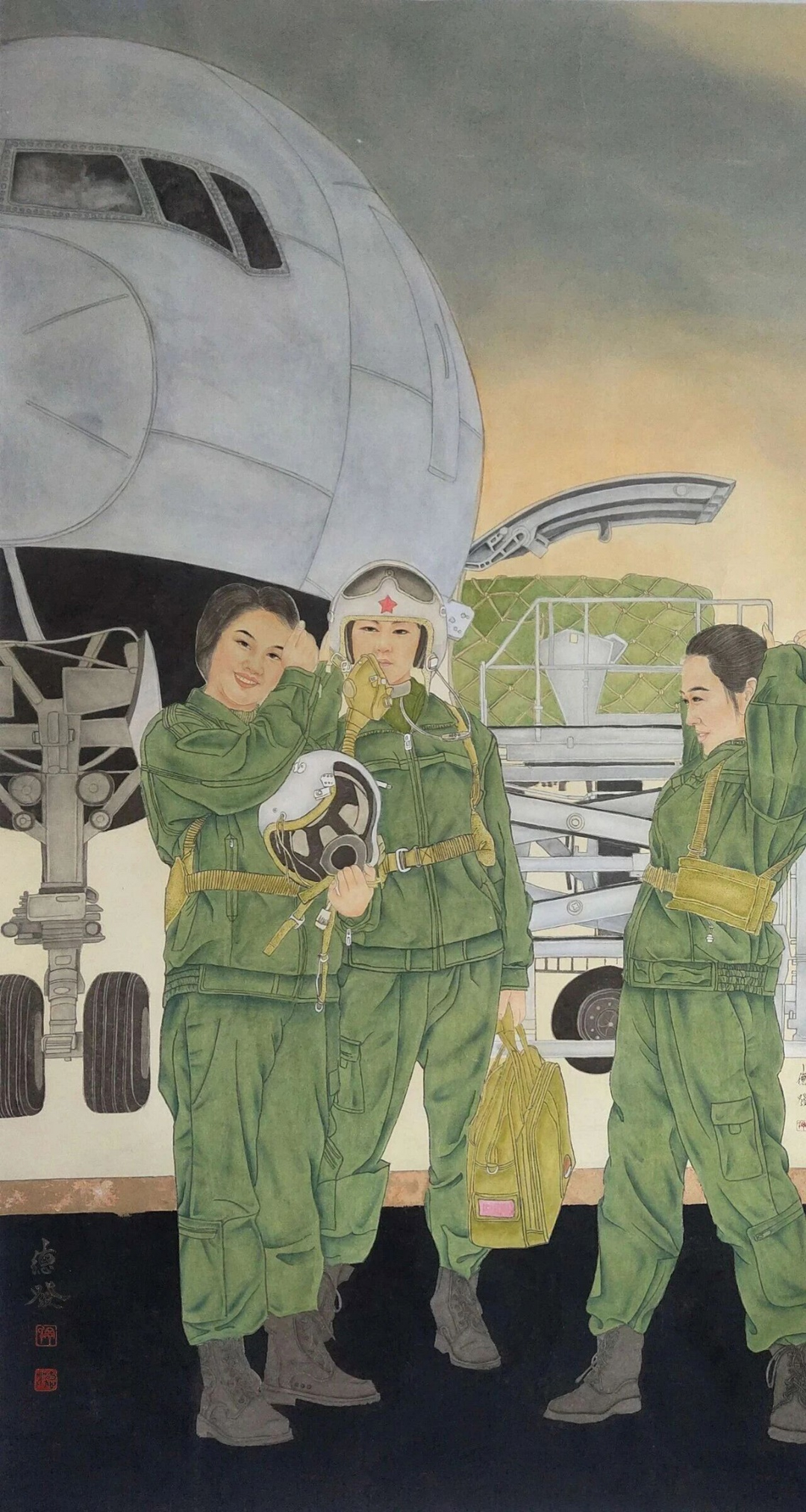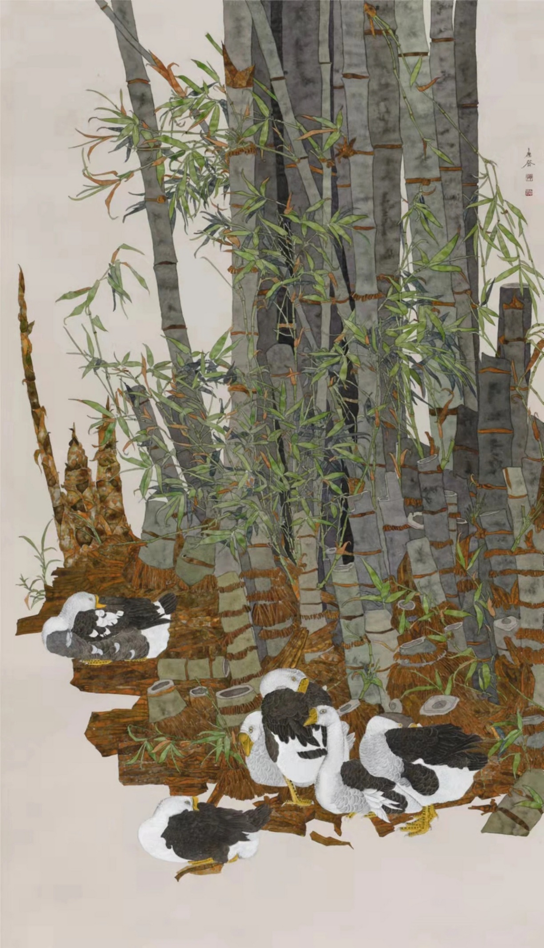 创新:中西交融的色彩革命与意境重构 在艺术语言的创新上,丁德发展现出了非凡的胆识与融汇的智慧。他深知中国画,尤其是工笔画的精髓所在,其创作深植于传统根基,恪守宋元以来工笔画“格物致知”、“精细雅致”的笔墨精神与意境追求。线条的勾勒讲究力道与节奏,如行云流水,绵延不断;意境的营造追求含蓄隽永,往往留有空白,引人遐思,颇有古卷流芳的雅致韵味。 然而,他并未止步于此,而是敏锐地察觉到传统工笔在色彩语言上相对淡雅、内敛的特点,有时难以完全承载当代生活的丰富性与视觉表达的张力需求。他大胆地将目光投向西方绘画体系,特别是油画对色彩层次、光影关系与色调表现的细腻把控和强烈表达。他巧妙地将油画中丰富、饱满、有时甚至艳丽的色彩感觉,融入工笔画“三矾九染”的层层叠染技法之中。