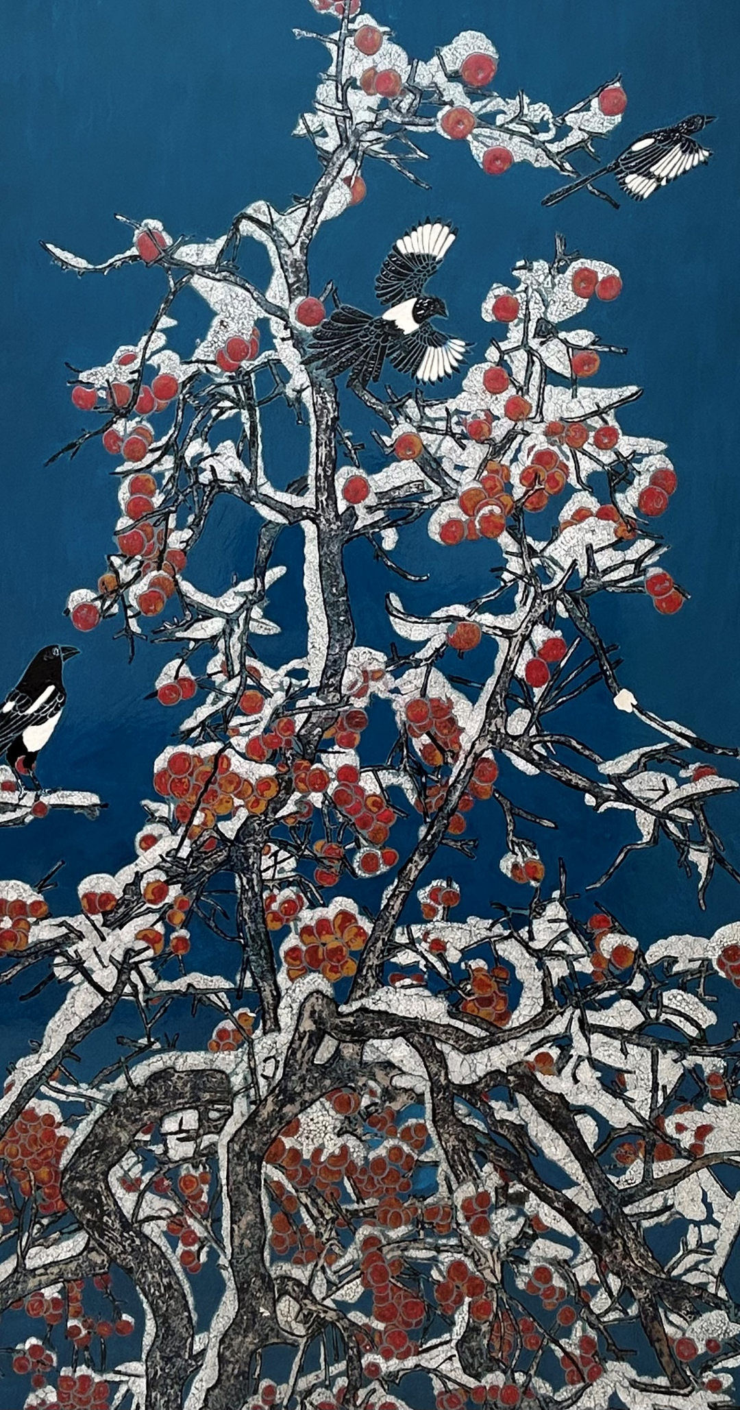在《幸福生活——取快递的女人们》中,女人们的衣着色彩并非传统的淡彩平涂,而是如霞光流转,绯红、明黄、靛蓝等饱和度较高的颜色交织碰撞,通过精妙的过渡与呼应,达到了“浓而不艳、艳而不俗”的视觉效果,既烘托出当代生活的鲜活气息与节奏感,又保持了画面的整体和谐与高级感。《春晓》中的花卉,花瓣在工笔的精细轮廓内,呈现出油画般的色彩张力与光影过渡,露珠晶莹剔透,折射出斑斓的光影,然而整体的气韵依然清雅灵动,不失东方美学的含蓄与婉约。 这种“以传统笔墨为骨,以西方色彩为韵”的大胆创新,绝非简单嫁接,而是两种艺术体系在理解与消化后的创造性融合。它既保留并强化了工笔画精微细腻的东方美学特质与书写性韵味,又注入了符合当代视觉经验的色彩活力与空间表现力,从而实现了古典精神与现代审美需求的完美交融。丁德发以此证明了,传统的生命力正在于其与时俱进的开放与包容。