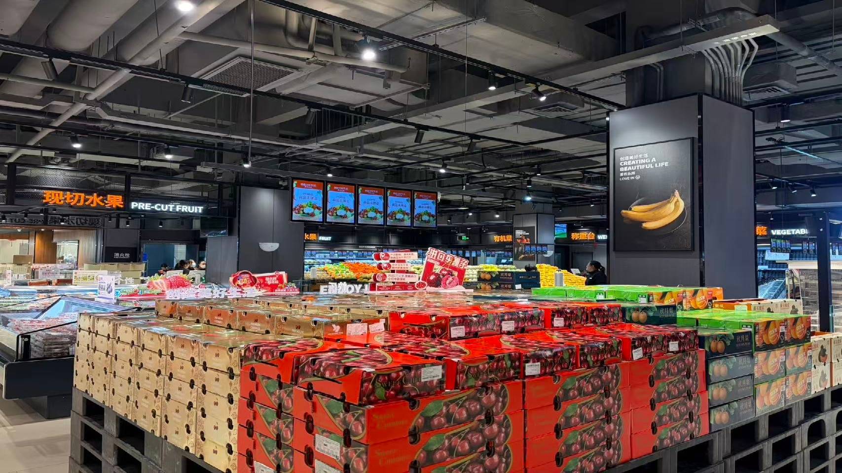 在保障民生基本需求的基础上,生鲜板块大幅增加了中高端与特色品质商品的供给。水果区在引入海鸥岛无花果、番石榴、杨桃、橄榄等本地岭南鲜果的同时,也汇聚了云南高山蓝莓、红颜草莓、赣南脐橙、新疆天山雪梨等全国地标性风味。其中,门店主推的车厘子从智利产区直采后,立即预冷锁鲜,采用专用保鲜包装与0-2℃全程冷链海运,确保跨越重洋后依然保持采摘时的鲜活口感和饱满风味。 蔬菜区则推出了有机蔬菜、定向种植蔬菜、霜打菜、苗苗菜等多个品质系列。同时,结合传统时令饮食文化,特别策划冬季“菌菇滋补”主题,通过精心设计的商品陈列与文化标签,为顾客在寒冬中带来暖意融融的食补体验。
