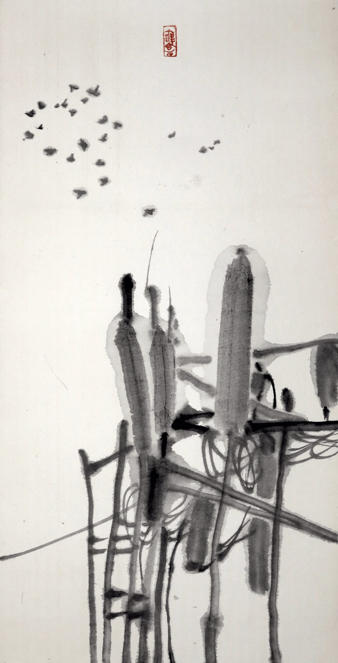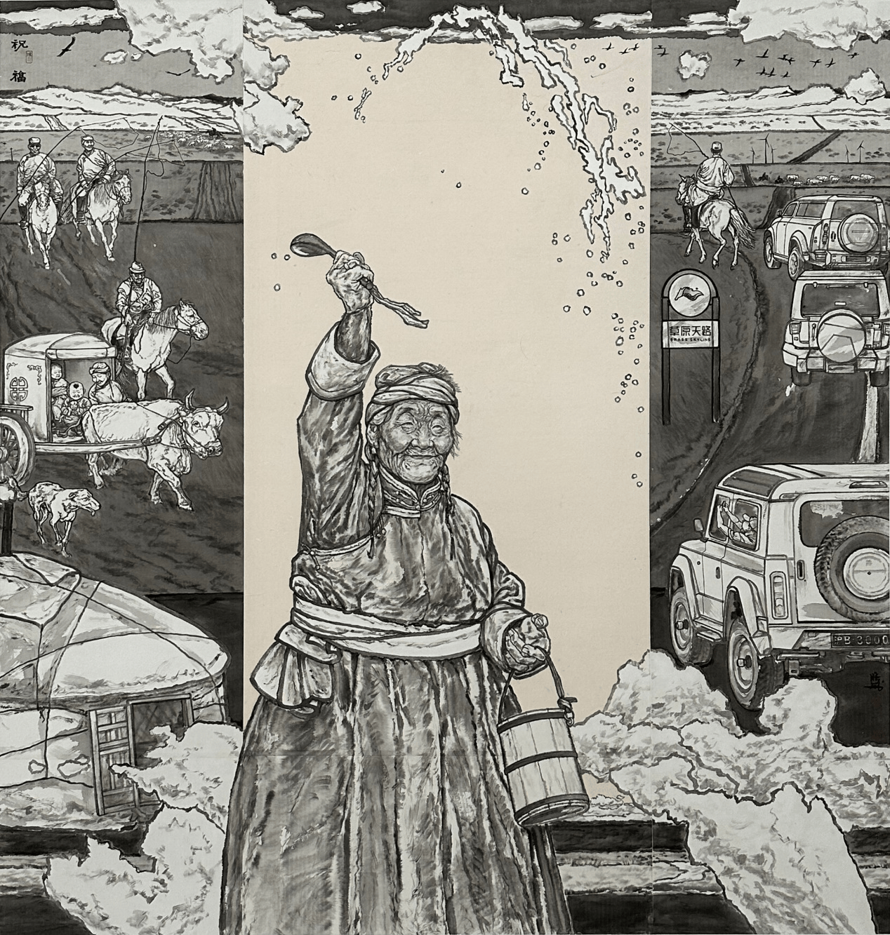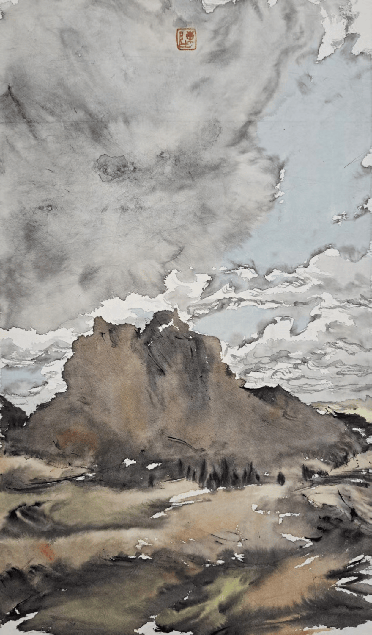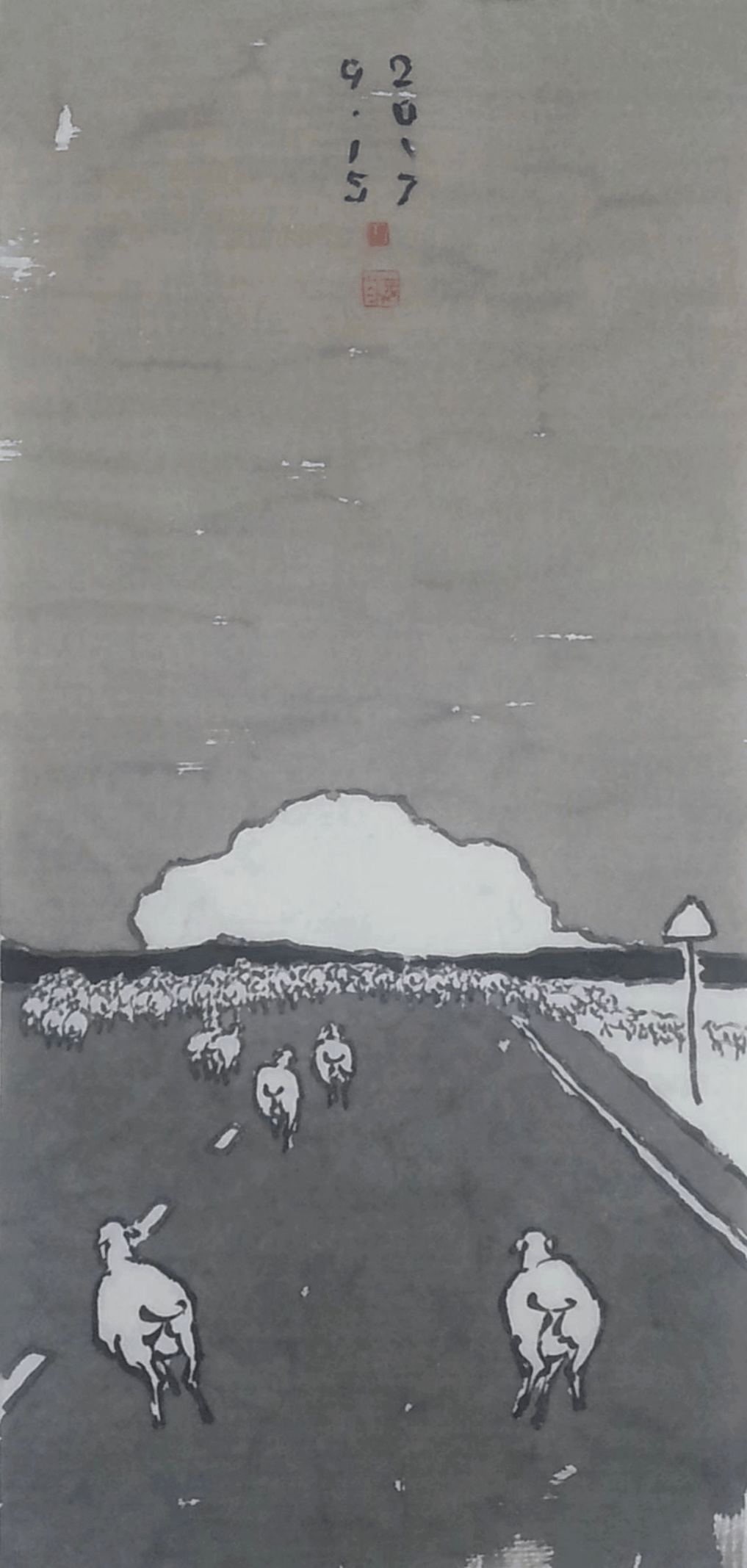 其次,他在草原风景这一题材中试图探索水墨的另一种可能性:草原山水画的特有图式。他将自己得自草原的自由心境通过无拘无束的水与墨的自由幻化来完成他对“草原山水”的构想。与此同时,他也敏感到现实生活的微妙变化,并通过“即景”式的“小品”方式表达出来,虽然都是些小情小景,但却饱含着时代的气息和对形式的敏感,如《安防》、《东方路桥日记》、《故居》、《归巢》等,既保留了水墨语言的特有趣味,也见证了作为一个当代画家其艺术与自身所处的时代和社会生活之间应有的密切关系。