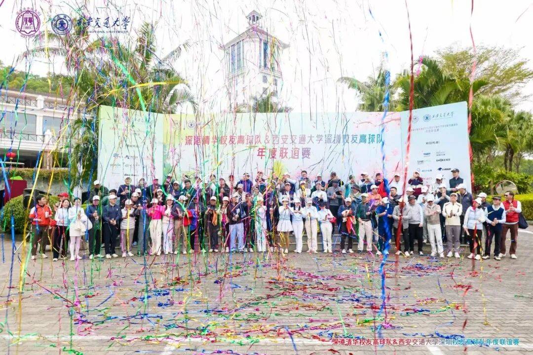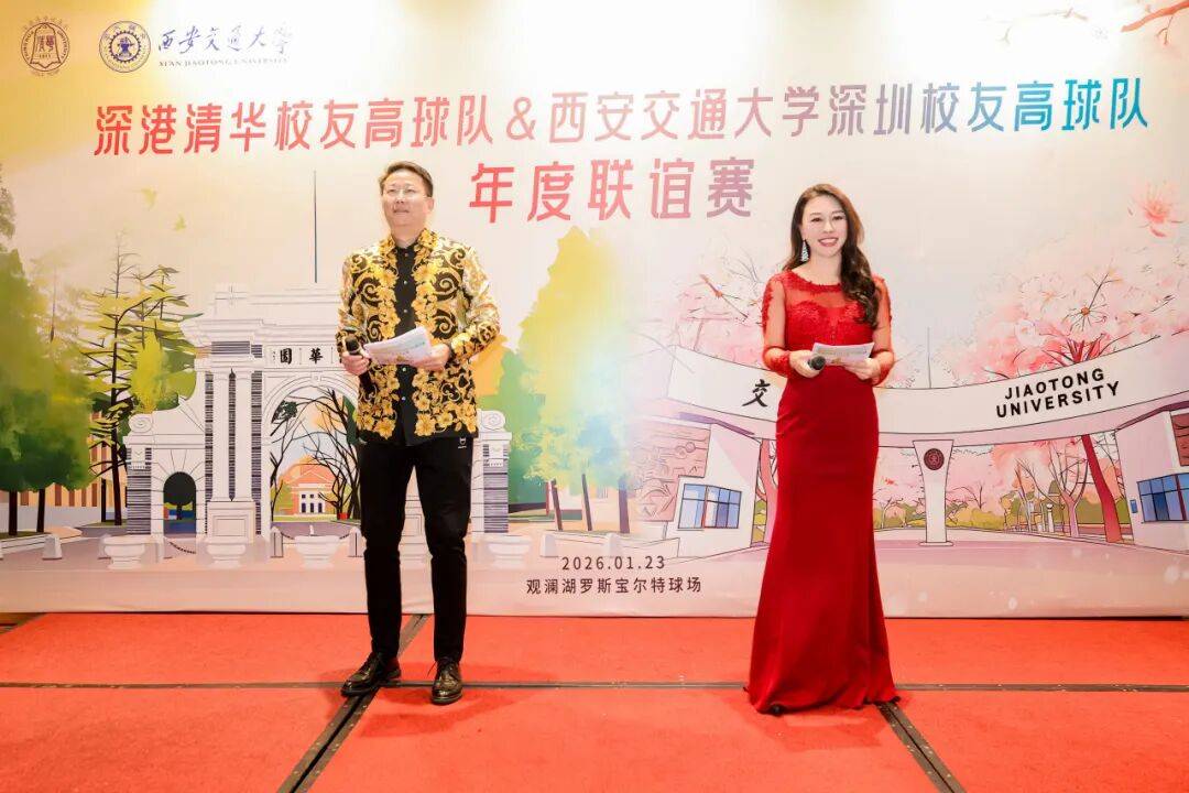 礼炮鸣新程,挥杆启华章。随着深港清华校友高球队秘书长游振海热情洋溢的开场主持,本次联谊赛开球仪式正式拉开帷幕。深港清华、西安交大深圳校友高球队队友依次列队入场,步伐矫健整齐,身姿神采奕奕,将两校校友自信昂扬的风采展现得淋漓尽致。 队员们有序驻足背景板前合影留念,定格这份跨越校界的相聚时刻。随后,两句铿锵有力的口号响彻观澜湖球会上空——“深港清华欢乐一家”彰显同窗温情,“交大交大,共赢天下”尽显奋进担当。礼炮齐鸣贺新岁,欢声笑语迎2026,在轰鸣声响与真挚祝福中,这场融合文脉与竞技的联谊赛,正式拉开璀璨序幕!