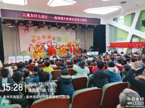 12月19日,在海陵区城中街道举办的宣传服务大集市及关爱儿童公益演出活动中,泰州市实验小学附属幼儿园多功能室内座无虚席,不少家长驻足门外观看拍照。现场气氛热烈,不时响起孩子们的欢呼与家长的掌声。