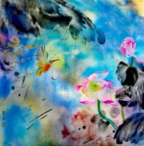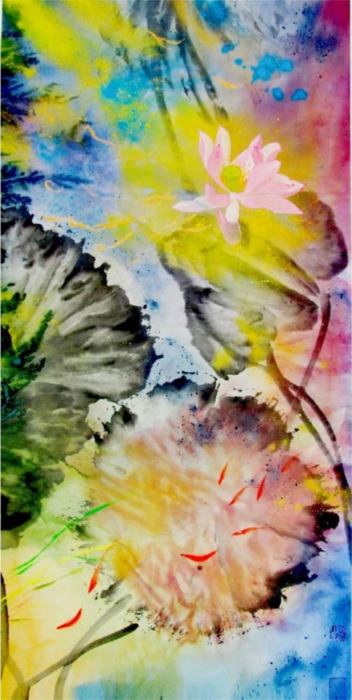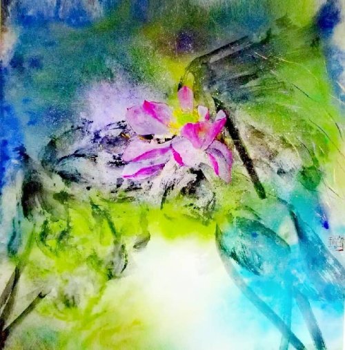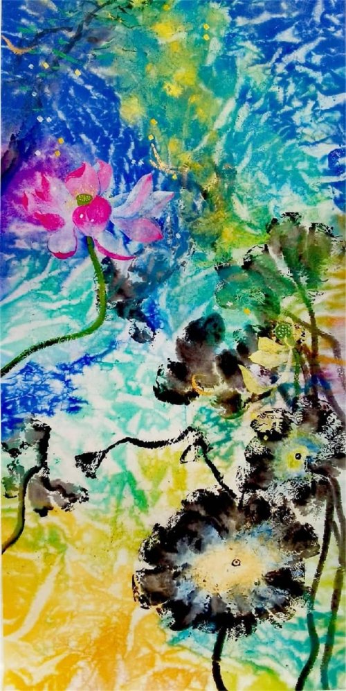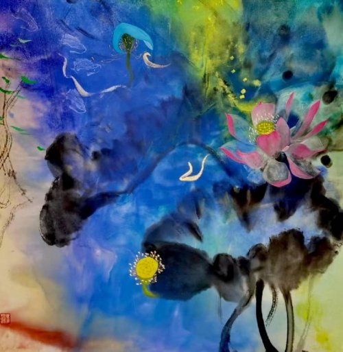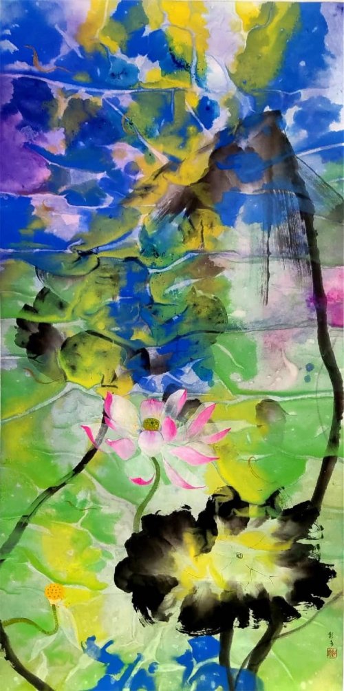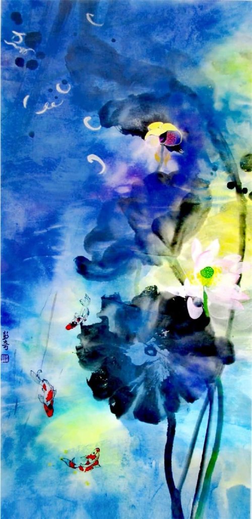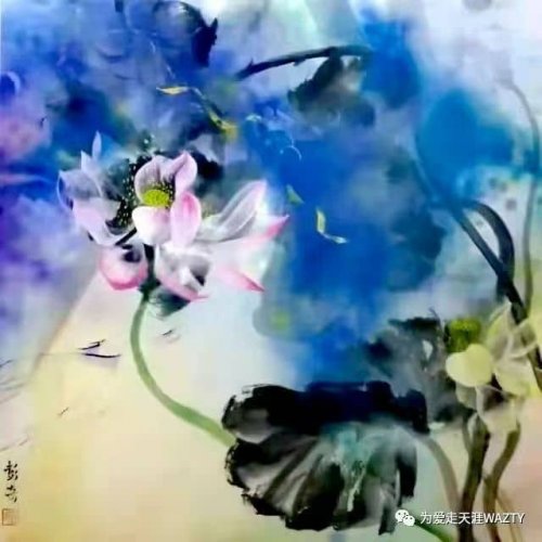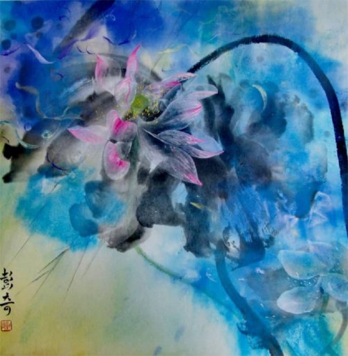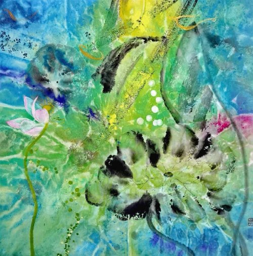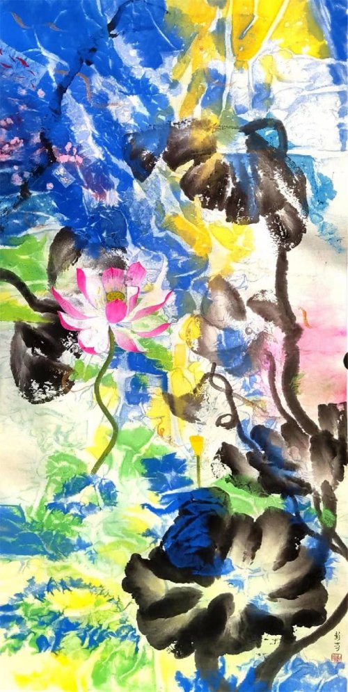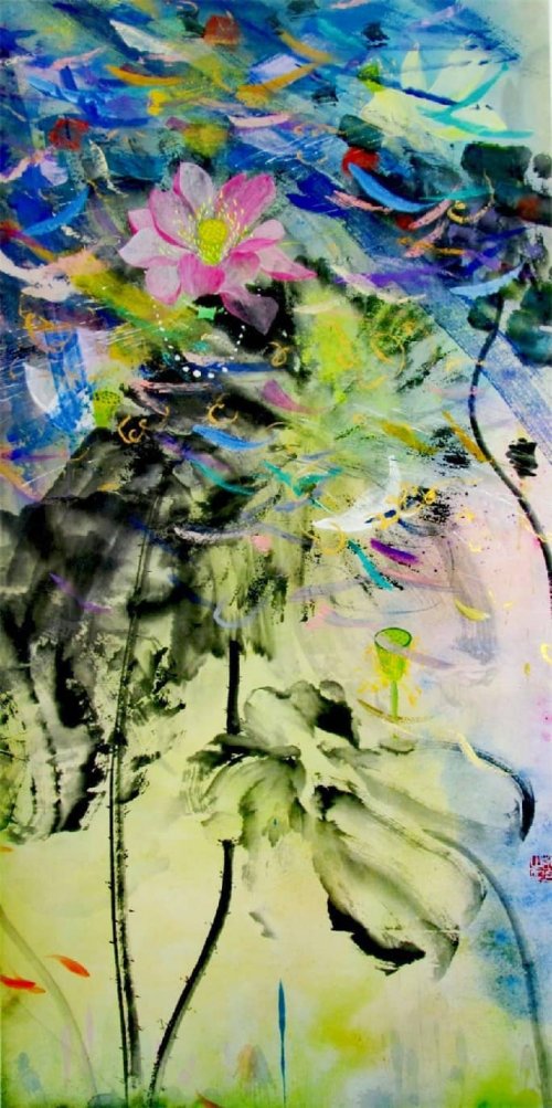 荷塘韵事 石齐老师评彭琦的画 彭琦的荷花有她的鬼主意,有自己的花招。鬼主意多,花招也很多。在泼墨,泼色的处理上她把握的很好,干湿浓淡,色彩搭配很协调。她玩命一样画她的色彩,而且是东方的色彩,这很好。彭琦的写意画都是很注意"S"形,很温柔,很讲情趣。弯弯的荷叶枝干,很有诗意,像一个短篇小说,像一个特写。 画面中很多很多工细的线,增加了欣赏的深度,弱线,飘线,硬线搭配都非常好,很有看头,还有很多像音乐一样的线。作为一个艺术家,要自信,要有自己的语言,有自己的新建,彭琦就做到了。她所有作品,一眼便知是彭琦。我平时总说一个画家要点亮自家灯火,彭琦便是点了自家灯火的。 石齐 2023年3月10日 (中央电视台10频道采访石齐老师评画)