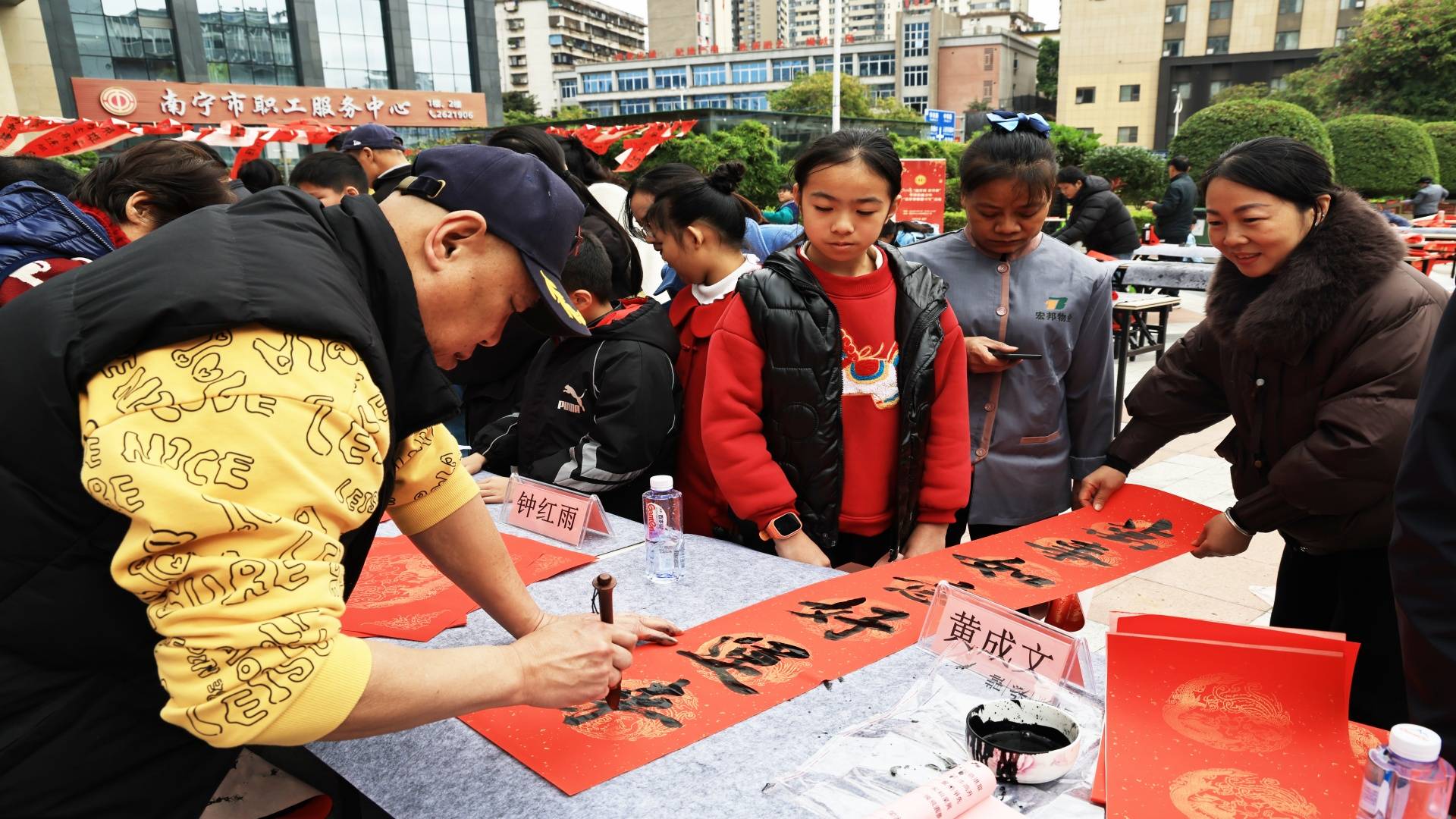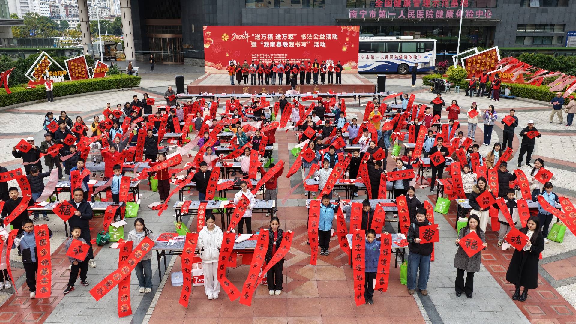2026年1月30日,由南宁市总工会、南宁市文学艺术界联合会联合主办的2026年“送万福 进万家”书法公益活动暨“我家春联我书写”活动在南宁市工人文化宫热闹开展。广西知名书法家与南宁市少年儿童“书法成长课堂”学员同台挥毫,以红笺墨韵传递新春祝福,为邕城注入浓浓年味与文化温情。