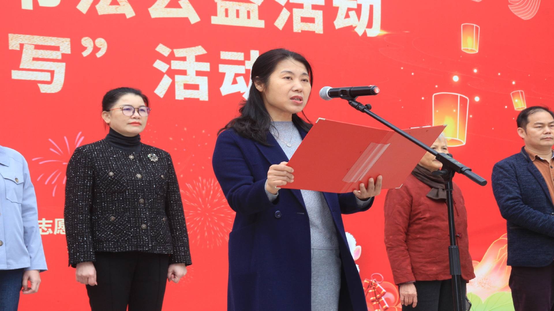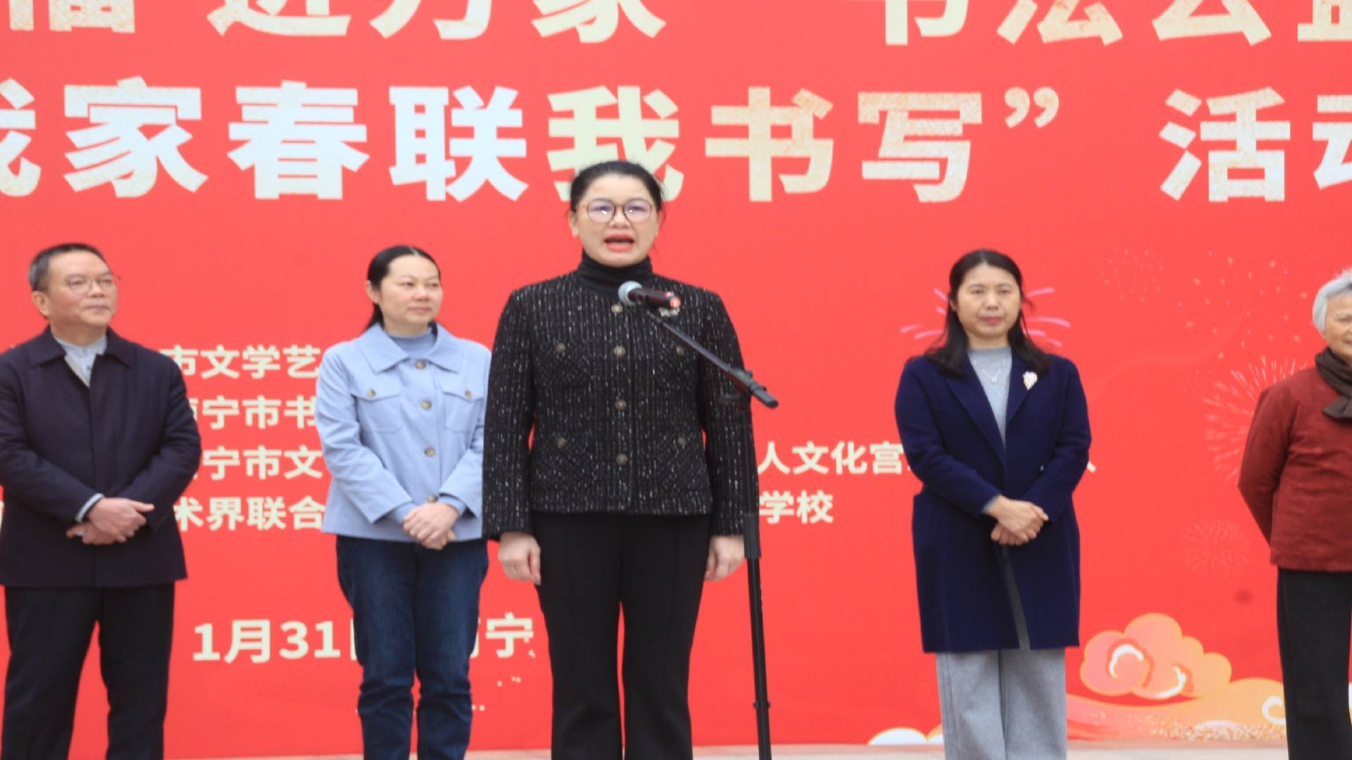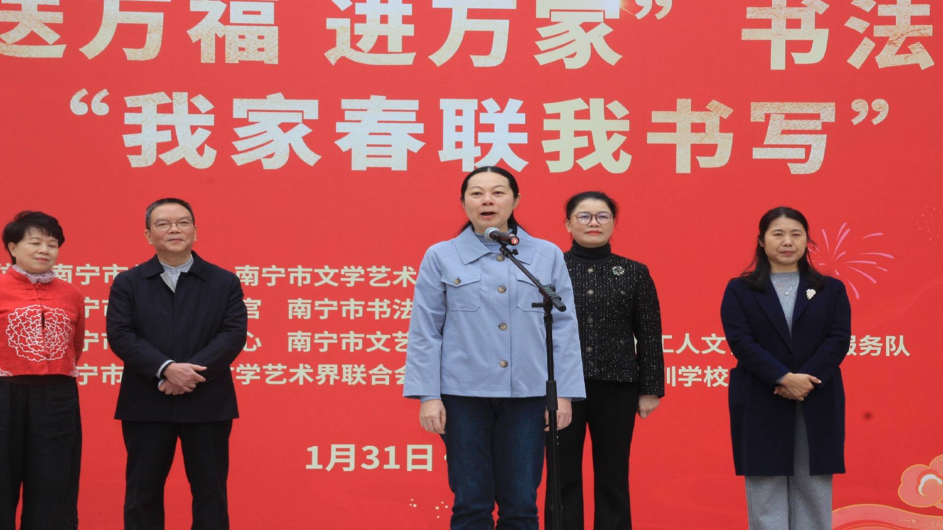 南宁市工人文化宫主任邓丽芬在致辞中表示,今日11位书法大家与近百名学员挥毫送福,正是文化惠民的生动实践,并提出两点希望:干部职工以十年为基策马扬鞭,创新服务擦亮“工字招牌”;书法学员以笔墨为媒薪火相传,融壮乡风情与时代精神,让书法绽放光芒。