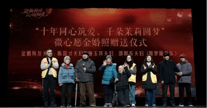 第三篇章“爱聚星光·心音共鸣”将晚会推向情感的高潮。曾三次登上央视的蔡欣妍小朋友,以古筝独奏《山丹丹花开红艳艳》展现专业水准与生命活力;吴平欣与邱奕昂合唱的《明天,你好》唱出对未来的勇气与憧憬。最动人的环节莫过于“十年同心筑爱,千朵茉莉圆梦”微心愿金婚拍摄仪式。三对金婚残友夫妇——陈国才夫妇、施玉其夫妇、邵跟东夫妇携手登台,在温馨的仪式中接受相框赠送,陈国才先生的真情分享,让在场观众无不为之动容。随后,主持人陈慧姣(盲人朋友)献上的诗朗诵《致橡树》,诠释了平等独立、深情相依的爱情真谛。