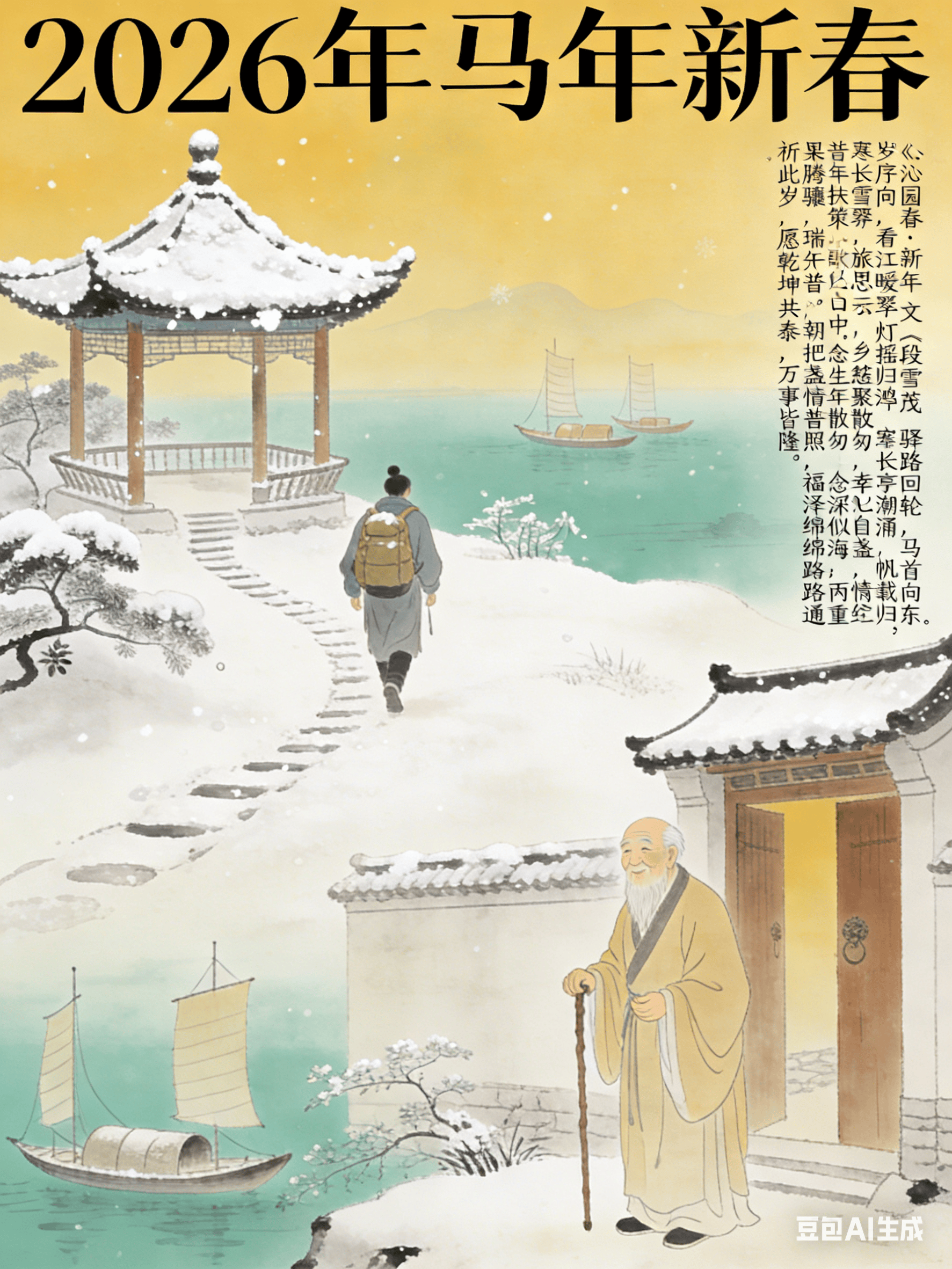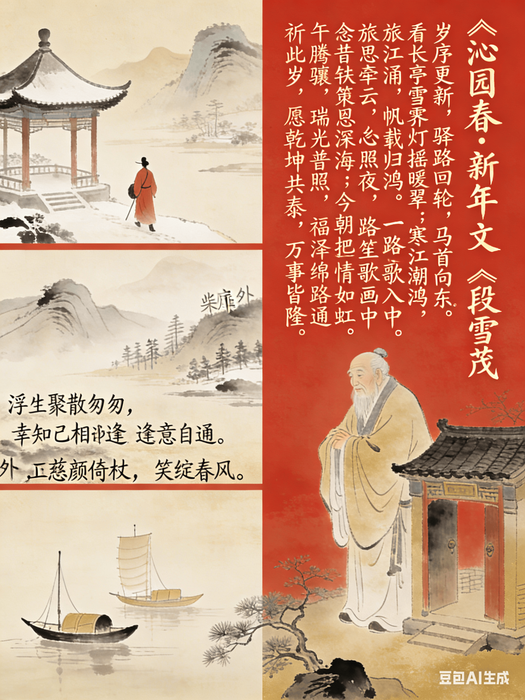 文/段雪茂 岁序更新,驿路回轮,马首向东。 看长亭雪霁,灯摇暖翠;寒江潮涌,帆载归鸿。 旅思牵云,乡心照夜,一路笙歌入画中。 柴扉外,正慈颜倚杖,笑绽春风。