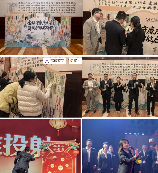 火树银花逢盛世,清风正气庆元宵。为深入推进“廉润中行”清廉金融文化建设,2026年3月2日,中国银行义乌市分行精心策划举办“金龙守廉庆元宵,清风护航起新程”主题活动,以别开生面的形式,为全行干部员工送上一份兼具文化韵味与廉洁深意的节日“大餐”。 “一枚书签,一份廉洁承诺。”设计精美的廉洁书签上,“清风沐心”“廉洁从业”等字样搭配水墨竹韵等图案,既是节日礼物,更是廉润中行的生动载体。党委书记陈剑叮嘱大家要以书签为伴,把廉洁理念融入日常工作与生活,让清廉之风常伴左右,让廉洁自律成为行动自觉。 趣味盎然的“知廉意·击贪腐”击球游戏,更是将活动推向高潮。游戏将廉洁知识与竞技乐趣巧妙结合,参与者瞄准“贪腐”目标精准击球,直观感受“拒腐蚀、永不沾”的纪律要求,在互动体验中深化对廉润中行的理解认同,让廉洁教育从“纸上”走到“身边”。