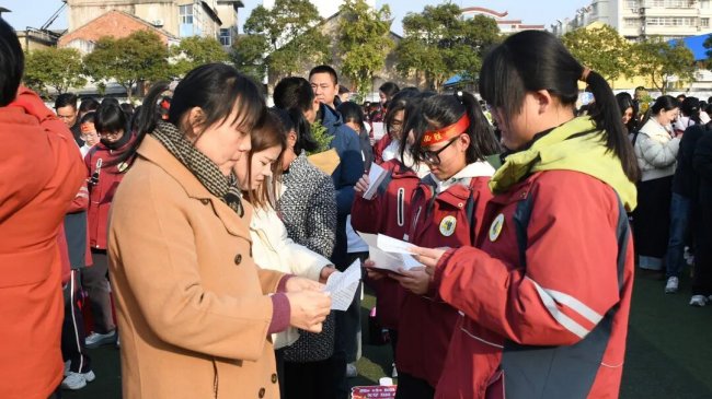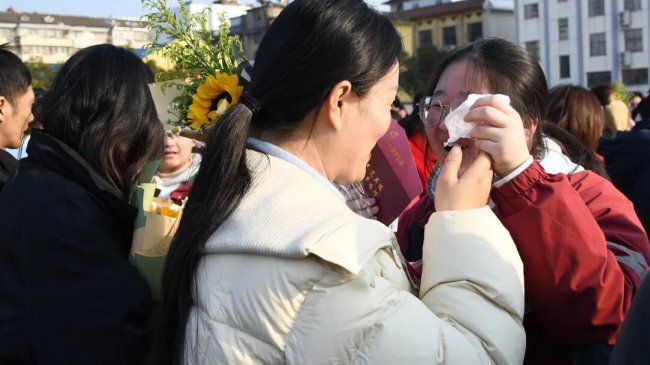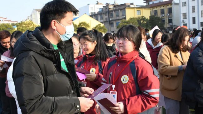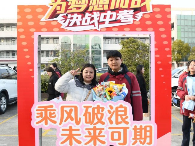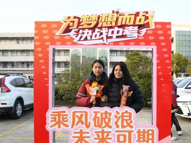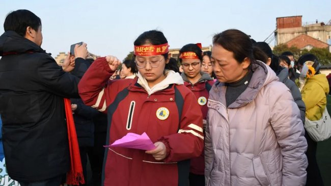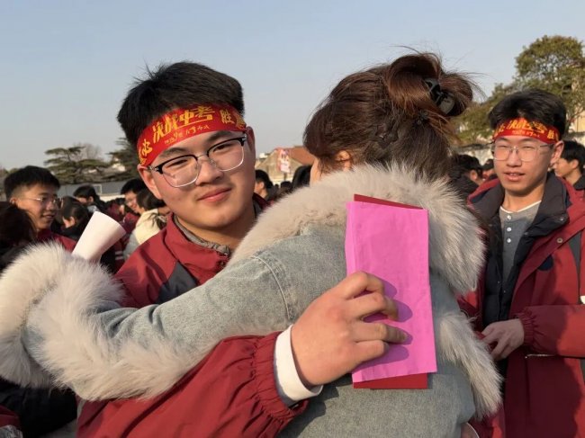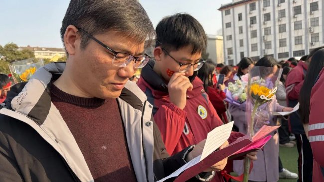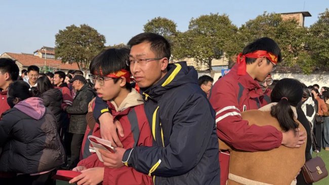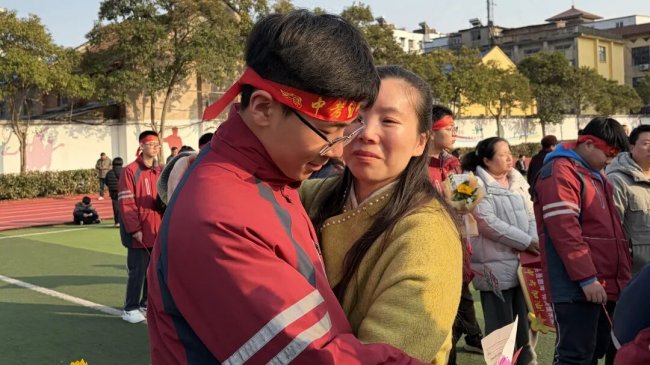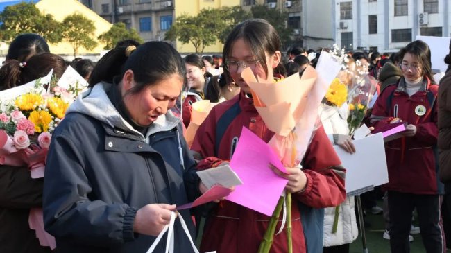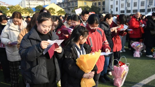 在互动环节,家长和孩子互致书信、礼物,互诉衷肠。读信时、读信后,那些拥抱、依偎、泪花、泪水都是青春协奏曲的美妙音符。随后,家长们亲手为孩子们佩戴上写有“中考必胜”的红色腕带,并给予一个温暖的拥抱,一句深情的“爸妈挺你”,让现场温情涌动,家校共育的力量在此刻静静流淌,凝聚成学子们冲刺路上最温暖的光。