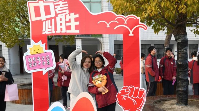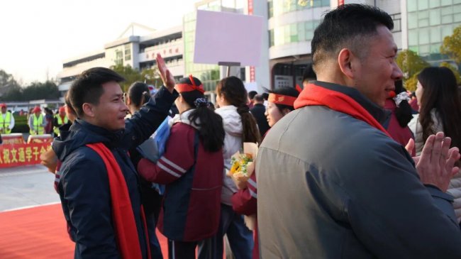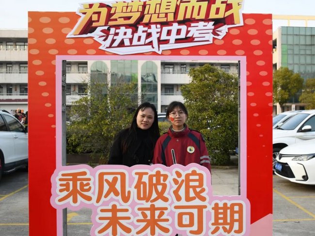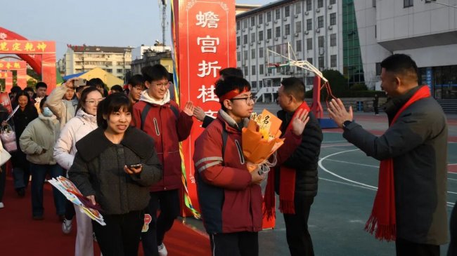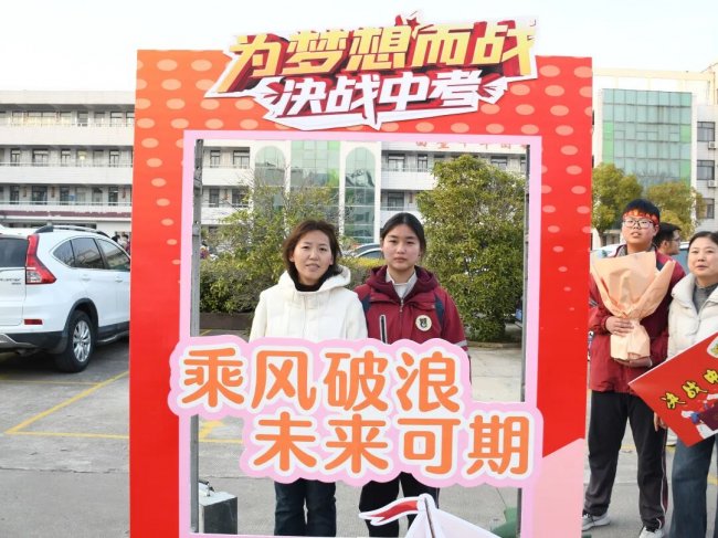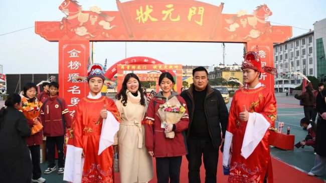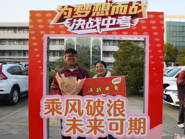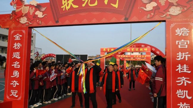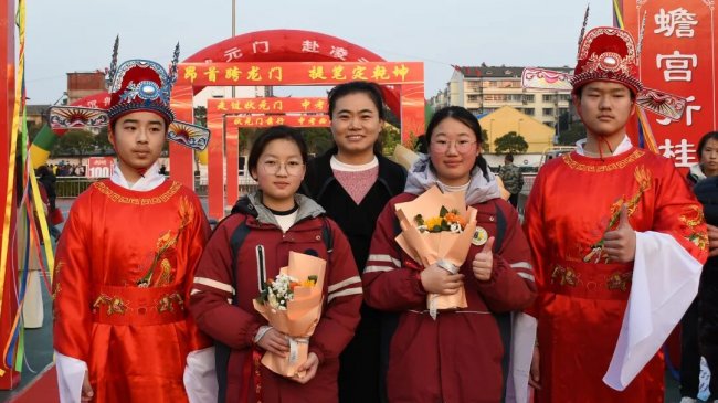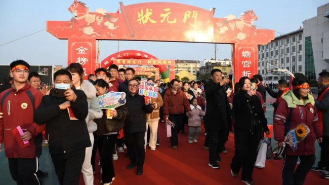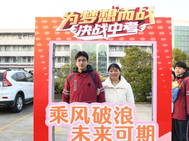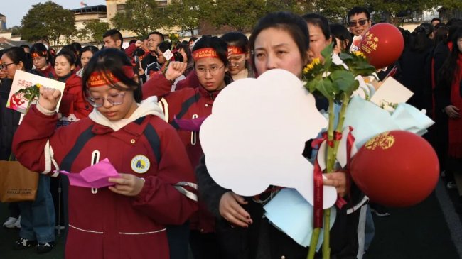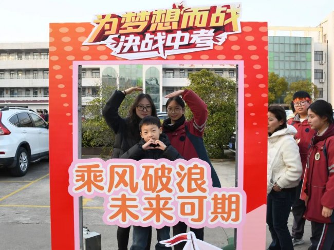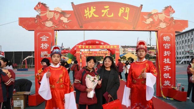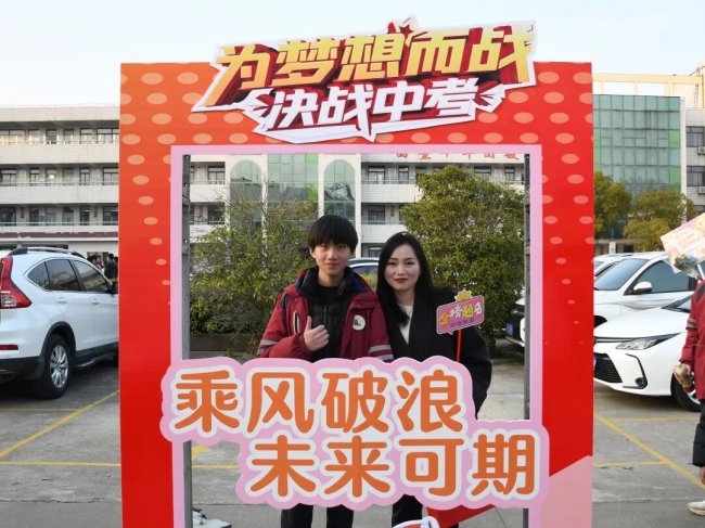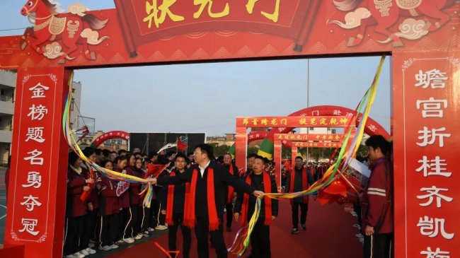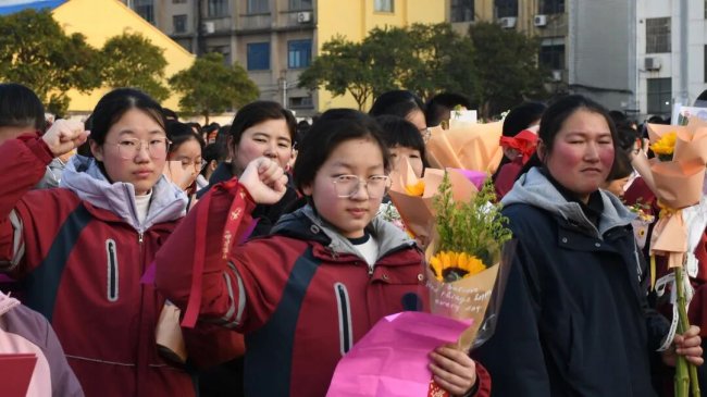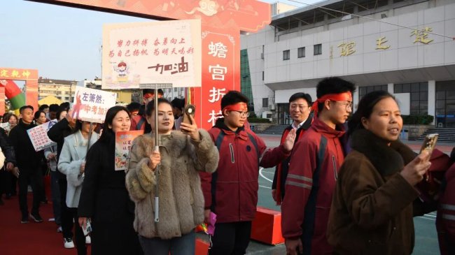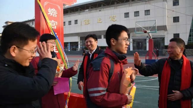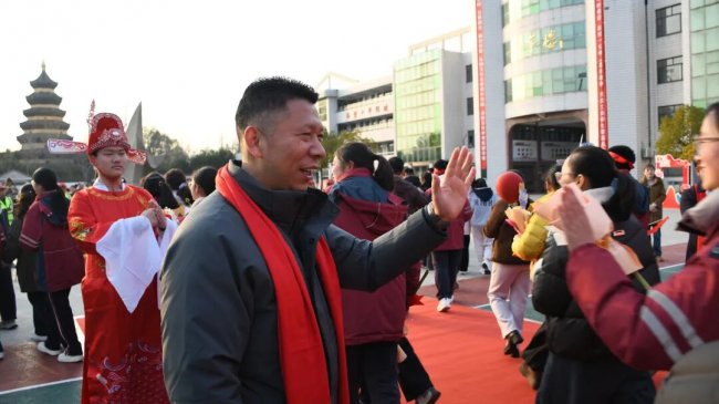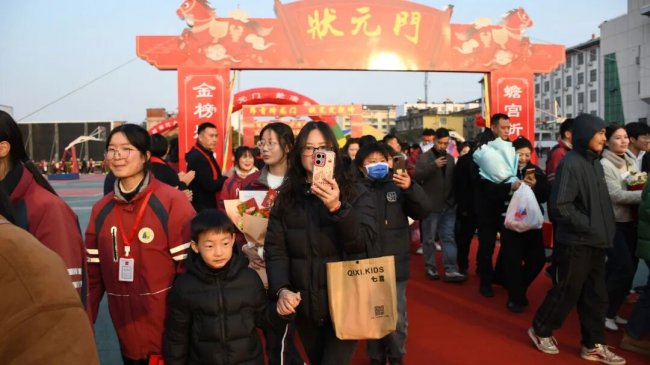 随后,初三两部学子与家长在班主任的带领下,依次迈步红毯,自信满怀、斗志昂扬。老师们与初二学弟学妹分列两侧,以热烈的掌声、激昂的加油声与振奋的战鼓,用温暖的笑容与期盼的目光,为初三学子送上最真挚的祝福,祝愿他们金榜题名、蟾宫折桂。