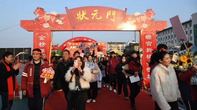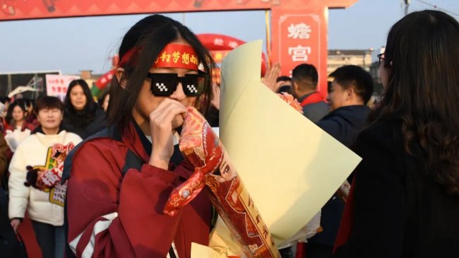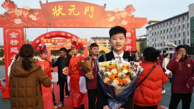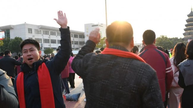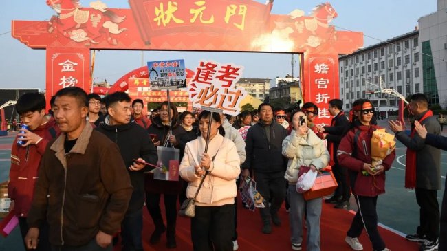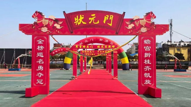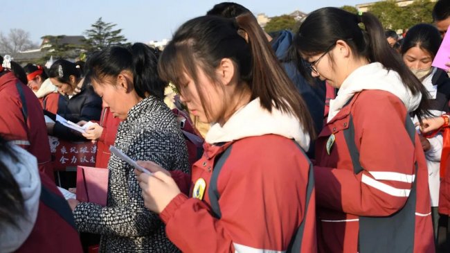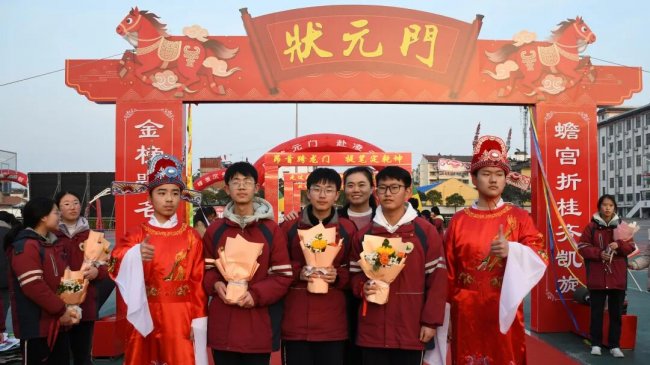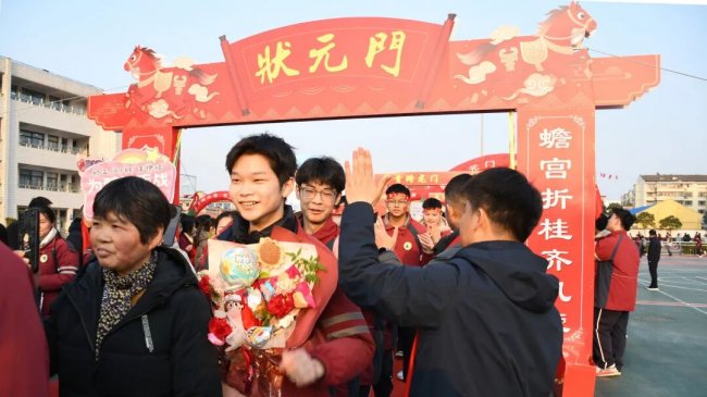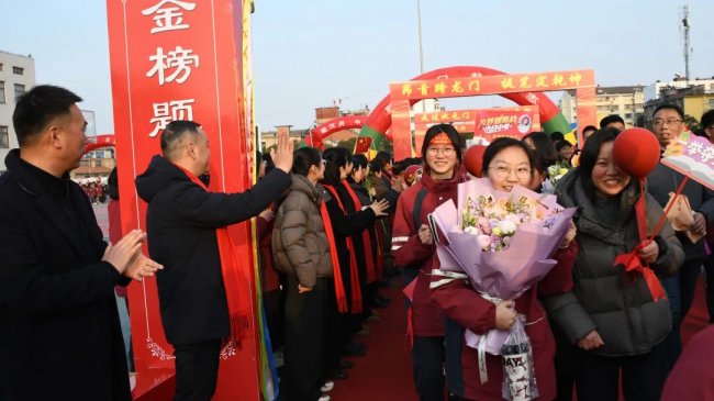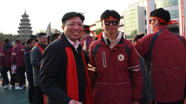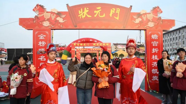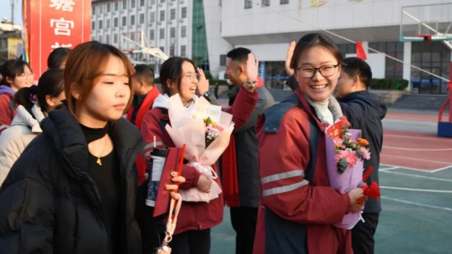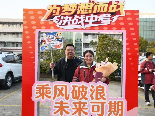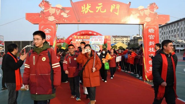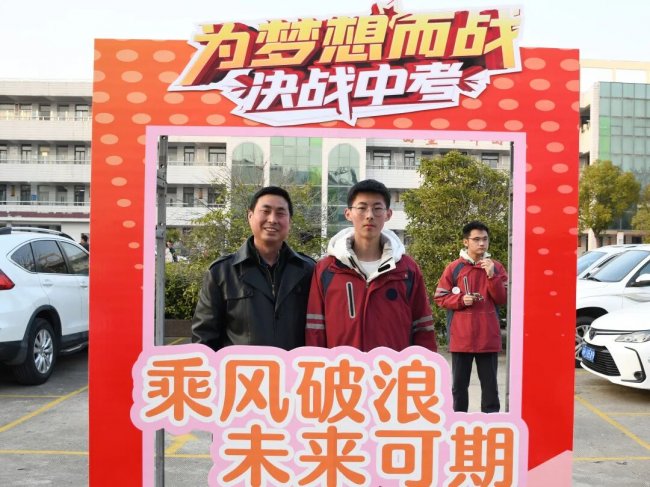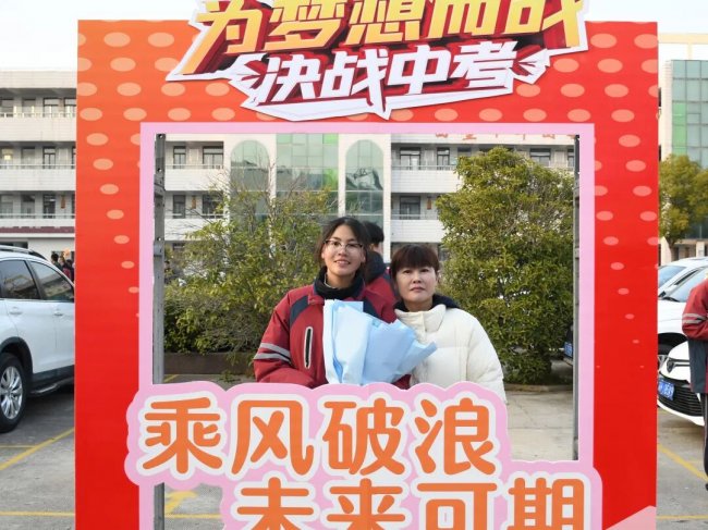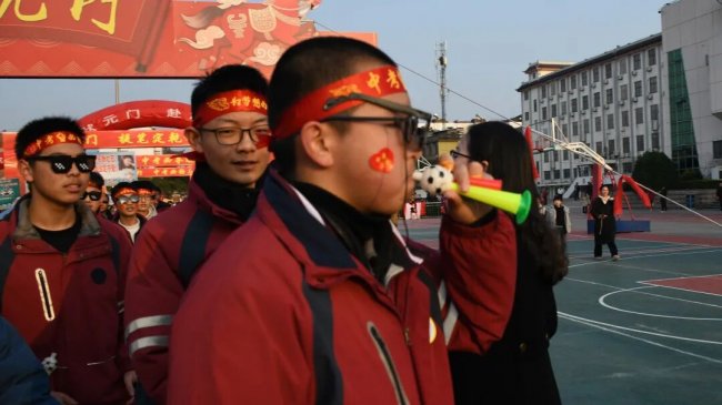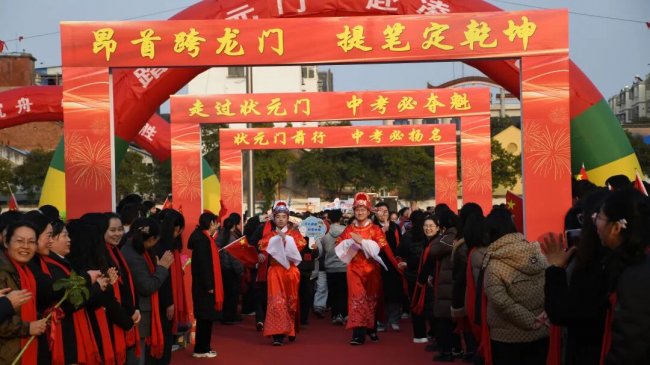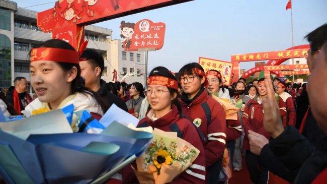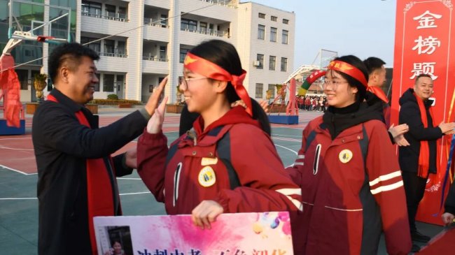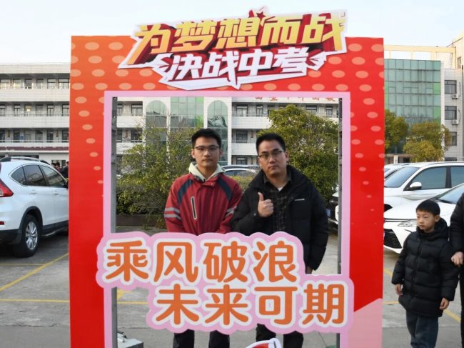 随后,初三两部学子与家长在班主任的带领下,依次迈步红毯,自信满怀、斗志昂扬。老师们与初二学弟学妹分列两侧,以热烈的掌声、激昂的加油声与振奋的战鼓,用温暖的笑容与期盼的目光,为初三学子送上最真挚的祝福,祝愿他们金榜题名、蟾宫折桂。