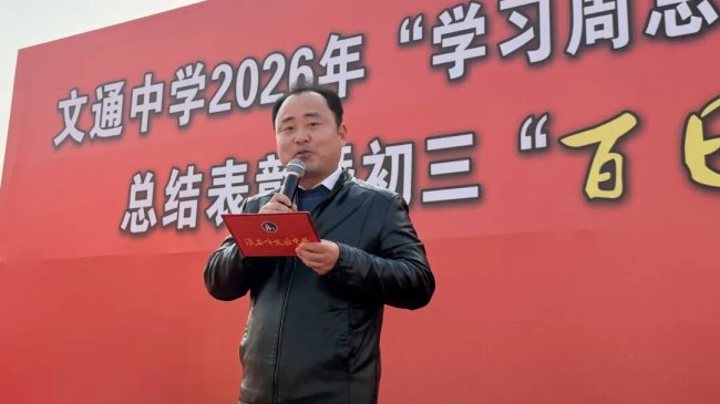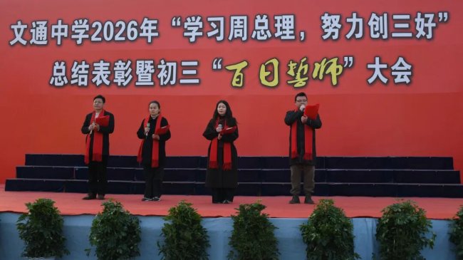 海棠依旧,风范千秋;伟绩长存,光耀春秋。今年3月5日是周恩来总理诞辰128周年纪念日,为传承伟人精神、勇担育人使命,表彰“学习周总理,努力创三好”活动中涌现的先进典型,同时凝聚初三师生迎战中考的磅礴力量,激发备考热情,3月8日下午,淮安市文通中学举行2026年“学习周总理,努力创三好”总结表彰暨初三中考百日誓师大会。本次大会由校团委委员潘海波老师主持。
