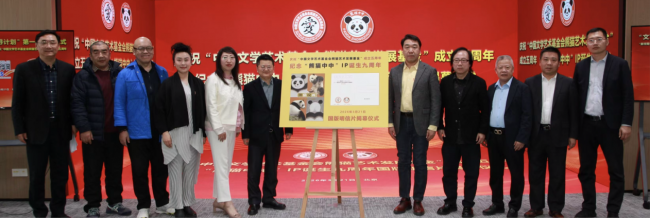 纪念“熊猫中中IP及品牌诞生九周年”暨庆祝“中国文学艺术基金会熊猫艺术发展基金”成立五周年国版明信片,及《熊猫中中IP形象及品牌诞生九周年》邮资机宣传戳揭幕仪式合影 与会嘉宾表示,本次活动集文化展示、新书发布与公益纪念于一体,既彰显了中国艺术的独特魅力,也让“熊猫中中”IP成为中外文化交流的温暖纽带。未来,熊猫艺术发展基金将继续以文化为媒,推动中华优秀传统文化创新传播,助力公益事业与国际文化交流走深走实。据悉,《熊猫说画—刘中的国宝情缘》由”北京工艺美术出版社”正式出版发行,中国著名美术评论家、中国文学艺术基金会熊猫艺术发展基金理事长王镛先生作序。