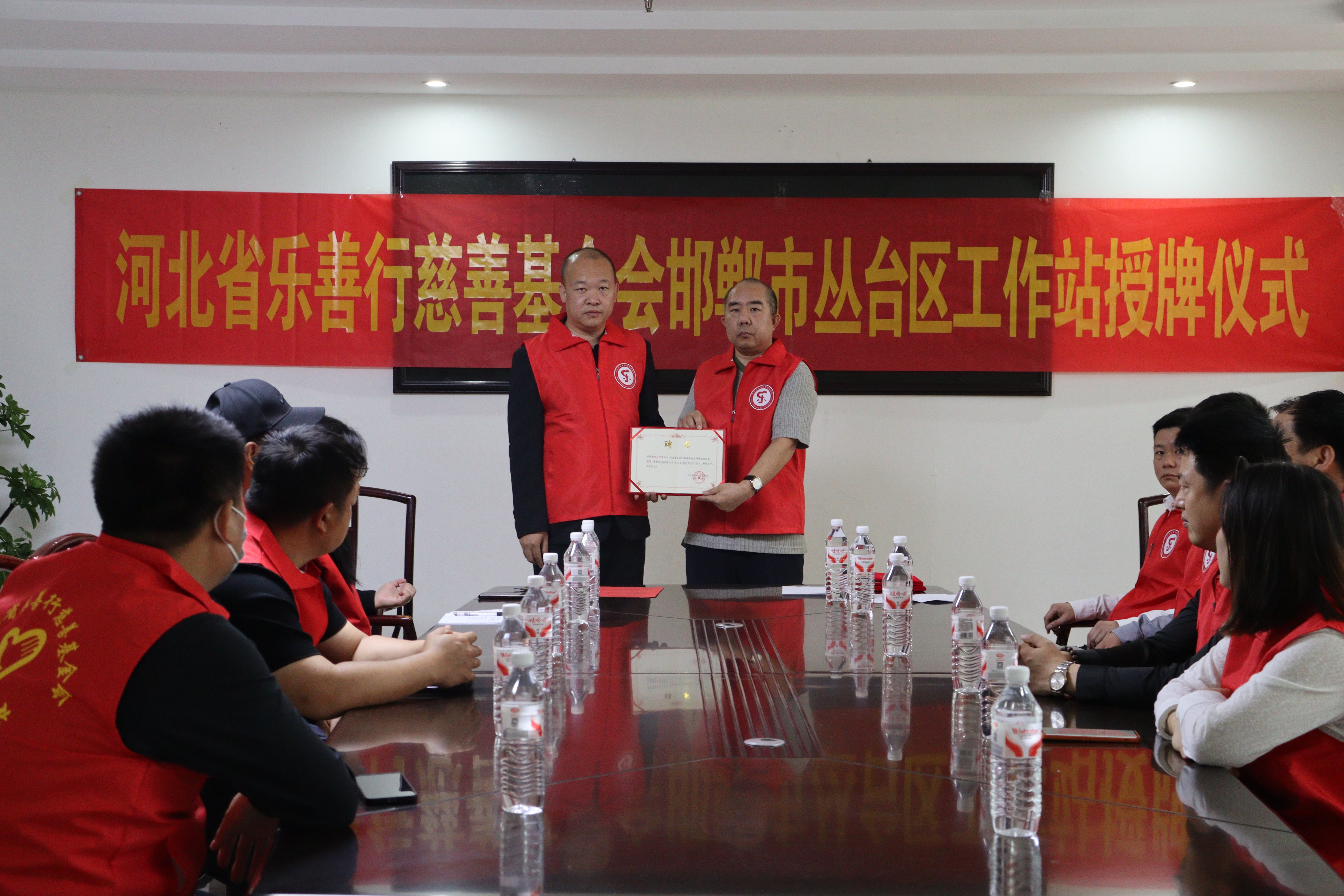 理事长左立飞向邯郸市丛台区工作站站长授予牌匾,工作站站长霍延涛郑重接牌。一块牌匾,承载着责任与期许,更是一份沉甸甸的承诺——未来,工作站将以牌匾为动力,扎根丛台、服务丛台,让慈善之花在邯郸这片大地绚烂绽放。