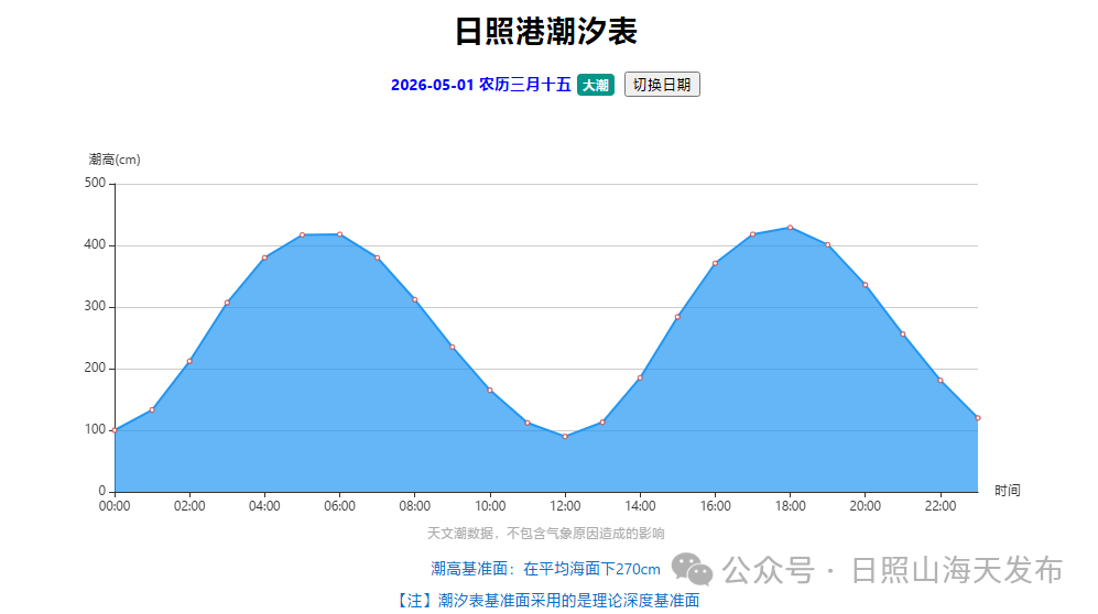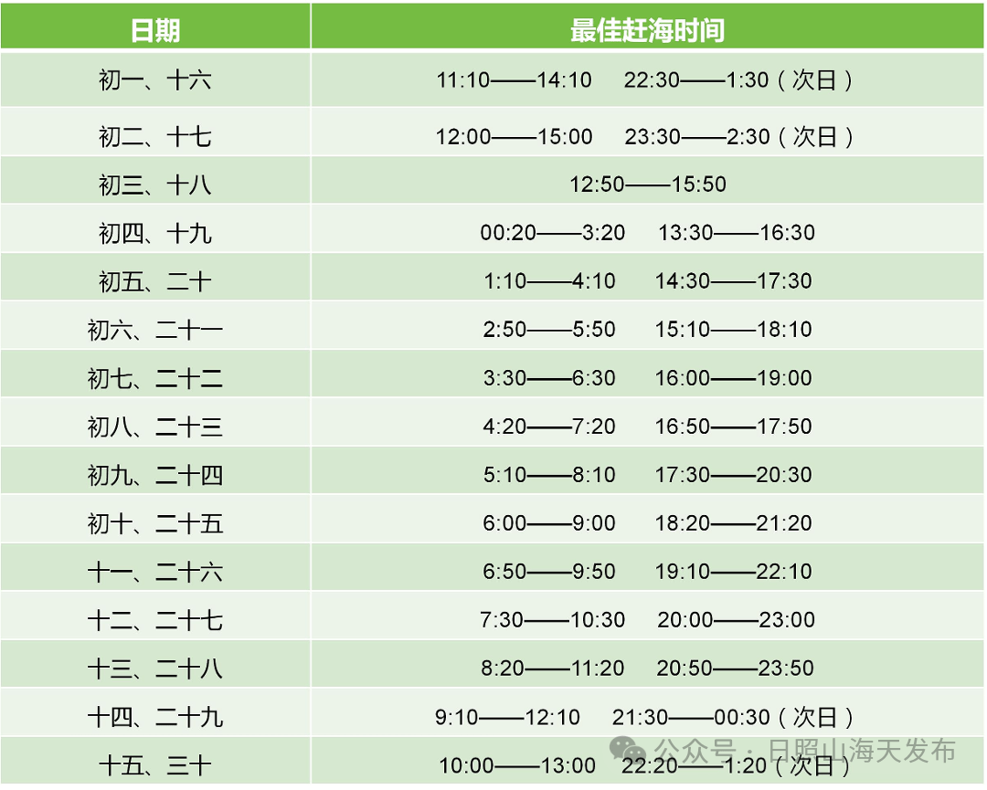 以2026年5月1日(农历三月十五,大潮)的日照港潮汐表为例: 横轴=时间:从00:00到23:00,对应一天24小时。 纵轴=潮高(cm):数值越低,潮水退得越远,赶海的滩涂就越开阔。 即在潮高为最低点时所对应的时间点前2-3小时为最佳赶海时间,最低点之后数值开始升高,此时正值涨潮期,也可赶海1-2小时,但应时刻关注潮水变化,注意自身安全。 为了省去大家研究潮汐表的时间,小编在这里直接整理好较佳赶海时间!