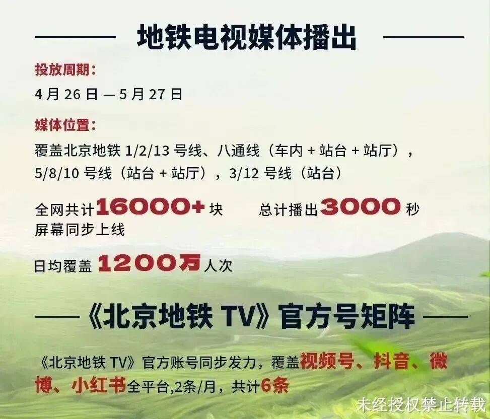 春风拂过黄海之滨, 日照绿茶迎来一年中最鲜爽的时刻 ——露天春茶正陆续采摘上市! 4月16日至5月27日, 日照绿茶集团让这一抹鲜绿 再度回归中央电视台, 在CCTV-1、13并机直播的《朝闻天下》栏目, 每日7时15分和8时15分黄金时段与全国观众见面。 以国家级平台的镜头, 向全国传递这份来自北方的春日茶礼。 与此同时, 日照绿茶也在北京地铁电视媒体 及《北京地铁TV》官方号矩阵精彩亮相。 覆盖北京地铁九条线路, 点亮共计16000+块数字屏幕, 日均覆盖1200万乘客! 让春日茶香“回响”在北京地铁的每寸空间。